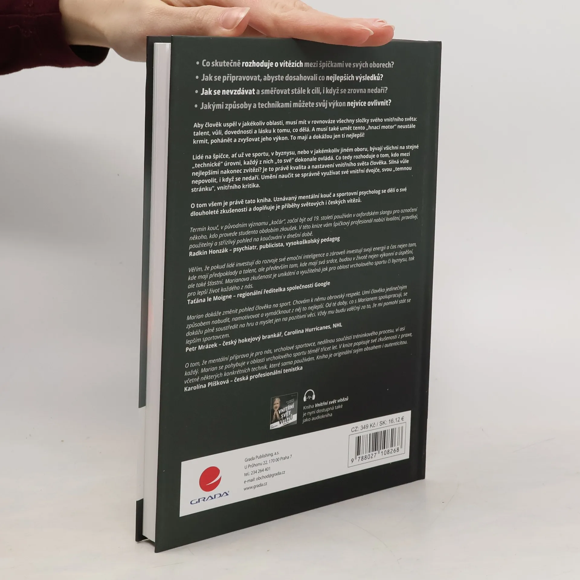 Co skutečně rozhoduje o vítězích mezi špičkami ve svých oborech? Jak se připravovat, abyste dosahovali co nejlepších výsledků? Jak se nevzdávat a směřovat stále k cíli, i když se zrovna nedaří? Jakými způsoby a technikami můžete svůj výkon nejvíce ovlivnit? Aby člověk uspěl v jakékoliv oblasti, musí mít v rovnováze všechny složky svého vnitřního světa: talent, vůli, dovednosti a lásku k tomu, co dělá. A musí také umět tento „hnací motor“ neustále krmit, pohánět a zvyšovat jeho výkon. To mají a dokážou jen ti nejlepší! Lidé na špičce, ať už ve sportu, v byznysu, nebo v jakémkoliv jiném oboru, bývají všichni na stejné „technické“ úrovni, každý z nich „to své“ dokonale ovládá. Co tedy rozhoduje o tom, kdo mezi nejlepšími nakonec zvítězí? Je to právě kvalita a nastavení vnitřního světa člověka. Silná vůle nepovolit, i když se nedaří. Umění naučit se správně využívat své vnitřní dvojče, svou „temnou stránku“, vnitřního kritika. O tom všem je právě tato kniha. Uznávaný mentální kouč a sportovní psycholog se dělí o své dlouholeté zkušenosti a doplňuje je příběhy světových i českých vítězů.