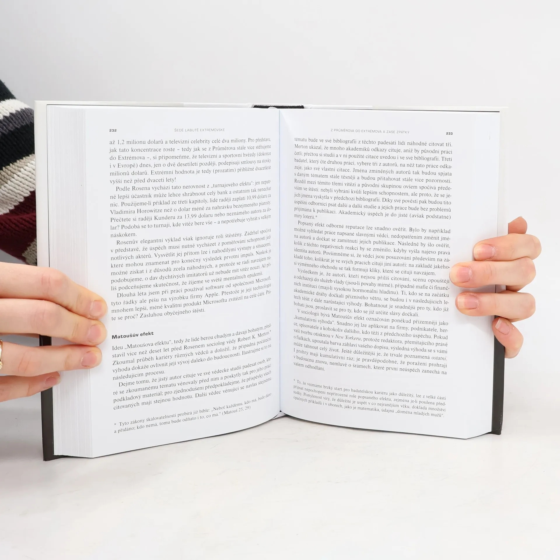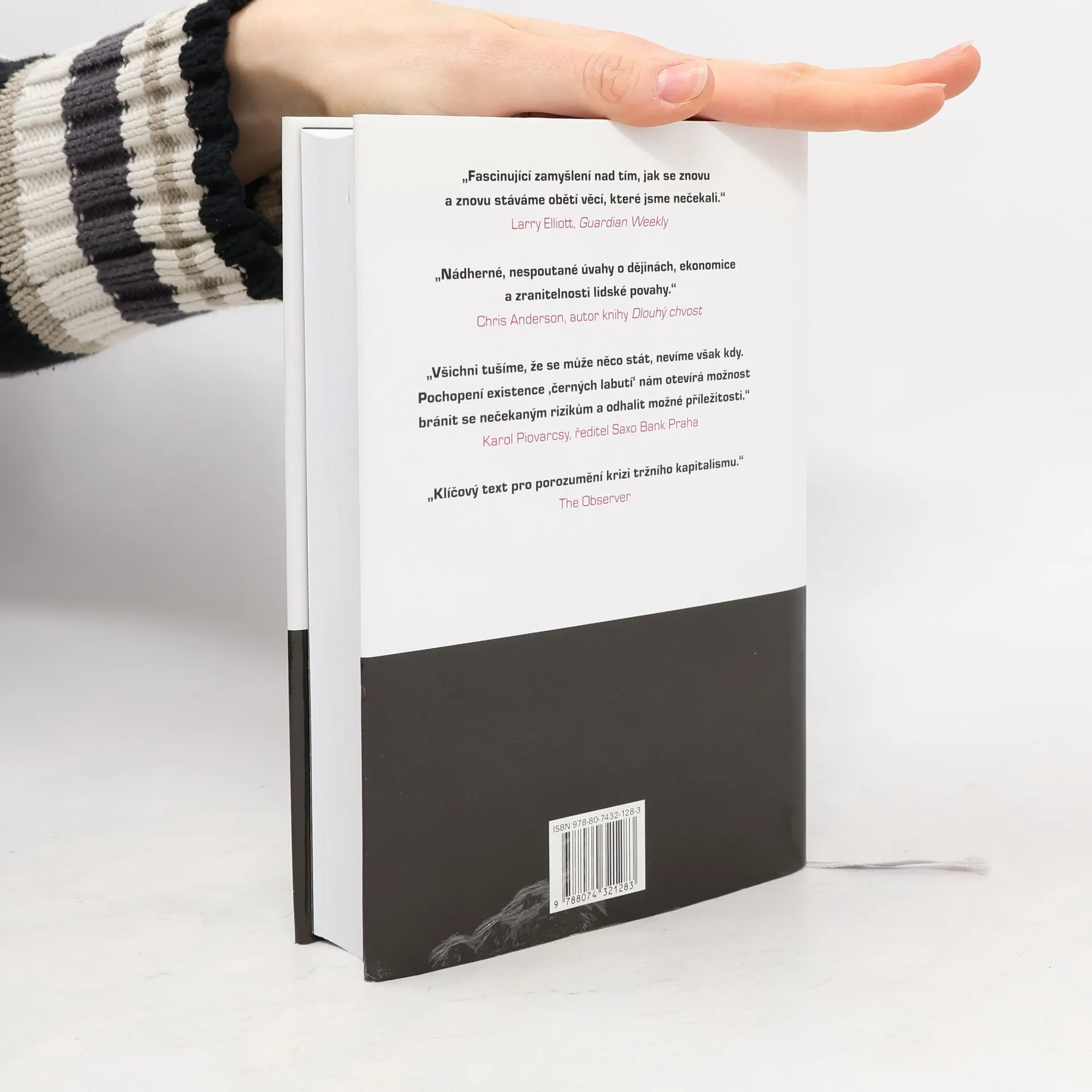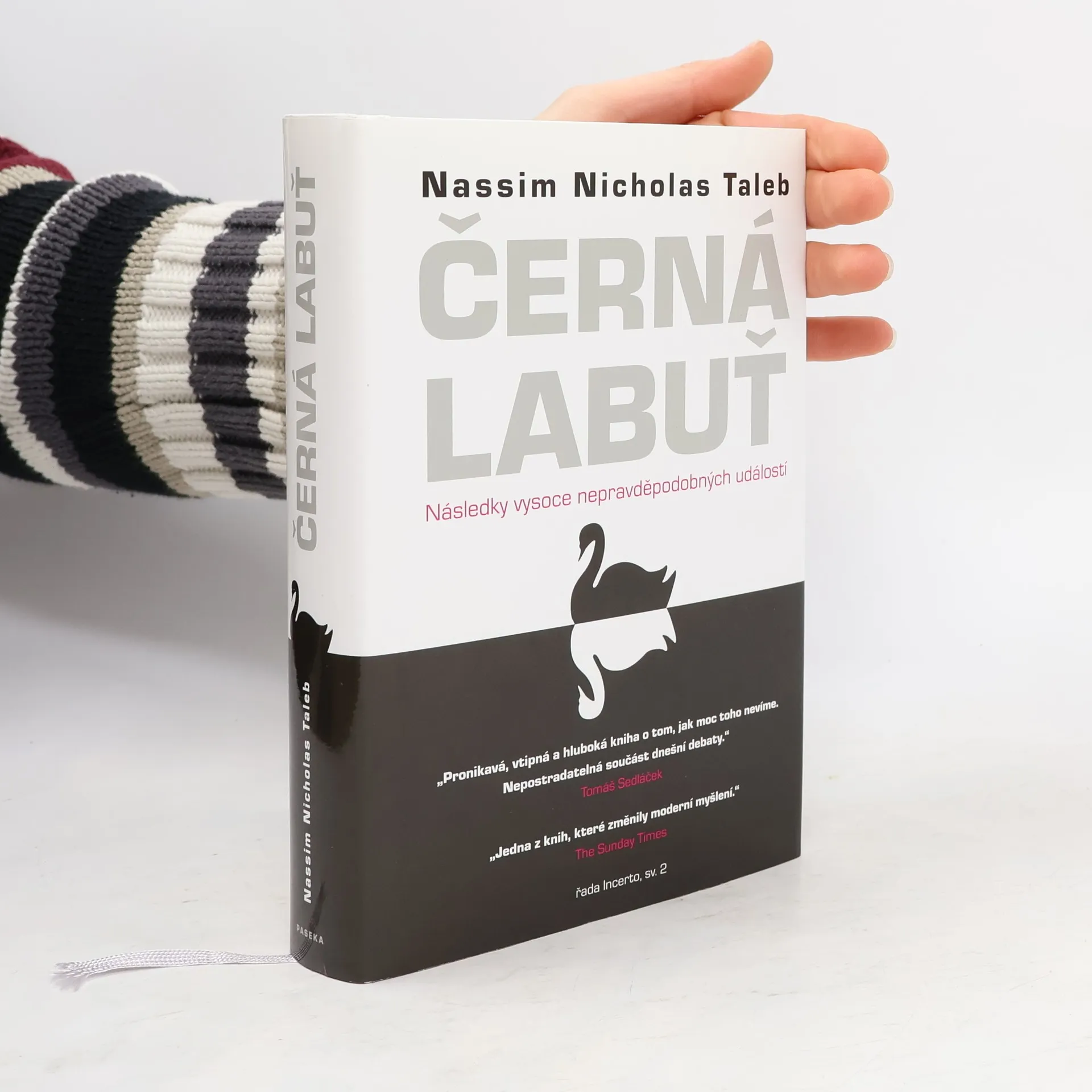 Následky vysoce nepravěpodobných událostí Bestseller amerického akademika a investičního poradce libanonského původu analyzuje fenomén „černých labutí“, tj. nepředvídaných jevů a událostí s významným dopadem na život jedince nebo celé společnosti, jakým byl např. teroristický útok z 11. září 2001, fenomenální úspěch společnosti Google či nedávná globální finanční a ekonomická krize. Autor – jeden z mála odborníků, kteří nástup krize předvídali – věří, že příčinou naší nepřipravenosti na podobné zlomové události je především setrvačnost našeho myšlení v podobě přílišné důvěry ve statistiky a prognostiky, přehnaného kategorizování, hledání „logiky“ vývoje či soustřeďování se na specifika tam, kde bychom měli přemýšlet spíše v obecných kontextech. Jeho kniha, vyzývající k tomu, abychom přehodnotili náš ustálený pohled na svět a přiznali si, jak málo o něm víme, patří dnes k nejdiskutovanějším pracím ve svém žánru, deníkem Times byla označena za jedno z nejvlivnějších děl posledních šedesáti let a díky autorovu širokému rozhledu, smyslu pro humor a zdravé provokativnosti je i velkým čtenářským zážitkem.