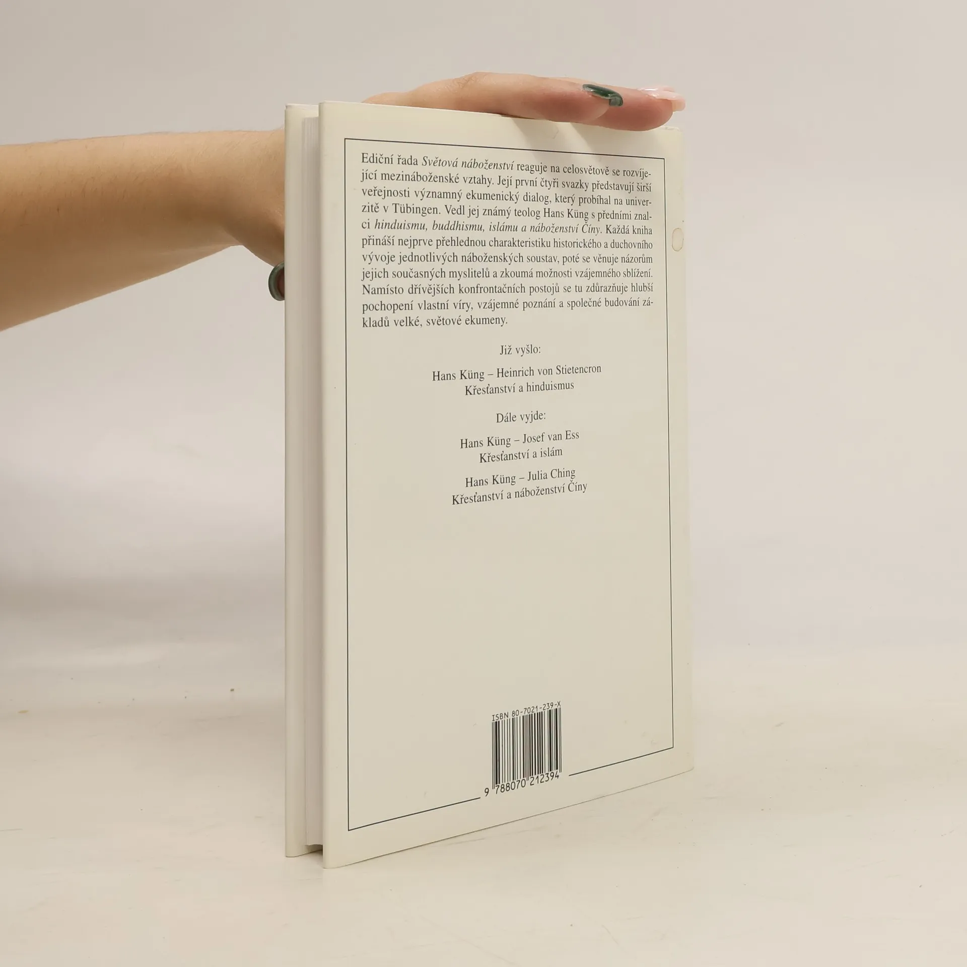 Srozumitelné, odborně fundované seznámení s neevropskými náboženstvími. Výzva k dialogu, porozumění a smíření. Čtyři svazky této řady představují veřejnosti významný ekumenický dialog, který vedl světově uznávaný teolog Hans Küng s předními znalci hinduismu (sv. 1), buddhismu (sv. 2), islámu (sv. 3) a náboženství Číny (sv. 4). Každá kniha přináší nejprve přehlednou charakteristiku historického a duchovního vývoje jednotlivých náboženských soustav, poté se věnuje názorům jejich současných myslitelů a zkoumá možnosti vzájemného porozumění.