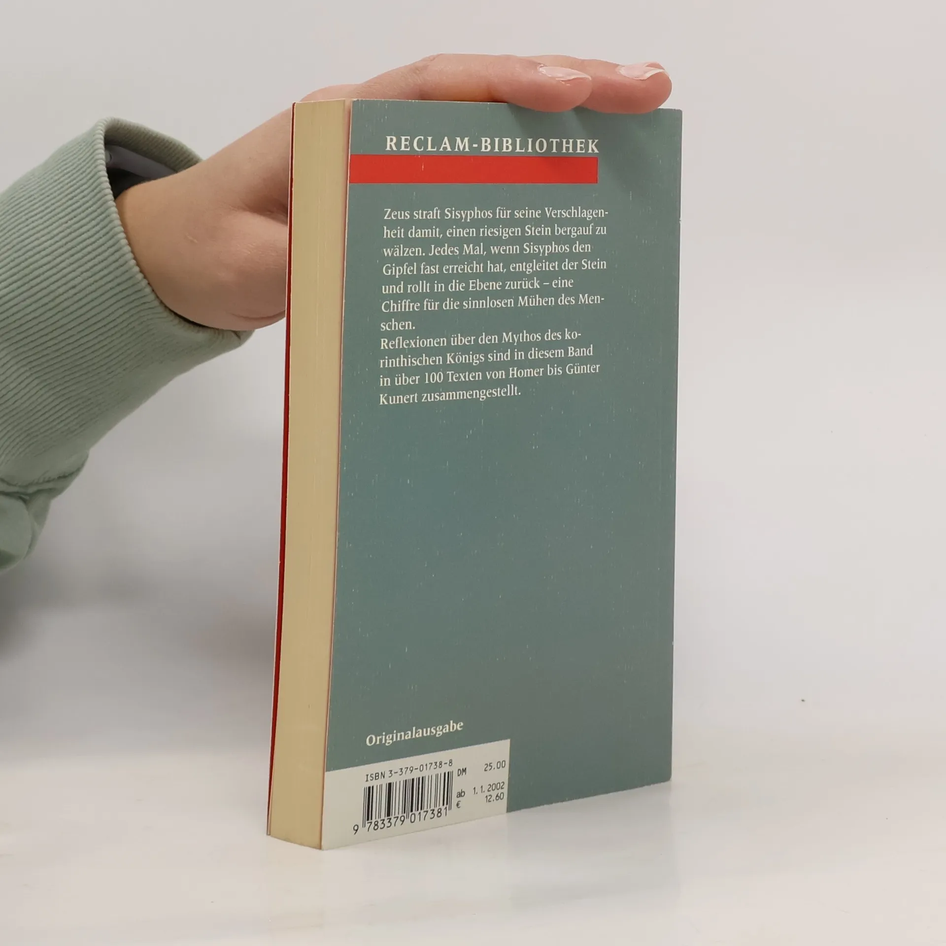 Zeus erlegte Sisyphos als Strafe auf, einen riesigen Stein den Berg hinaufzuwälzen, der ihm jedes Mal, wenn er den Gipfel fast erreicht hat, entgleitet und zurückrollt. Bis in dieses Jahrhundert hinein erscheint Sisyphos als ewig leidender Büßer. Erst Camus stellt den Mythos auf den Kopf: Das Leben braucht keinen Sinn, aber es muss in seiner Absurdität erkannt und akzeptiert werden. 100 Texte von Homer bis Günter Kunert zeichnen die Deutung des Mythos nach.