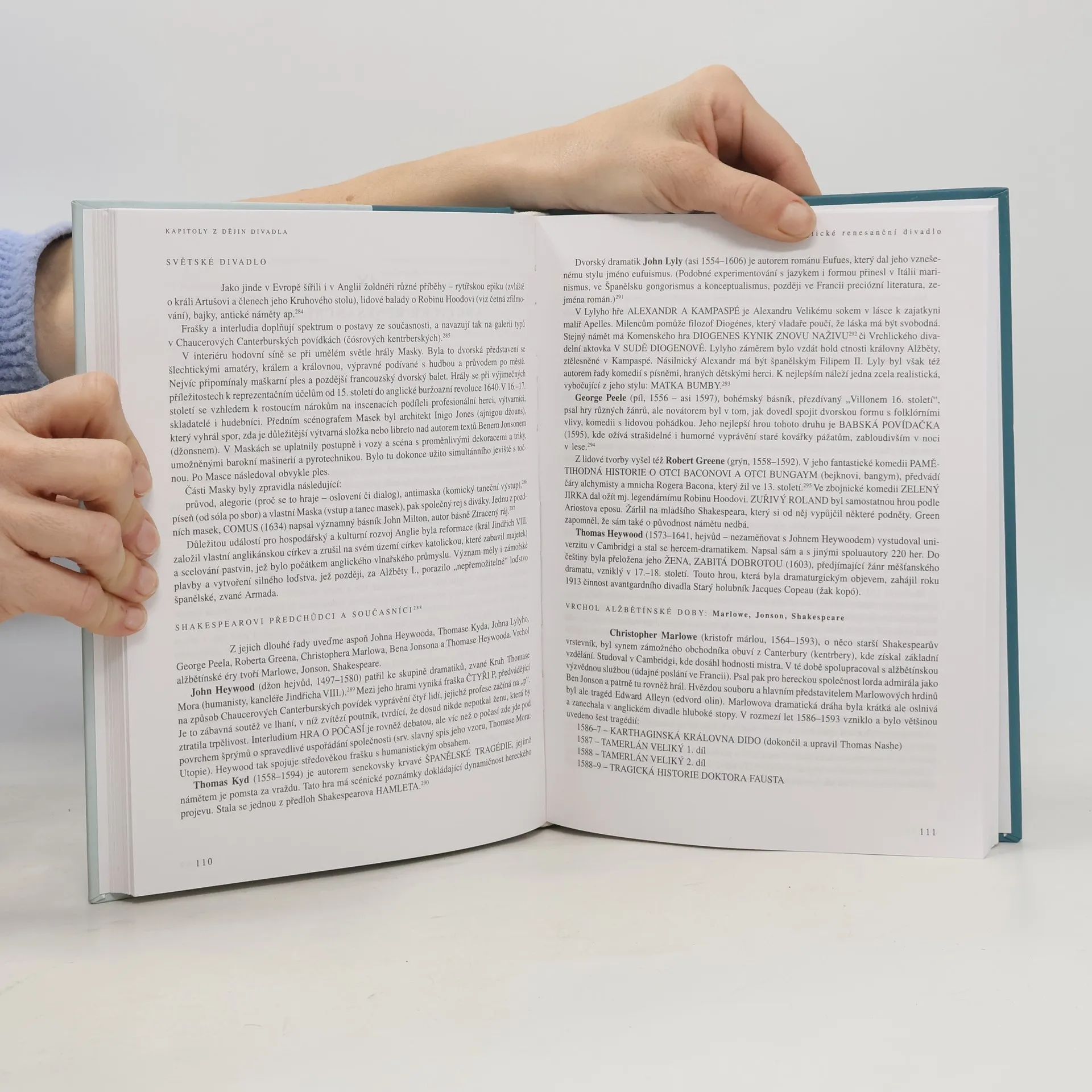 Kniha podává základní informaci o vývoji světového a českého divadla v přehledu, který počíná divadelními prvky v pravěkých obřadech, pokračuje obřady Mezopotámie, Egypta a antiky až ke středověkému divadlu v Evropě. Vývoj českého divadla je zachycen od počátků do 18. století.
