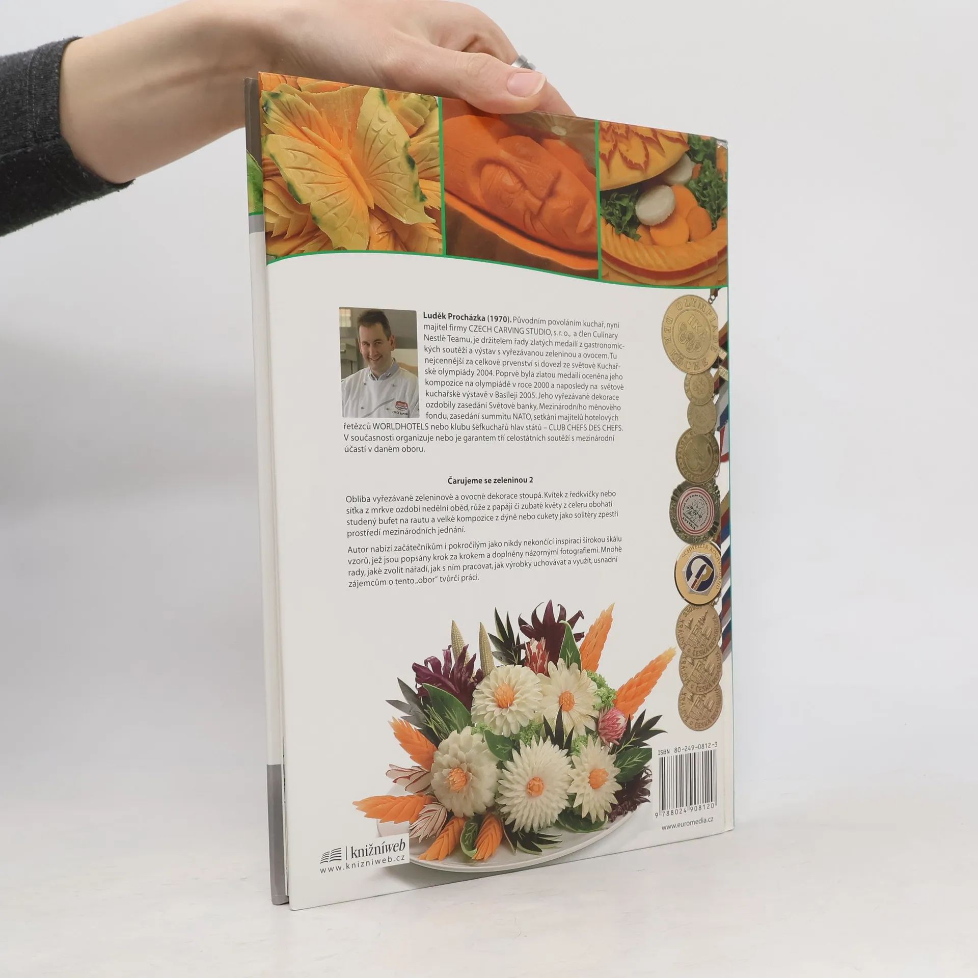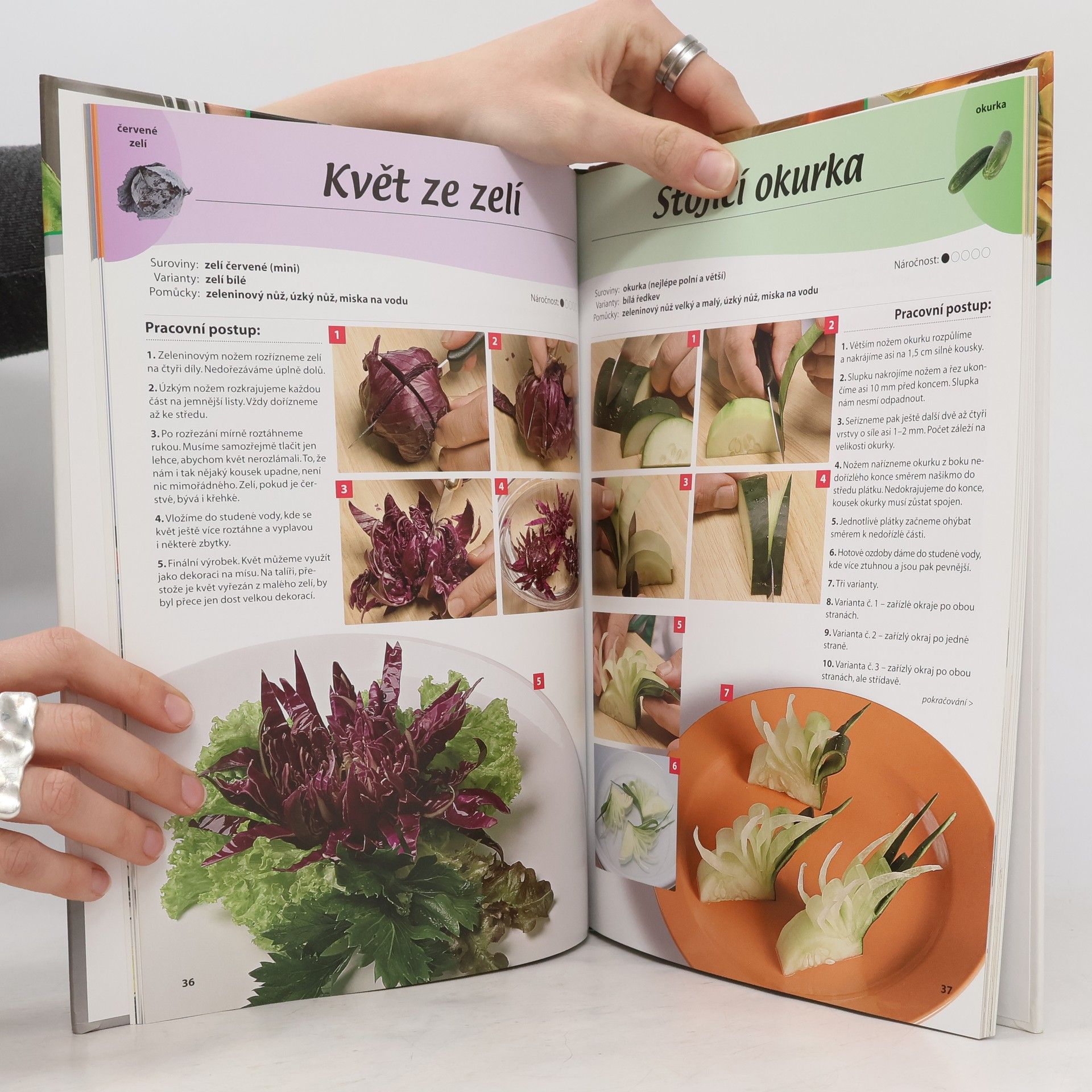 Čarujeme se zeleninou 2 Obliba vyřezávané zeleninové a ovocné dekorace stoupá. Kvítek z ředkvičky nebo síťka z mrkve ozdobí nedělní oběd, růže z papáji či zubaté květy z celeru obohatí studený bufet na rautu a velké kompozice z dýně nebo cukety jako solitéry zpestří prostředí mezinárodních jednání. Autor nabízí začátečníkům i pokročilým jako nikdy nekončící inspiraci širokou škálu vzorů, jež jsou popsány krok za krokem a doplněny názornými fotografiemi. Mnohé rady, jaké zvolit nářadí, jak s ním pracovat, jak výrobky uchovávat a využít, usnadní zájemcům o tento "obor" tvůrčí práci.