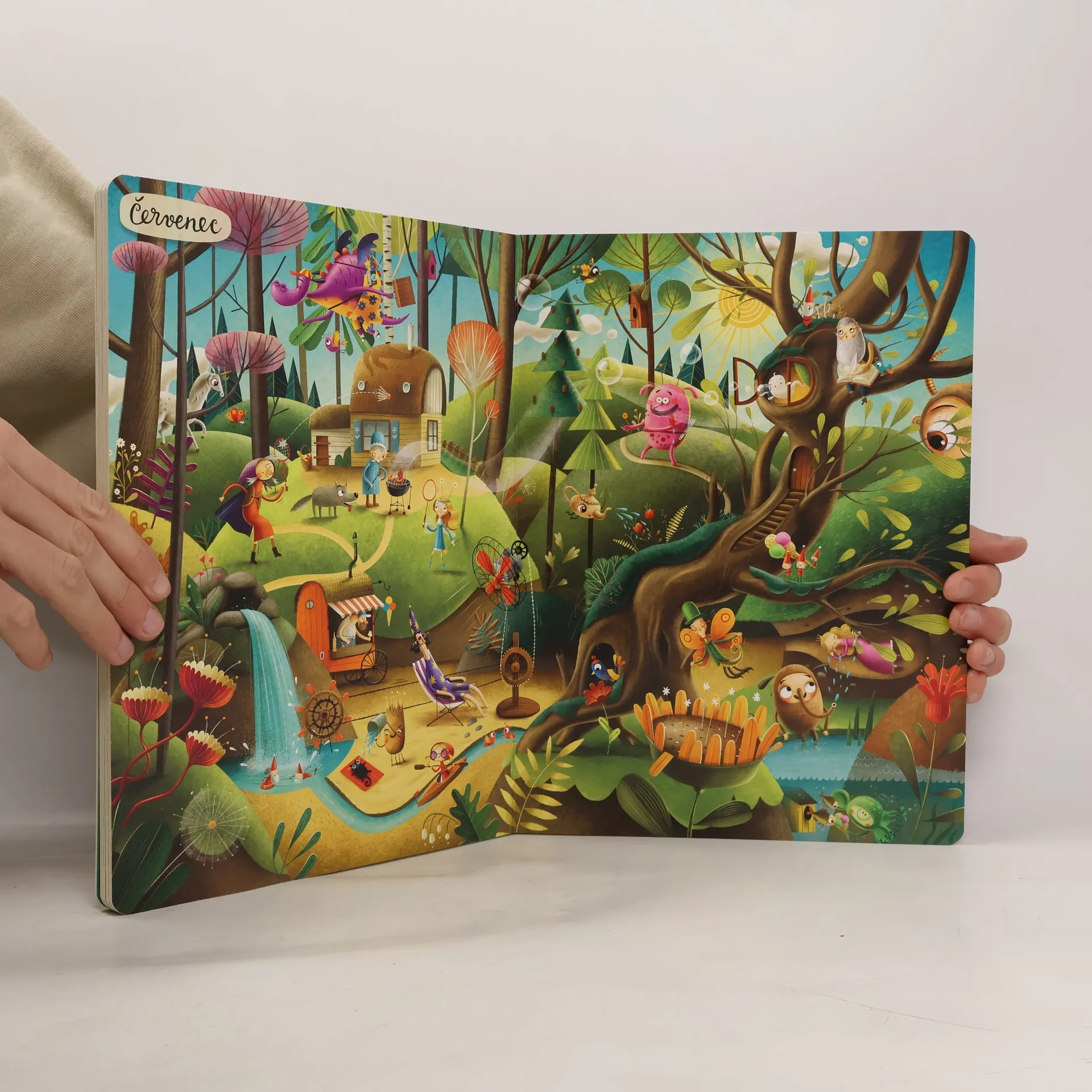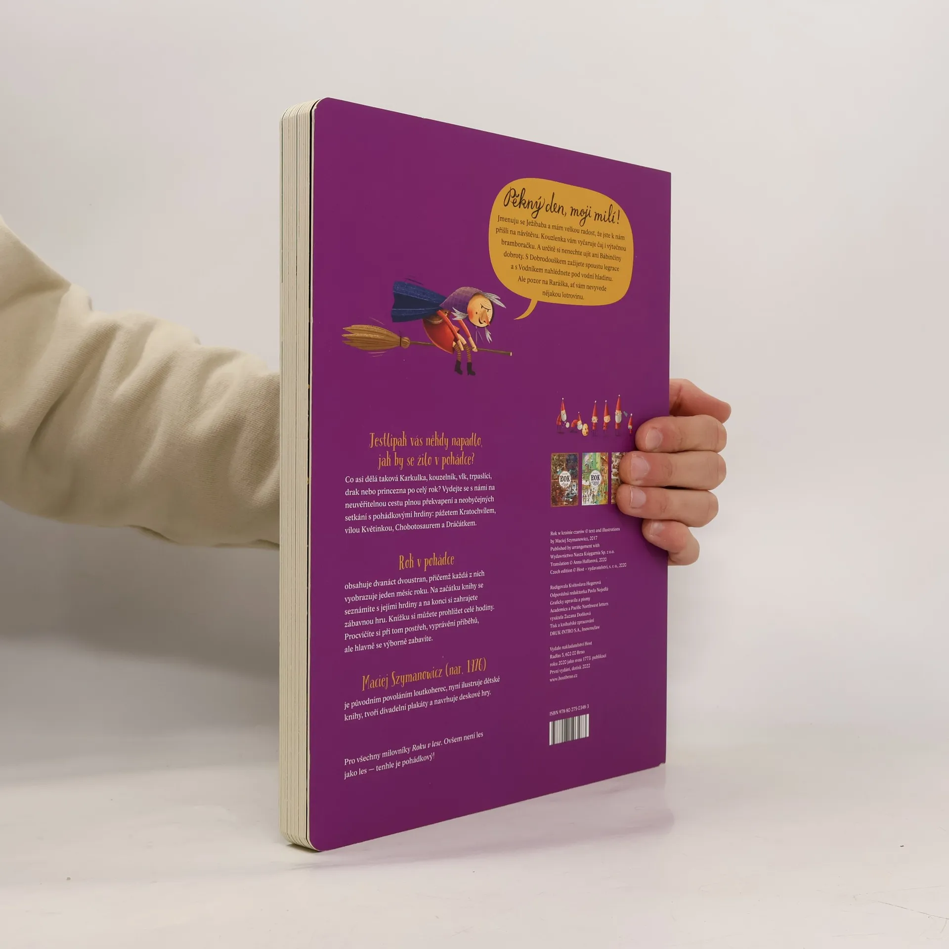 "Pěkný den, moji milí! Jmenuju se Ježibaba a mám velkou radost, že jste k nám přišli na návštěvu. Kouzlenka vám vyčaruje čaj i výtečnou bramboračku. A určitě si nenechte ujít ani Bábinčiny dobroty. S Dobrodouškem zažijete spoustu legrace a s Vodníkem nahlédnete pod vodní hladinu. Ale pozor na Raráška, ať vám nevyvede nějakou lotrovinu. Jestlipak vás někdy napadlo, jak by se žilo v pohádce? Co asi dělá taková Karkulka, kouzelník, vlk, trpaslíci, drak nebo princezna po celý rok? Vydejte se s námi na neuvěřitelnou cestu plnou překvapení a neobyčejných setkání s pohádkovými hrdiny: pážetem Kratochvílem, vílou Květinkou, Chobotosaurem a Dráčátkem. Rok v pohádce obsahuje dvanáct dvoustran, přičemž každá z nich vyobrazuje jeden měsíc roku. Na začátku knihy se seznámíte s jejími hrdiny a na konci si zahrajete zábavnou hru. Knížku si můžete prohlížet celé hodiny. Procvičíte si při tom postřeh, vyprávění příběhů, ale hlavně se výborně zabavíte. Pro všechny milovníky Roku v lese. Protože není les jako les — tenhle je pohádkový! "