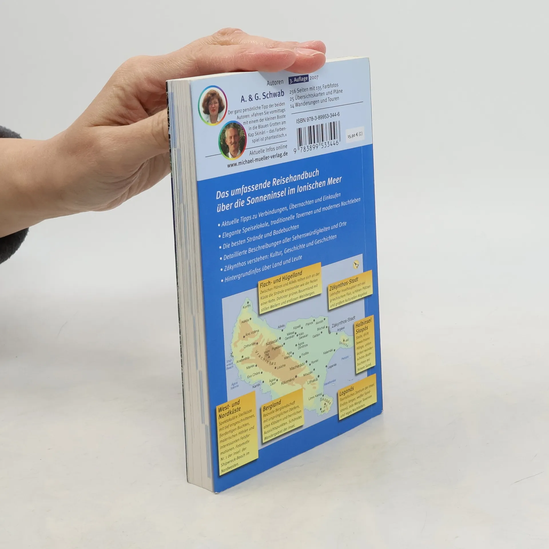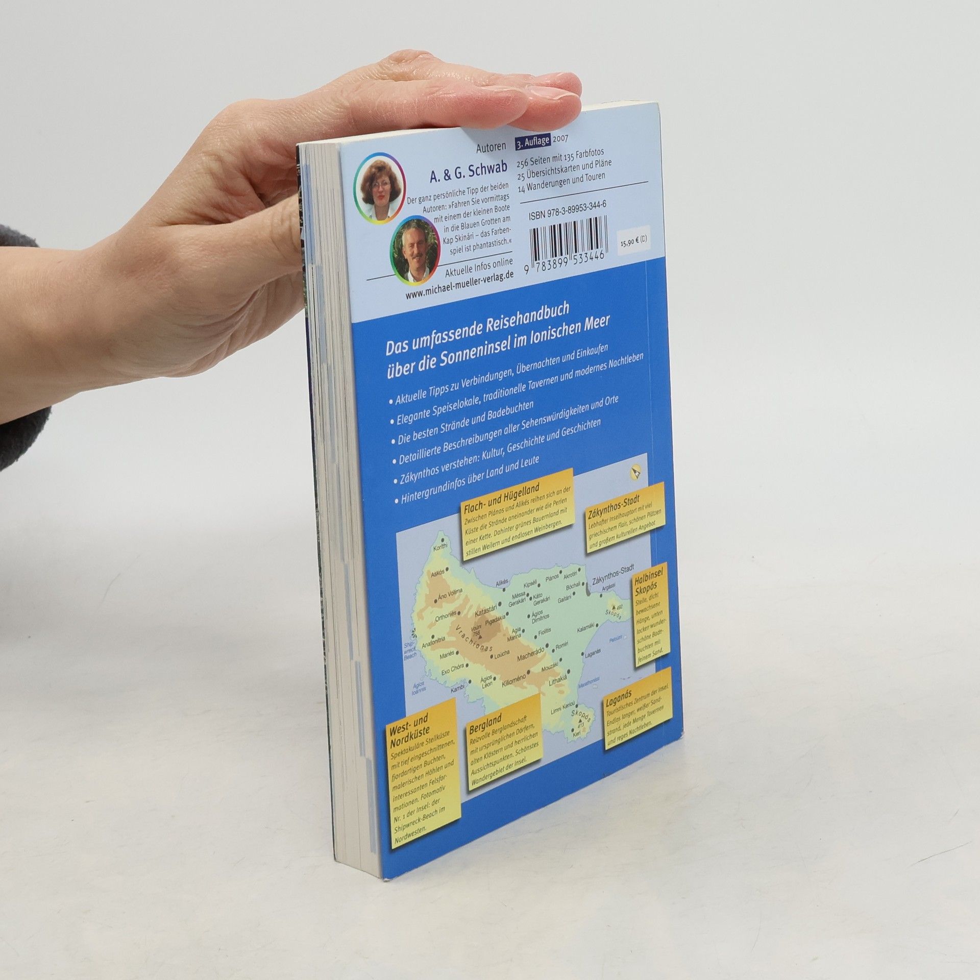 Türkisblaues Meer, senkrecht abfallende weiße Klippen, die eine traumhafte Sandbucht umrahmen, in deren Mitte ein gestrandetes Schiff das Wahrzeichen von Zakynthos und eines der populärsten Postkartenmotive in Griechenland überhaupt.Die »Blume der Levante« nimmt seit Jahren einen festen Platz im internationalen Tourismus ein. Kein Wunder, denn kilometerlange, feinsandige Strände laden zum Baden ein, Bootsausflüge führen zu geheimnisvollen Grotten, und im Hinterland locken stille Dörfer und alte Klöster zwischen sanften Hügeln, blumenübersäten Wiesen und in der Sonne glitzernden Olivenbäumen.Das Reisebuch beschreibt die schönsten Badebuchten, gibt Anregungen zu faszinierenden Wanderungen und weist den Weg zu gemütlichen Tavernen und empfehlenswerten Unterkünften.