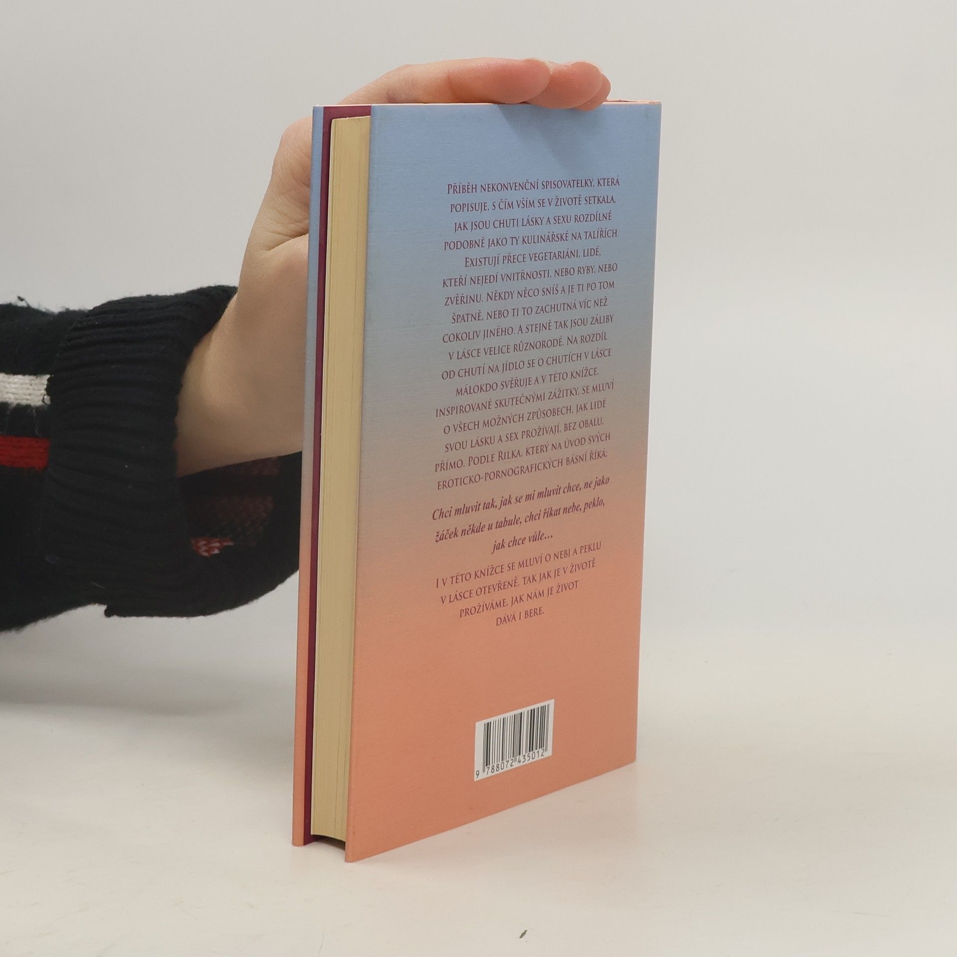 Příběh nekonvenční spisovatelky, která vzpomíná na své lásky, s nimiž se v životě setkala, na to, jak jsou chuti lásky a sexu rozdílné podobně jako ty kulinářské na talířích. Existují přece vegetariáni, lidé, kteří nejedí vnitřnosti, nebo ryby, nebo zvěřinu. A stejně tak jsou záliby v lásce velice různorodé. Na rozdíl od chutí na jídlo se s chutěmi v lásce málokdo svěřuje a v této knížce, inspirované skutečnými zážitky, se mluví o všech možných způsobech, jak lidé svou lásku a sex prožívají, bez obalu, přímo. Podle Rilka, který na úvod svých eroticko-pornografických básní říká: chci mluvit tak, jak se mi mluvit chce, ne jako žáček někde u tabule, chci říkat nebe, peklo, jak chce vůle I v této knížce se mluví o nebi a peklu v lásce otevřeně, tak jak je v životě prožíváme, jak nám je život dává i bere.