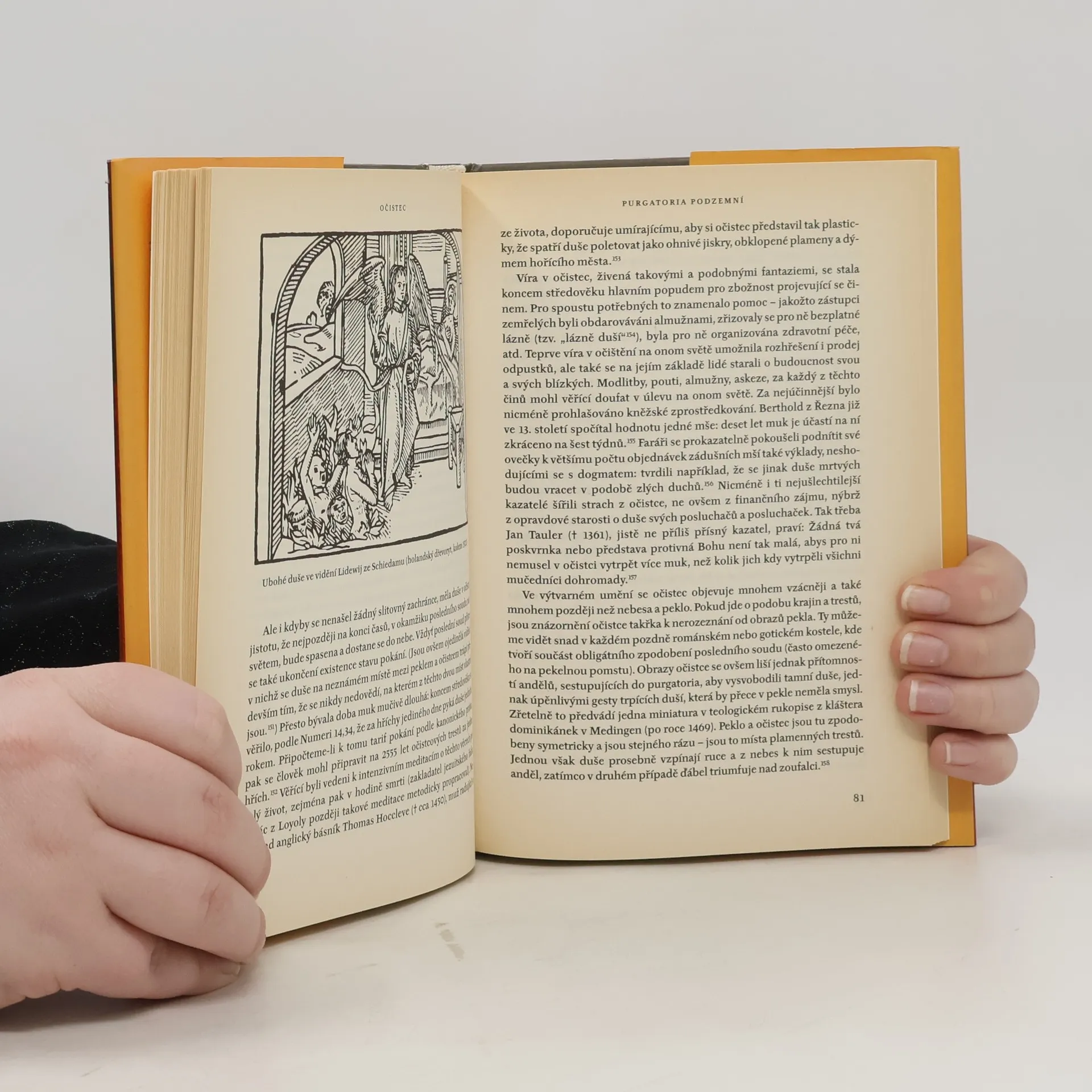 Německý historik Peter Dinzelbacher, i u nás už známý svým dílem Světice, nebo čarodějky, zde obrací svou pozornost k tématu, jež tvořilo středobod středověkého myšlení, ba života. Strach z konce, z toho, co přijde po smrti, propůjčoval – a propůjčuje – křídla lidské fantazii. Středověk však dovedl „onen svět“ líčit v barvách tak divuplných jako snad žádný jiný věk. Ve svém poutavě napsaném díle se autor soustředí jak na motiv očistce, tak na vývoj představ o nebeském království vyvolených a peklu zavržených. Svým způsobem tak doplňuje obraz, který si český čtenář mohl nedávno učinit na základě Le Goffovy rozsáhlé studie Zrození očistce.