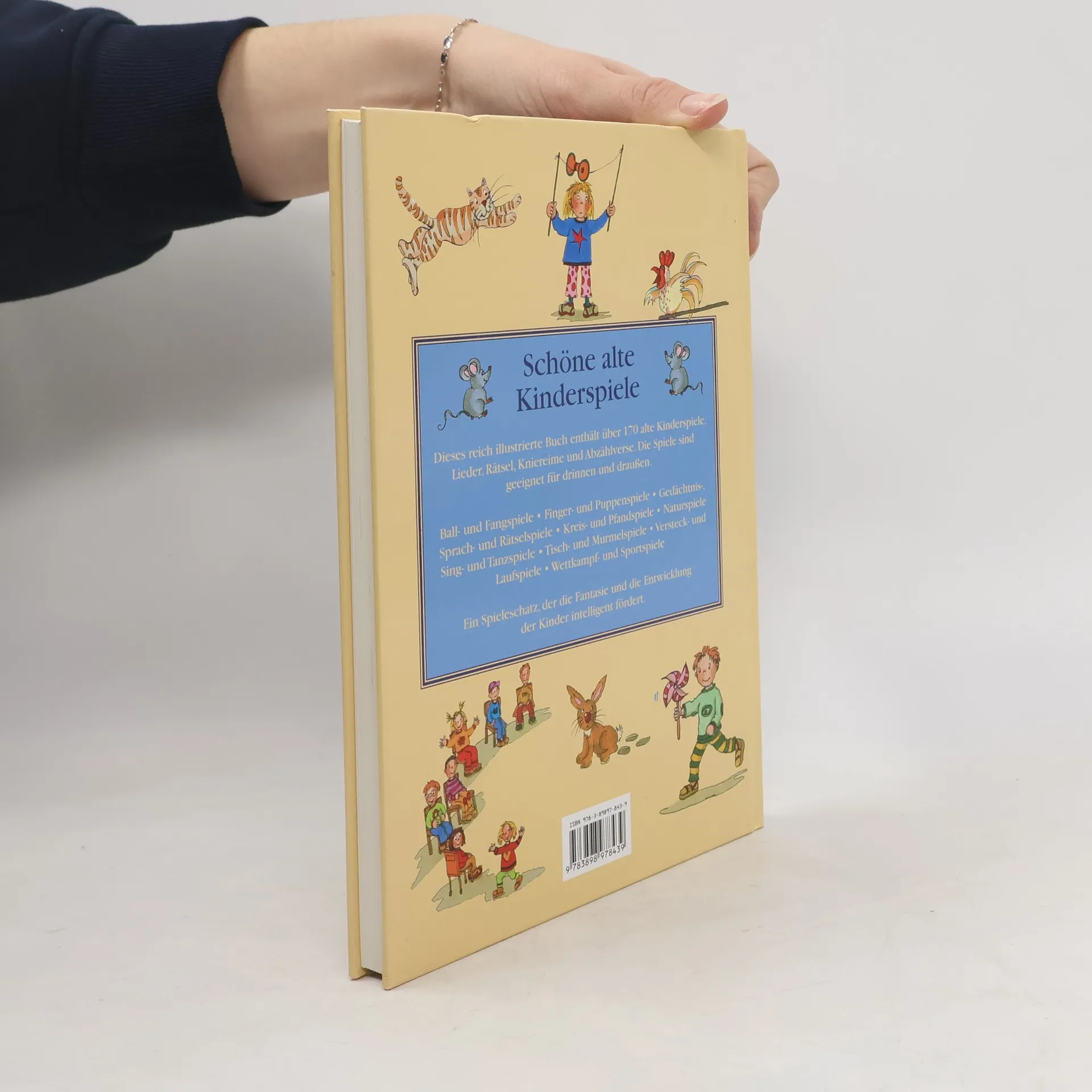 Dieses reich illustrierte Buch enthält über 100 einfache alte Kinderspiele, Lieder, Kniereime und Abzählverse. Die Spiele sind geeignet für drinnen und draußen. Finger- und Puppenspiele, Ball- und Fangspiele, Sing-, Sprach-, und Ratespiele, Kreis- und Pfandspiele, Versteck- und Laufspiele, Wettkampf- und Sportspiele, Tisch- und Murmelspiele. Ein Spielschatz, der die Phantasie und die Entwicklung der Kinder intelligent fördert.