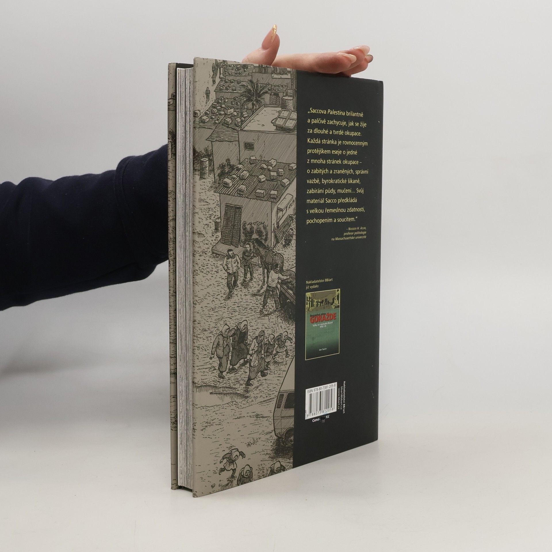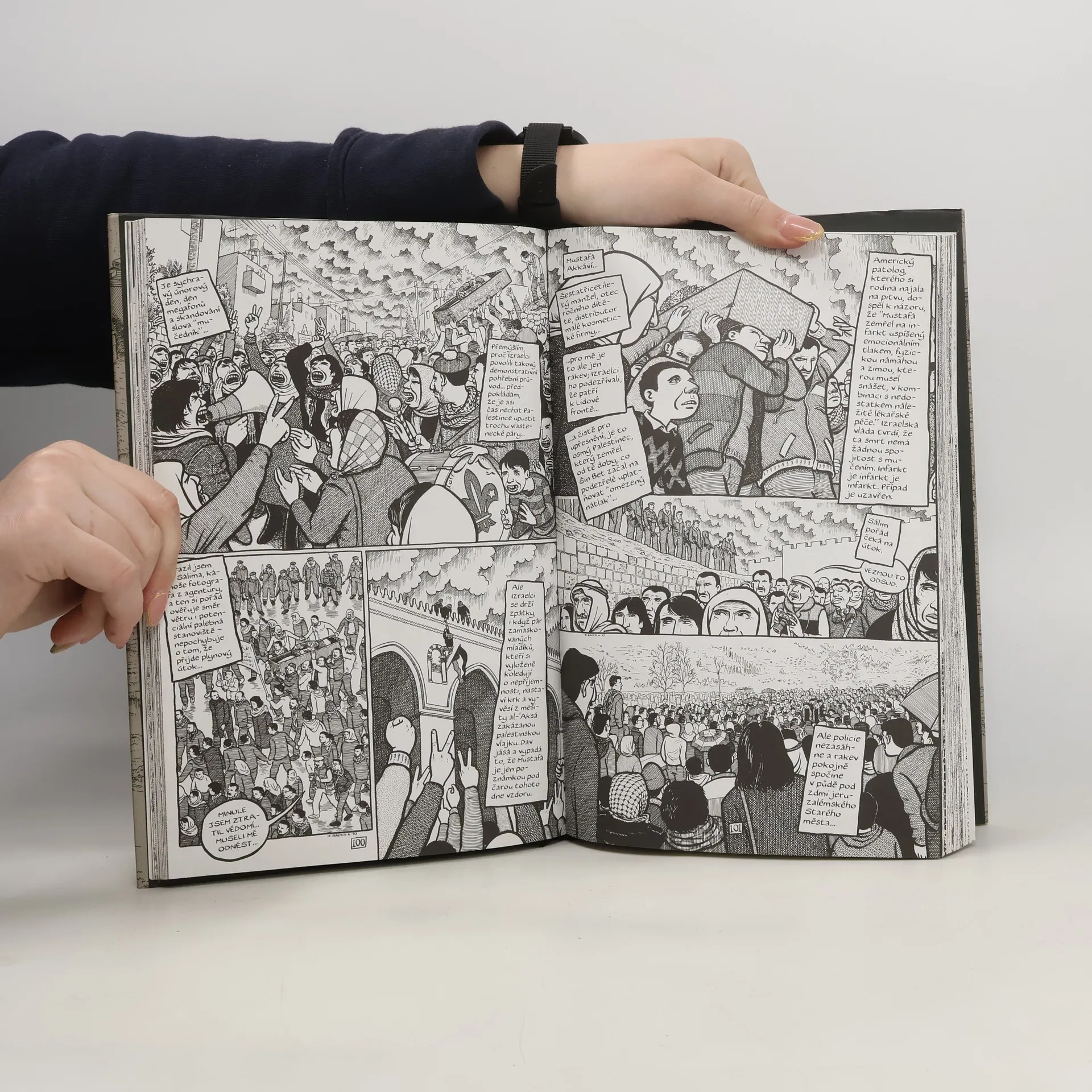Za první intifády, v letech 1991 a 1992, strávil Joe Sacco dva měsíce s Palestinci na Západním břehu Jordánu a v pásmu Gazy. Na cestách si dělal poznámky a po návratu do Spojených států napsal a nakreslil komiks Palestina, v němž citlivě a přitom s humorem vylíčil, jaké je to žít, pracovat, cestovat, mít děti, přežívat a umírat jako Palestinec. Palestina je reportáž, ne politická polemika, Sacco v ní nenavrhuje žádná snadná řešení (ba vůbec žádná), jen dokumentuje bolest a utrpení lidí způsobem, jaký vám tradiční média jen těžko zprostředkují.