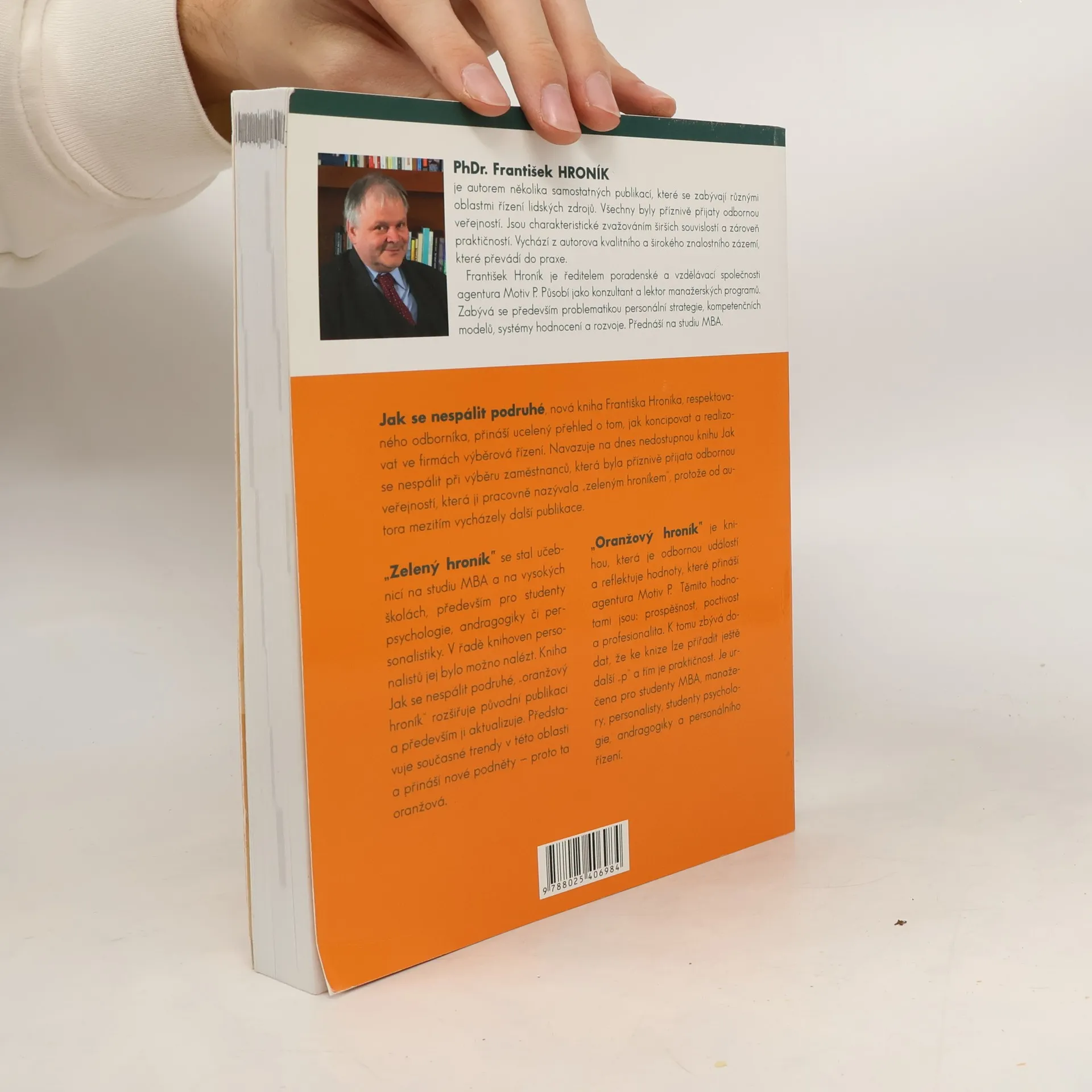 Jak se nespálit podruhé, nová kniha Františka Hroníka, respektovaného odborníka, přináší ucelený přehled o tom, jak koncipovat a realizovat ve firmách výběrové řízení. Navazuje na dnes nedostupnou knihu Jak se nespálit při výběru zaměstnanců, která byla příznivě přijata odbornou veřejností, která ji pracovně nazývala zeleným hroníkem, protože od autora vycházely další publikace. Oranžový hroník je knihou, která je odbornou událostí a reflektuje hodnoty, které přináší agentura Motiv P. Těmito hodnotami jsou: prospěšnost, poctivost a profesionalita. K tomu zbývá dodat, že ke knize lze přidat ještě další p a tím je praktičnost. Je určena pro studenty MBA, manažery, personalisty, studenty psychologie, andragogiky a personálního řízení.