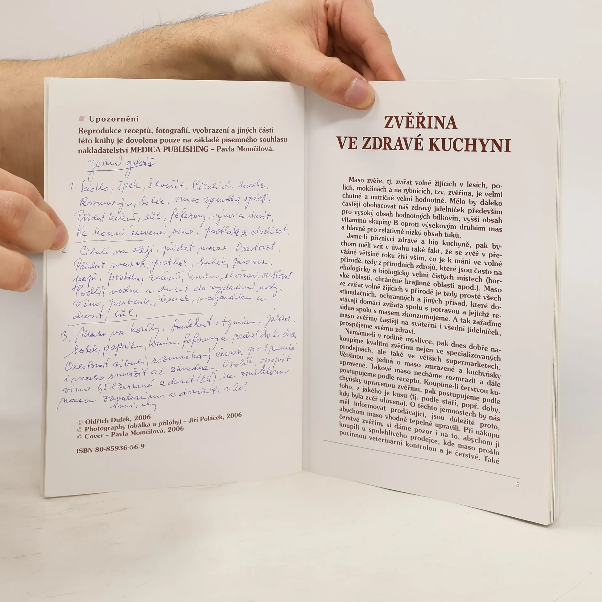 V kuchařce ZVĚŘINA A LAHODNÁ MASA VE ZDRAVÉ KUCHYNI najdeme řadu skvělých receptů z masa zvěře, tj. zvířat volně žijících v lesích, polích, mokřinách a na rybnících, z masa telecího, skopového i pštrosího.