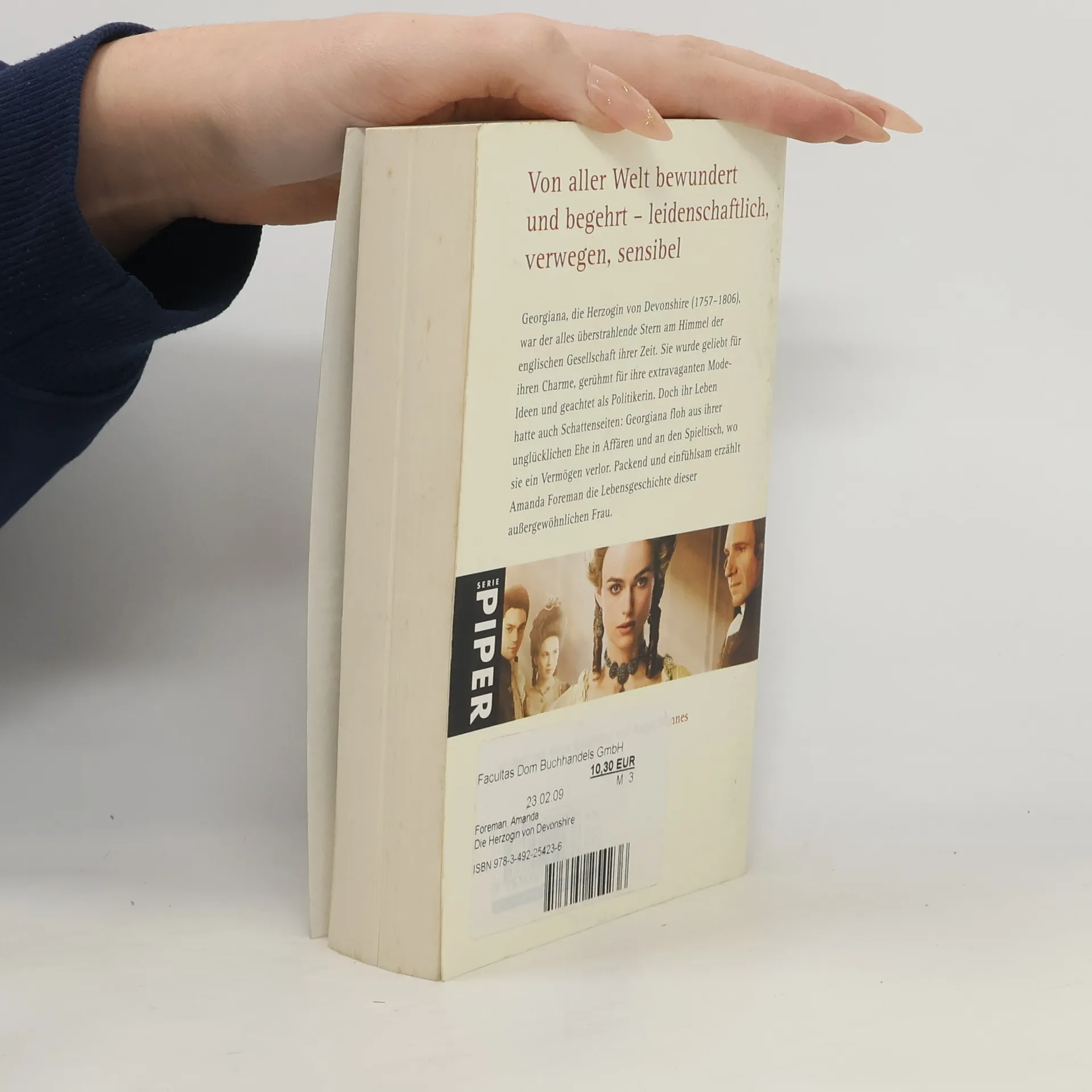 Georgina, Herzogin von Devonshire (1757–1806), war eine außergewöhnliche Frau. Ihr extravaganter Modestil erregte ebenso Aufmerksamkeit wie ihr politisches Engagement, das sich im 18. Jahrhundert für eine Dame nicht schickte. Die schöne Herzogin wurde bewundert und begehrt – sie war der unbestrittene Mittelpunkt der tonangebenden Londoner Gesellschaft. Doch auch sie hatte ihr Los zu tragen. Ihr Mann betrog sie und holte obendrein seine Geliebte in den gemeinsamen Haushalt. Georgina flüchtete sich in Affären und ihre Spielsucht trieb sie in unvorstellbare Schulden. Amanda Foremans sensibles Porträt ist die Vorlage für den Kinofilm 'Die Herzogin', der in den USA und England bereits mit großem Erfolg im Kino zu sehen war. Bei uns startet der Film am 26. März. Verfilmt mit Keira Knightley und Ralf Fiennes.