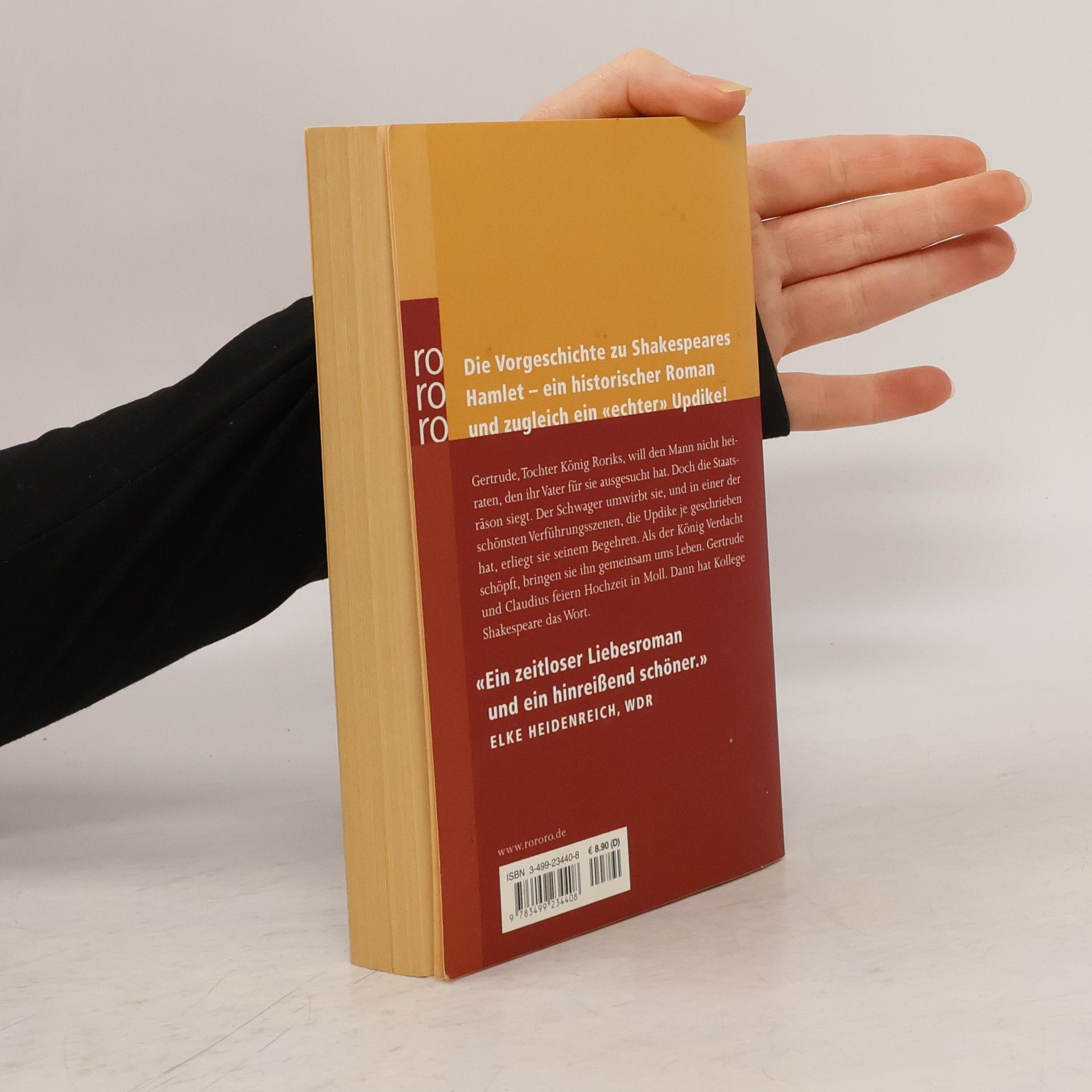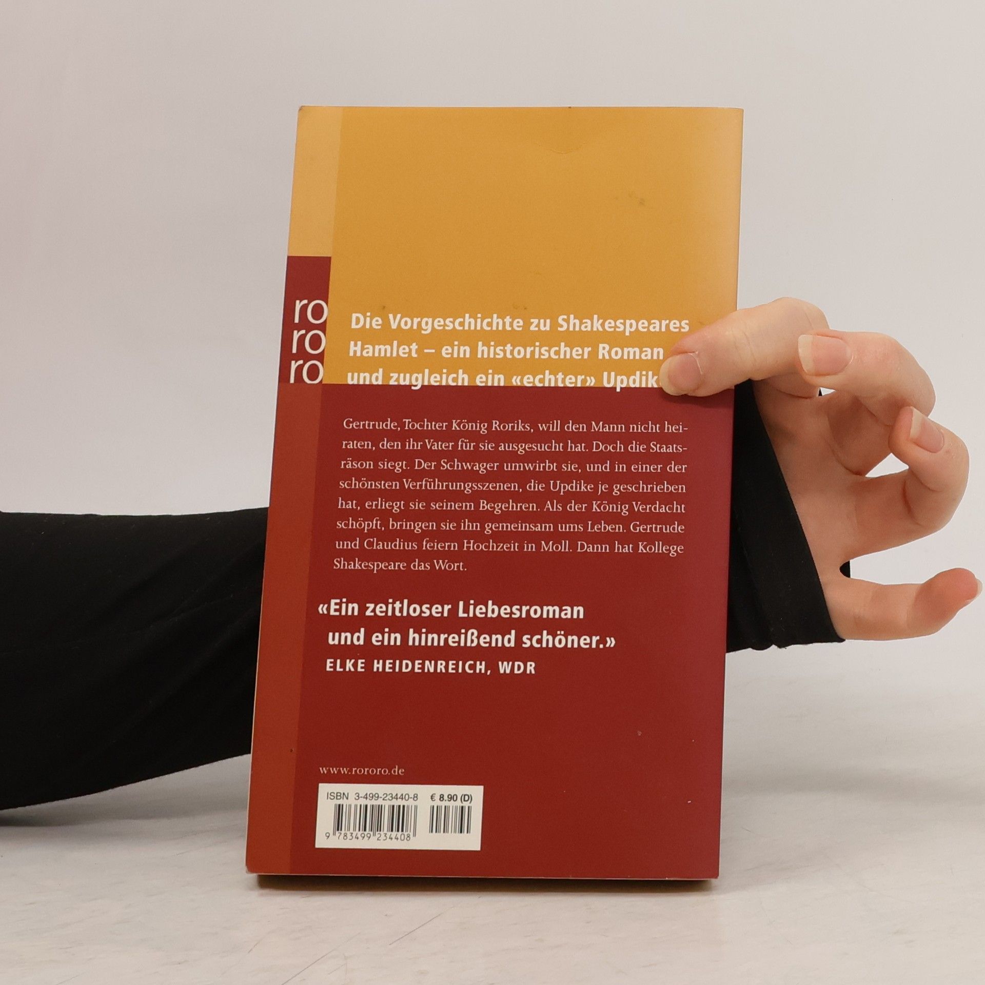 Die Vorgeschichte zu Shakespeares Hamlet: Gertrude, Tochter König Roriks, will den Mann nicht heiraten, den ihr Vater für sie ausgesucht hat. Doch die Staatsräson siegt. Der Schwager umwirbt sie, und in einer der schönsten Verführungsszenen, die Updike je geschrieben hat, erliegt sie seinem Begehren. Als der König Verdacht schöpft, bringen sie ihn gemeinsam ums Leben. Gertrude und Claudius feiern Hochzeit in Moll.