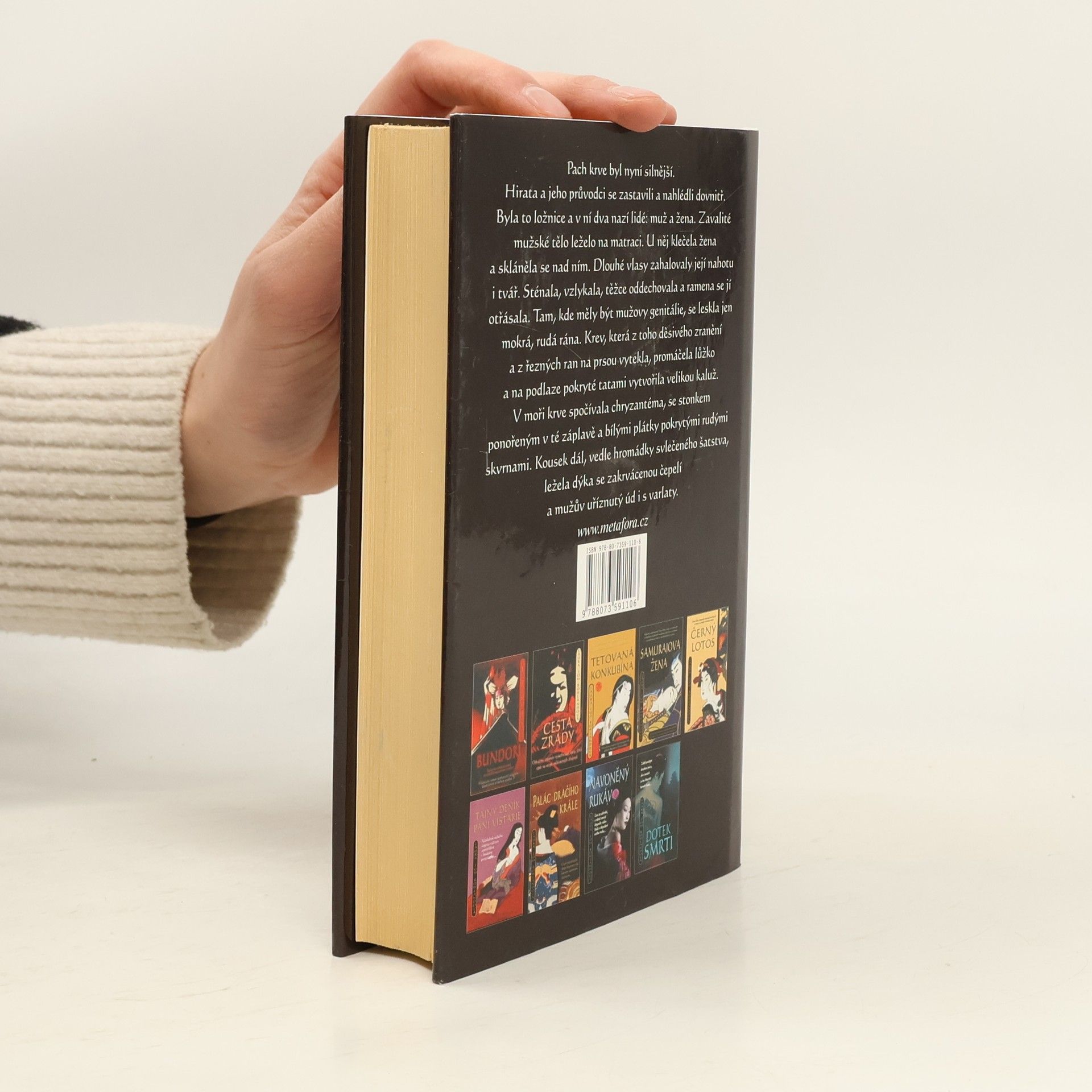Japonsko roku 1698. Samuraj Sano Ičiró je falešně obviněn z velezrady. A aby toho nebylo málo, dopadne další drtivá rána. Vedle obnažené, vykastrované mrtvoly mocného muže je nalezena, rovněž nahá, Sanova těhotná manželka Reiko. Ta ovšem tvrdí, že pán Mori, z jehož vraždy je vzápětí obviněna, zneužíval a zabíjel malé chlapce a že do jeho domu se vloudila proto, aby ho usvědčila. Dál už ji ale mysl zrazuje a kreslí jí přízračné obrazy její vlastní nevěry a odporných detailů vraždy. Sanovi nepřátelé nyní útočí na oba současně, takže se zdá, že před popravištěm už je nikdo a nic nezachrání. Nebyl by to ale Samo Ičiró, aby se přes vlastní pochybnosti nevrhl do boje a nepokusil se zachránit sebe, svou ženu i jejich nenarozené dítě. Jedenáctá kniha historické detektivní série Sano Ičiró.