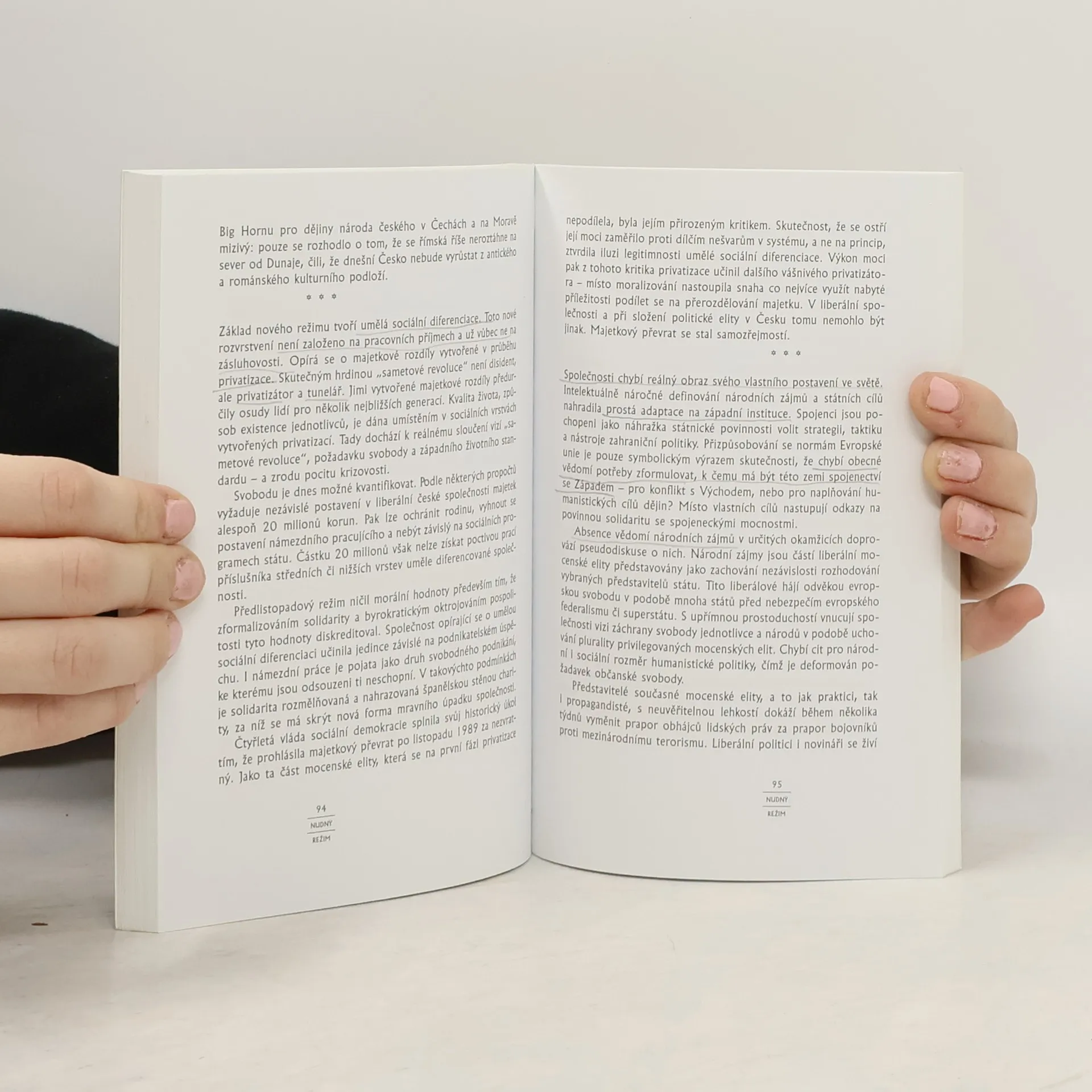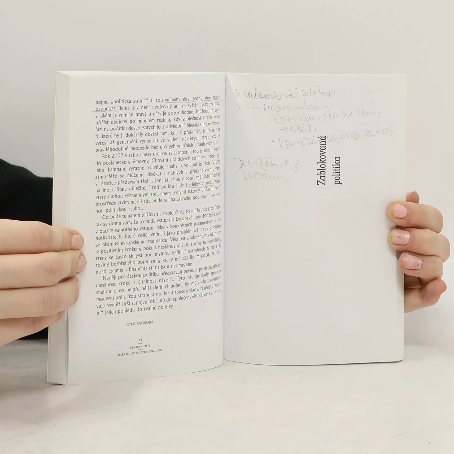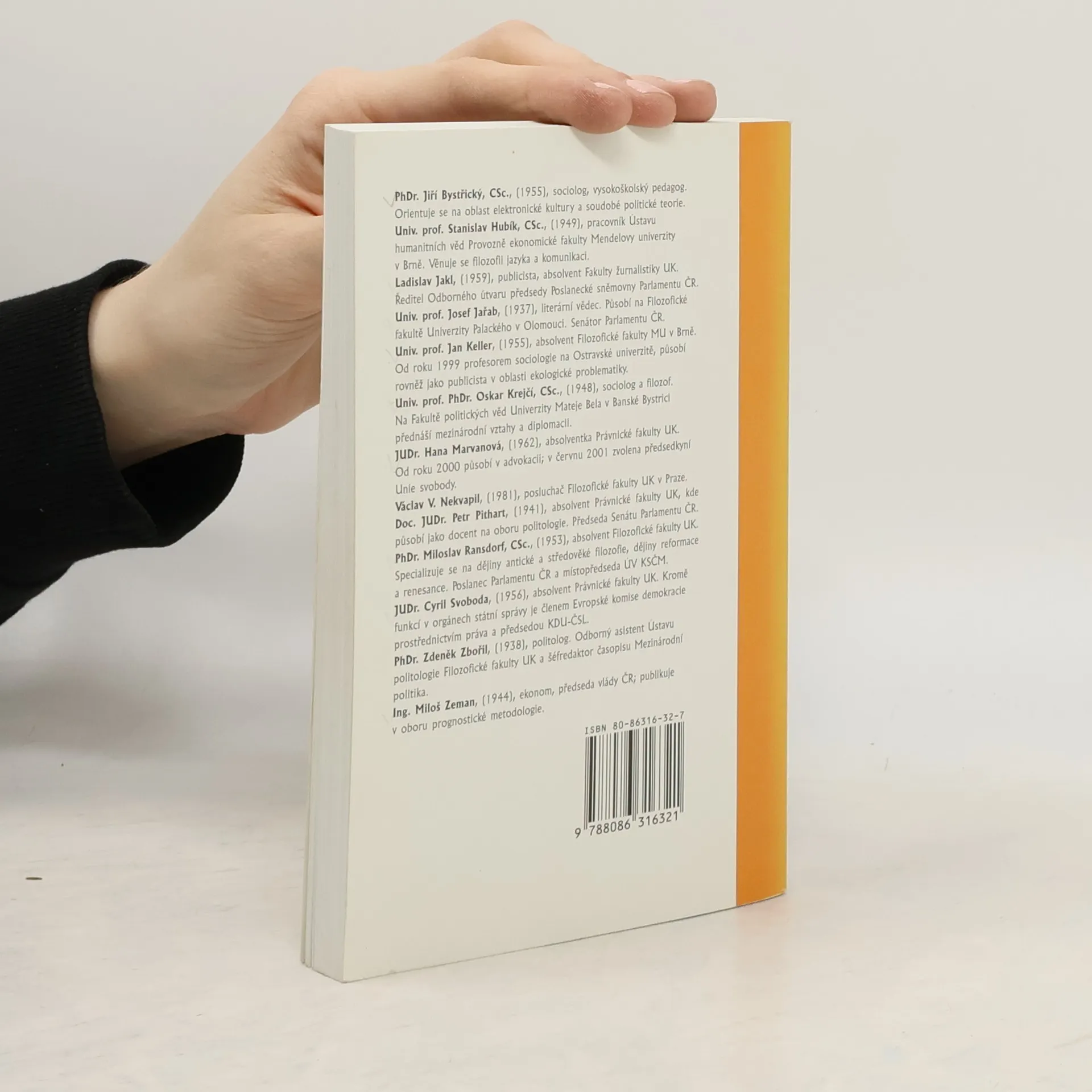 Úvahy nad inscenovanou skutečností. Vlivní političtí činitelé (např. Marvanová, Pithart, Ransdorf, M.Zeman) se pokouší postihnout aktuální tendence a naznačit perspektivy možného politického vývoje. Společným cílem jednotlivých příspěvků je snaha analyzovat politickou krizi jako možný zdroj nové energie stávajícího politického systému a význam politických vizí pro dosažení nové kvality společenského uspořádání. Sestavitel sborníku tyto politické postoje konfrontuje s názory nezávislých sociologů a politologů (např. Keller, O. Krejčí, Zbořil). Současná politická situace očima vlivných představitelů všech parlamentních stran i pohledem akademické obce.