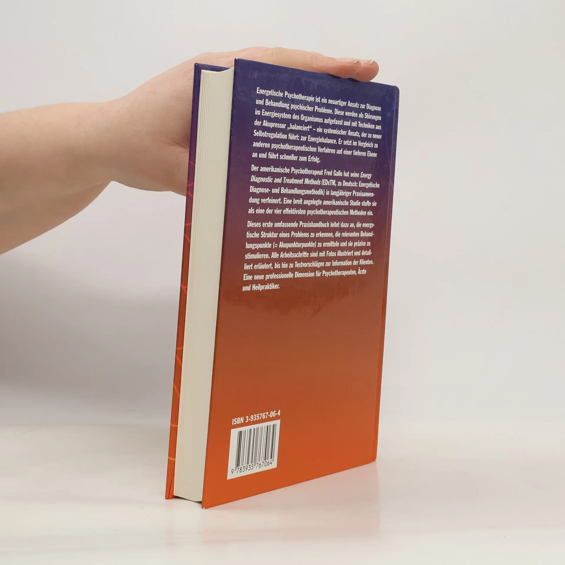 In diesem umfassenden Handbuch präsentiert Fred Gallo die von ihm in langjähriger Praxis entwickelten Diagnose- und Behandlungsmethoden der Energetischen Psychotherapie. Er stellt in vielen Einzelschritten dar, wie das Energiesystem eines Patienten gezielt angesprochen werden kann. Erfolge lassen sich damit oft überraschend schnell erzielen. Eine amerikanischen Studie zählt die Energetische Psychotherapie zu den vier effektivsten psychotherapeutischen Behandlungsmethoden. Zahlreiche Fotos illustrieren dieses Handbuch – es eröffnet Psychotherapeuten, Ärzten und Heilpraktikern neue Perspektiven für die Praxis.