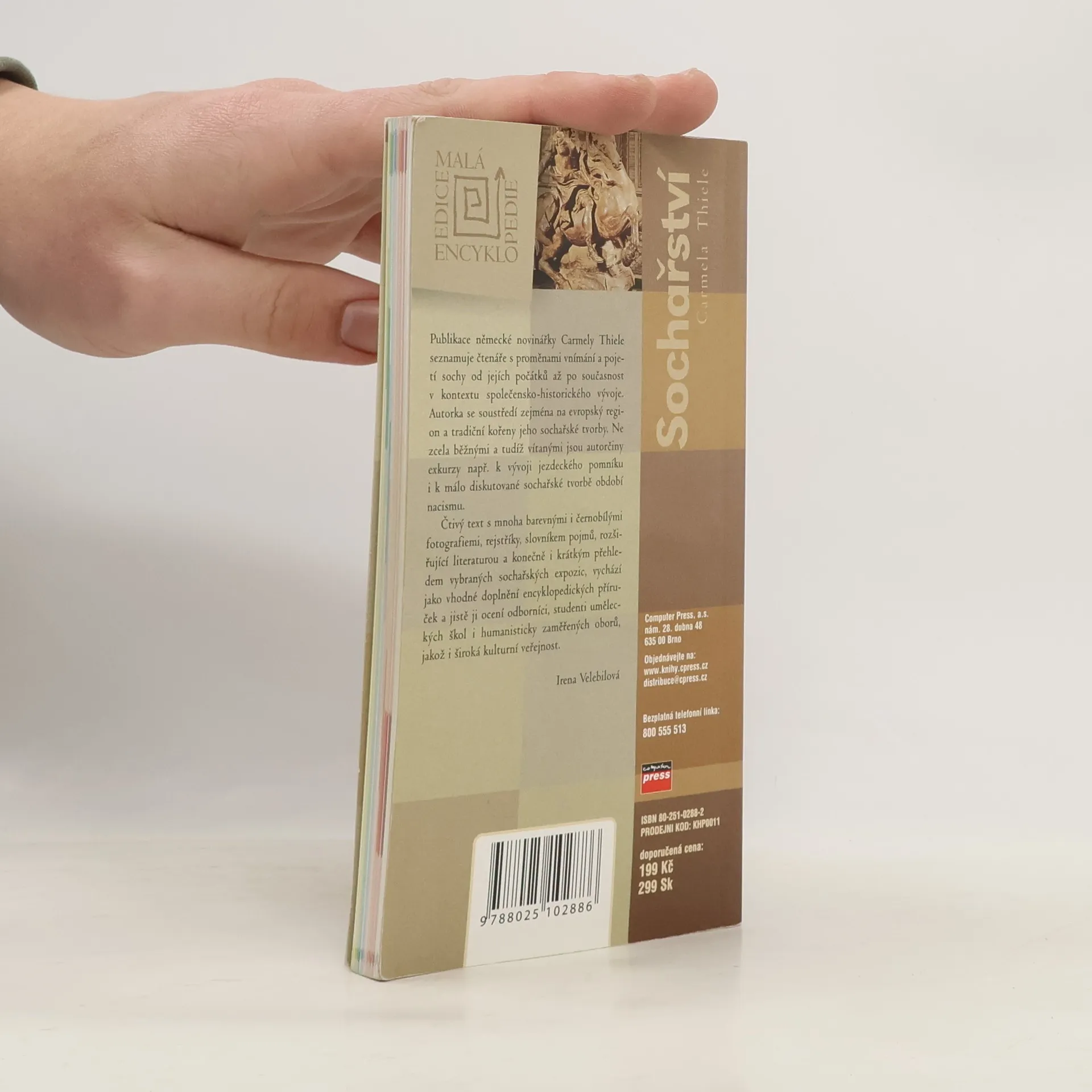 Publikace německé novinářky Carmely Thiele seznamuje čtenáře s proměnami vnímání a pojetí sochy od jejích počátků až po současnost v kontextu společensko-historického vývoje. Autorka se soustředí zejména na evropský region a tradiční kořeny jeho sochařské tvorby. Ne zcela běžnými a tudíž vítanými jsou autorčiny exkurzy např. k vývoji jezdeckého pomníku i k málo diskutované sochařské tvorbě období nacismu. Čtivý text s mnoha barevnými i černobílými fotografiemi, rejstříky, slovníkem pojmů, rozšiřující literaturou a konečně i krátkým přehledem vybraných sochařských expozic, vychází jako vhodné doplnění encyklopedických příruček a jistě ji ocení odborníci, studenti uměleckých škol i humanisticky zaměřených oborů, jakož i široká kulturní veřejnost.