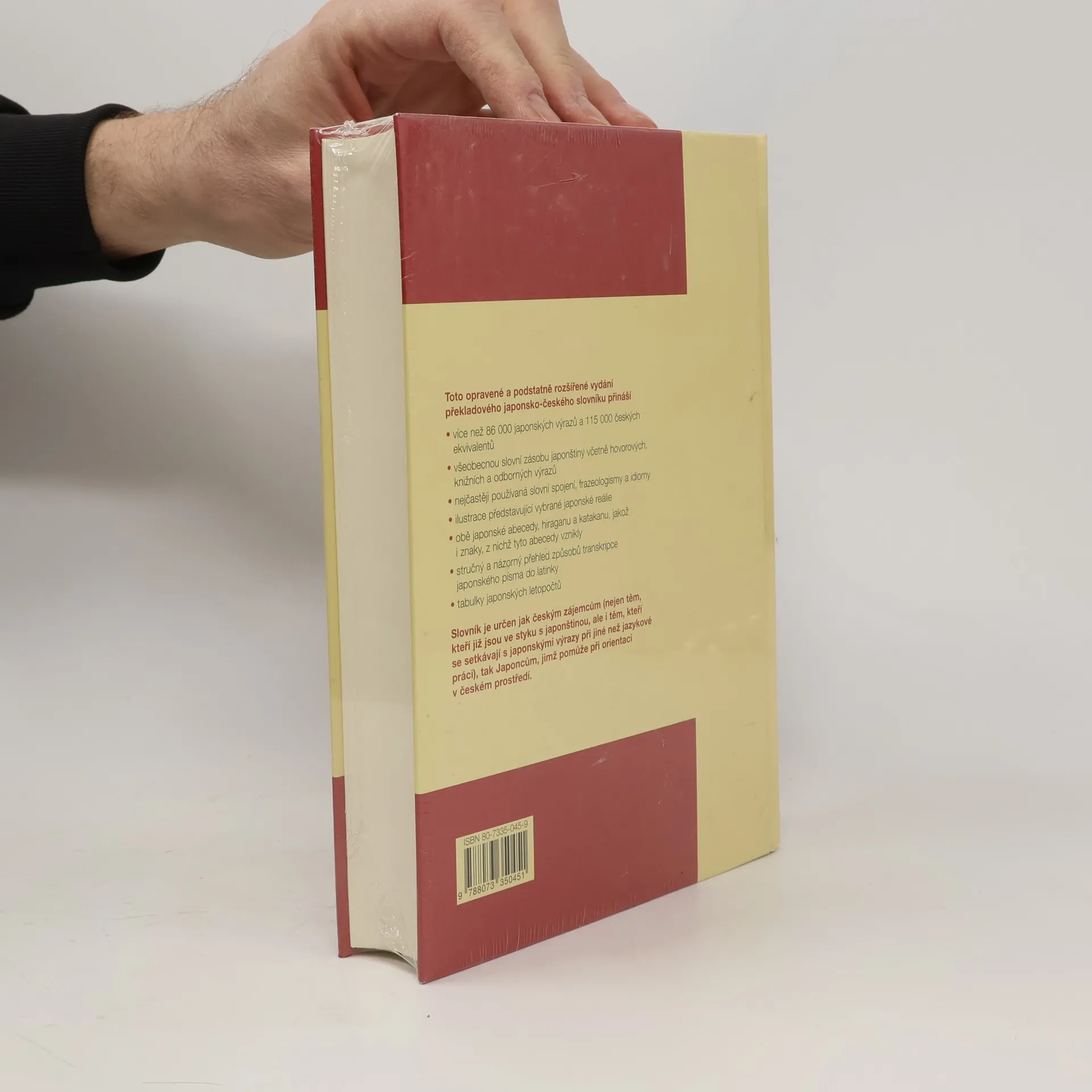 Toto opravené a podstatně rozšířené vydání překladového japonsko-českého slovníku přináší• více než 86 000 japonských výrazů a 115 000 českých ekvivalentů• všeobecnou slovní zásobu japonštiny včetně hovorových, knižních a odborných výrazů• nejčastěji používaná slovní spojení, frazeologismy a idiomy• ilustrace představující vybrané japonské reálie• obě japonské abecedy, hiraganu a katakanu, jakož i znaky, z nichž tyto abecedy vznikly• stručný a názorný přehled způsobů transkripce japonského písma do latinky• tabulky japonských letopočtůSlovník je určen jak českým zájemcům (nejen těm, kteří již jsou ve styku s japonštinou, ale i těm, kteří se setkávají s japonskými výrazy při jiné než jazykové práci), tak Japoncům, jimž pomůže při orientaci v českém prostředí.Grafická úprava a zhotovení litografií DTP Futura, s.r.o.Druhé, opravené a rozšířené vydání.V nakladatelství LEDA první vydání.