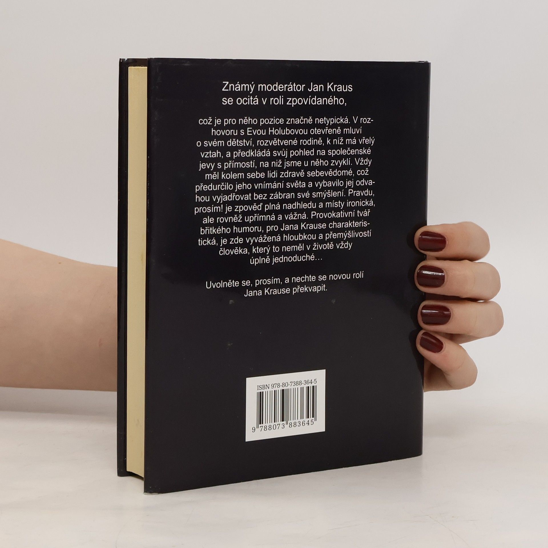 Známý moderátor Jan Kraus tentokrát v roli zpovídaného. V rozhovoru s Evou Holubovou otevřeně mluví o svém dětství, rozvětvené rodině a názorech na společnost. Zpověď plná nadhledu, místy ironická, ale rovněž upřímná a vážná. Provokativní tvář břitkého humoru je vyvážená hloubkou a přemýšlivostí.