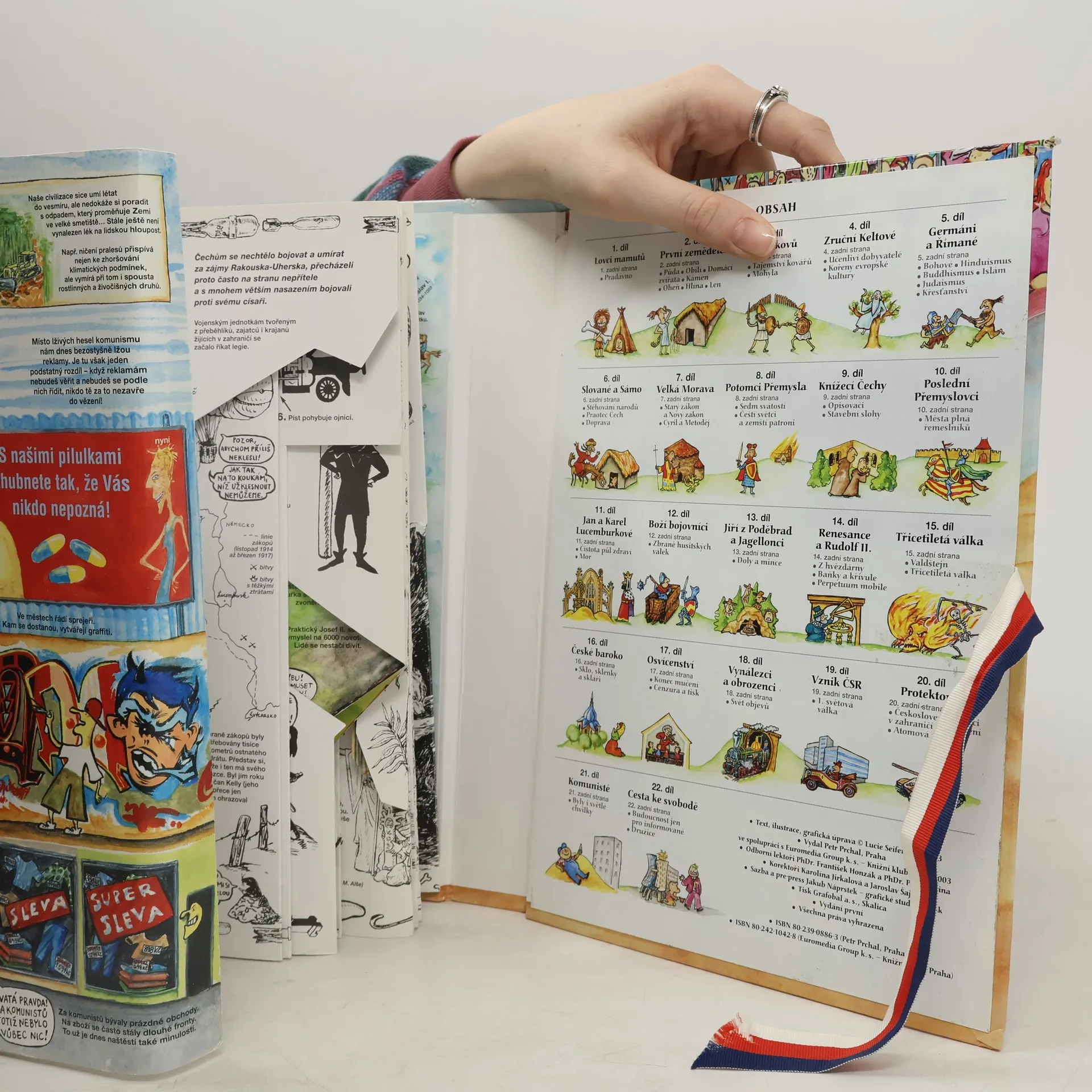 Tato „rodinná“ knížka pro děti i dospělé je určena nejen těm, co nedávali ve škole pozor (dozvědí se překvapivé informace z naší historie), ale i šprtům, ty zase pobaví (pro tyto vzdělanější čtenáře jsou připraveny zadní strany s podrobnějšími informacemi a zajímavostmi). Když rozložíme knihu jako harmonikovité leporelo, otevře se před námi 9 metrů dlouhá krajina v níž se odehrávají drobné děje od pravěkých lovců po současnost. Fakta, informace, chronologické tabulky ke všem obdobím nechybí a komixové textíky a kreslené postavičky umožní hledět na minulost a naše předky s humorem, nadsázkou a ironií. Tato kniha získala Magnesii Literu za knihu roku 2003 pro děti a mládež, Zlatou stuhu v kategorii Literatura faktu a populárně naučná literatura pro děti (za rok 2003) a Zlatů pečeť za polygrafické zpracování.