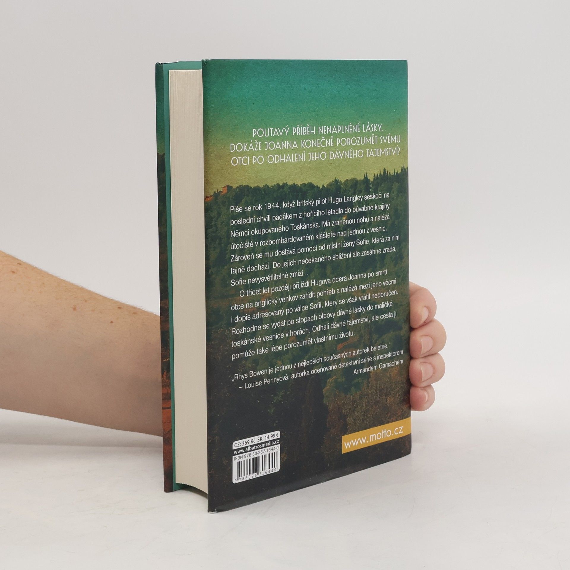 Poutavý příběh nenaplněné lásky. Dokáže Joanna konečně porozumět svému otci po odhalení jeho dávného tajemství? Píše se rok 1944, když britský pilot Hugo Langley seskočí na poslední chvíli padákem z hořícího letadla do půvabné krajiny Němci okupovaného italského Toskánska. Má těžce zraněnou nohu a nalézá útočiště v rozbombardovaném klášteře nad jednou z vesnic. Zároveň se mu dostává pomoci od místní mladé ženy Sofie, která za ním tajně dochází a pomůže mu zranění vyléčit. Do jejich nečekaného sblížení ale zasáhne zrada a Sofie nevysvětlitelně zmizí… Skoro o třicet let později přijíždí Hugova dcera Joanna po náhlé smrti otce na anglický venkov zařídit pohřeb a nalézá mezi jeho věcmi i dopis adresovaný po válce Sofii, který se však vrátil nedoručen. Rozhodne se proto vydat po stopách otcovy dávné lásky, o níž neměla dosud tušení, do maličké toskánské vesnice v horách. Nejenže odhalí dávné tajemství, ale cesta jí pomůže lépe porozumět také vlastnímu životu.