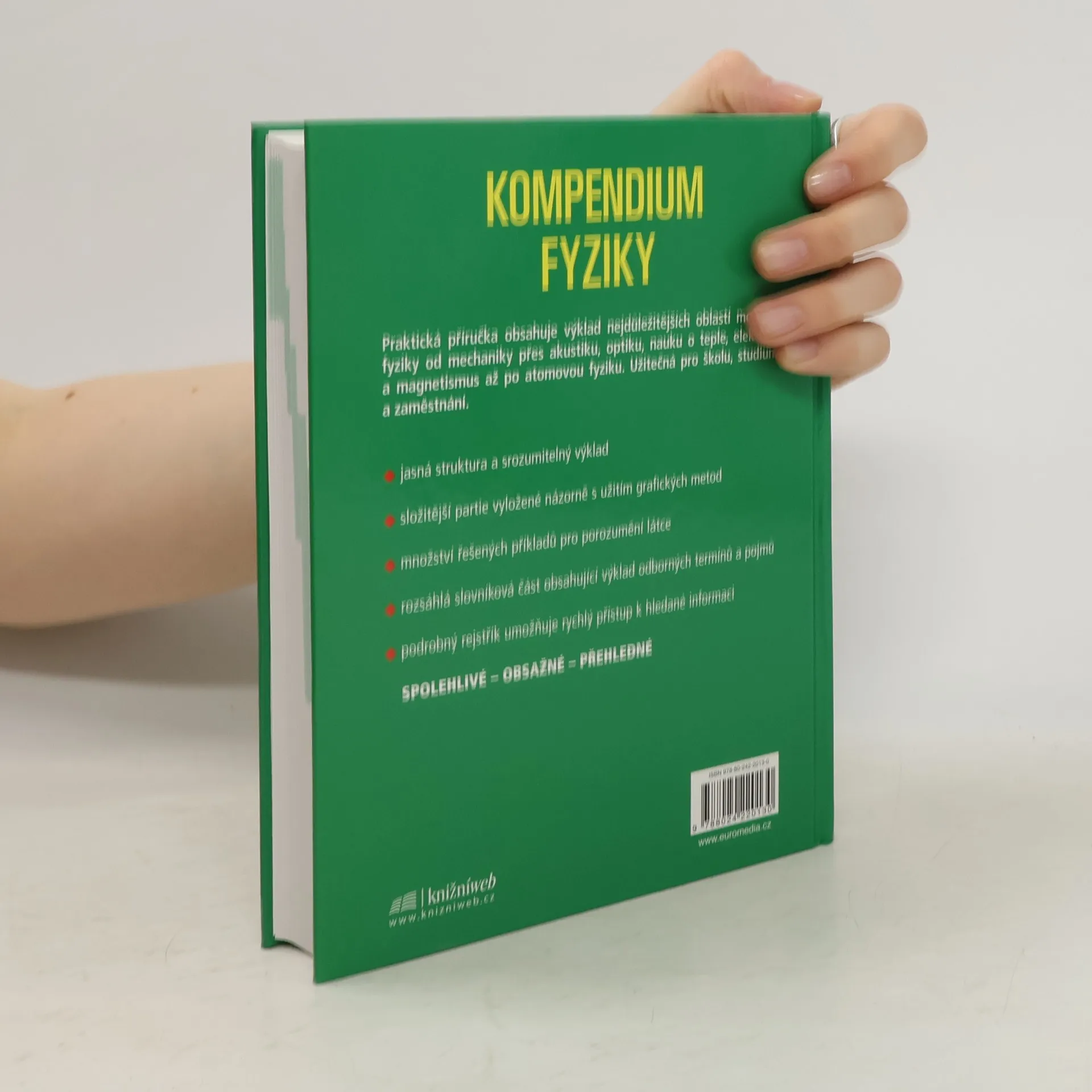 Kompendium fyziky Praktická příručka obsahuje výklad nejdůležitějších oblastí moderní fyziky od mechaniky přes akustiku, optiku, nauku o teple, elektřinu a magnetismus až po atomovou fyziku. Užitečná pro školu, studium a zaměstnání. - jasná struktura a srozumitelný výklad - složitější partie vyložené názorně s užitím grafických metod - množství řešených příkladů pro porozumění látce - rozsáhlá slovníková část obsahující výklad odborných termínů a pojmů - podrobný rejstřík umožňuje rychlý přístup k hledané informaci Spolehlivé - obsažné - přehledné