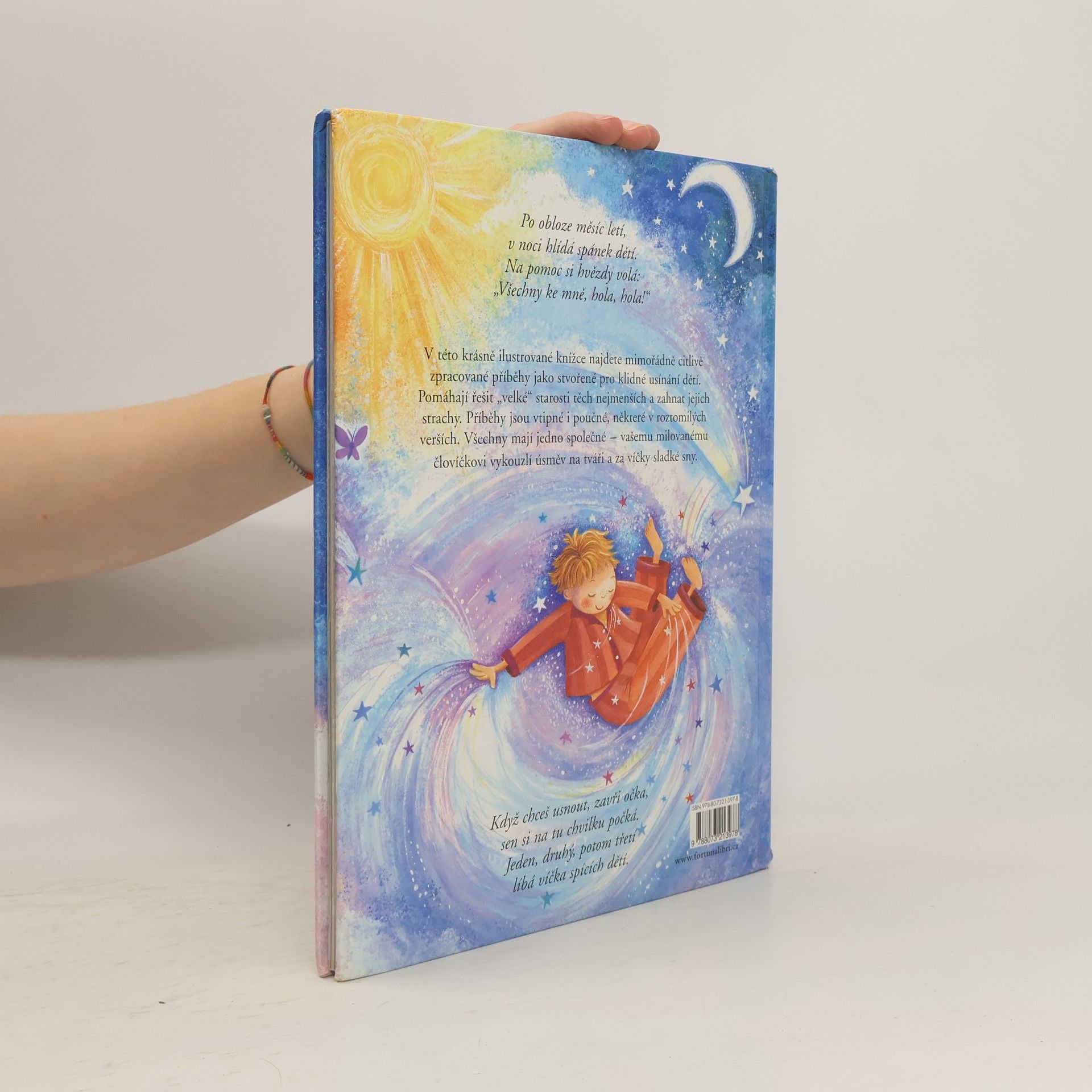 V této krásně ilustrované knížce najdete mimořádně citlivě zpracované příběhy jako stvořené pro klidné usínání dětí. Pomáhají řešit "velké" starosti těch nejmenších a zahnat jejich strachy. Příběhy jsou vtipné i poučné, některé v roztomilých verších. Všechny mají jedno společné - vašemu milovanému človíčkovi vykouzlí úsměv na tváři a za víčky sladké sny.