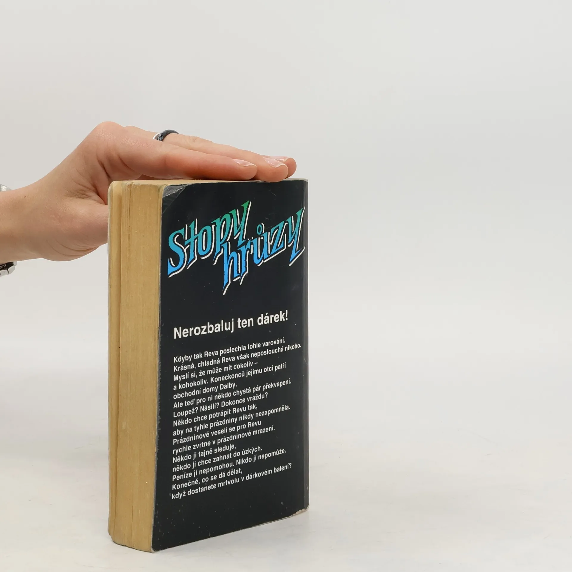 Stopy hrůzy 23, ze série Ulice strachu. „Nerozbaluj ten dárek!“ Kdyby tak Reva poslechla tohle varování. Krásná, chladná Reva však neposlouchá nikoho. Myslí si, že může mít cokoliv – a kohokoliv. Koneckonců jejímu otci patří obchodní dům Dalby. Ale teď pro ni někdo chystá překvapení. Loupež? Násilí? Dokonce vraždu? Někdo chce potrápit Revu tak, aby na tyhle prázdniny nikdy nezapomněla. Prázdninové veselí se pro Revu rychle zvrtne v prázdninové mrazení. Někdo ji tajně sleduje, někdo ji chce zahnat do úzkých. Peníze jí nepomohou. Nikdo jí nepomůže. Konečně, co se dá dělat, když dostanete mrtvolu v dárkovém balení?... celý text