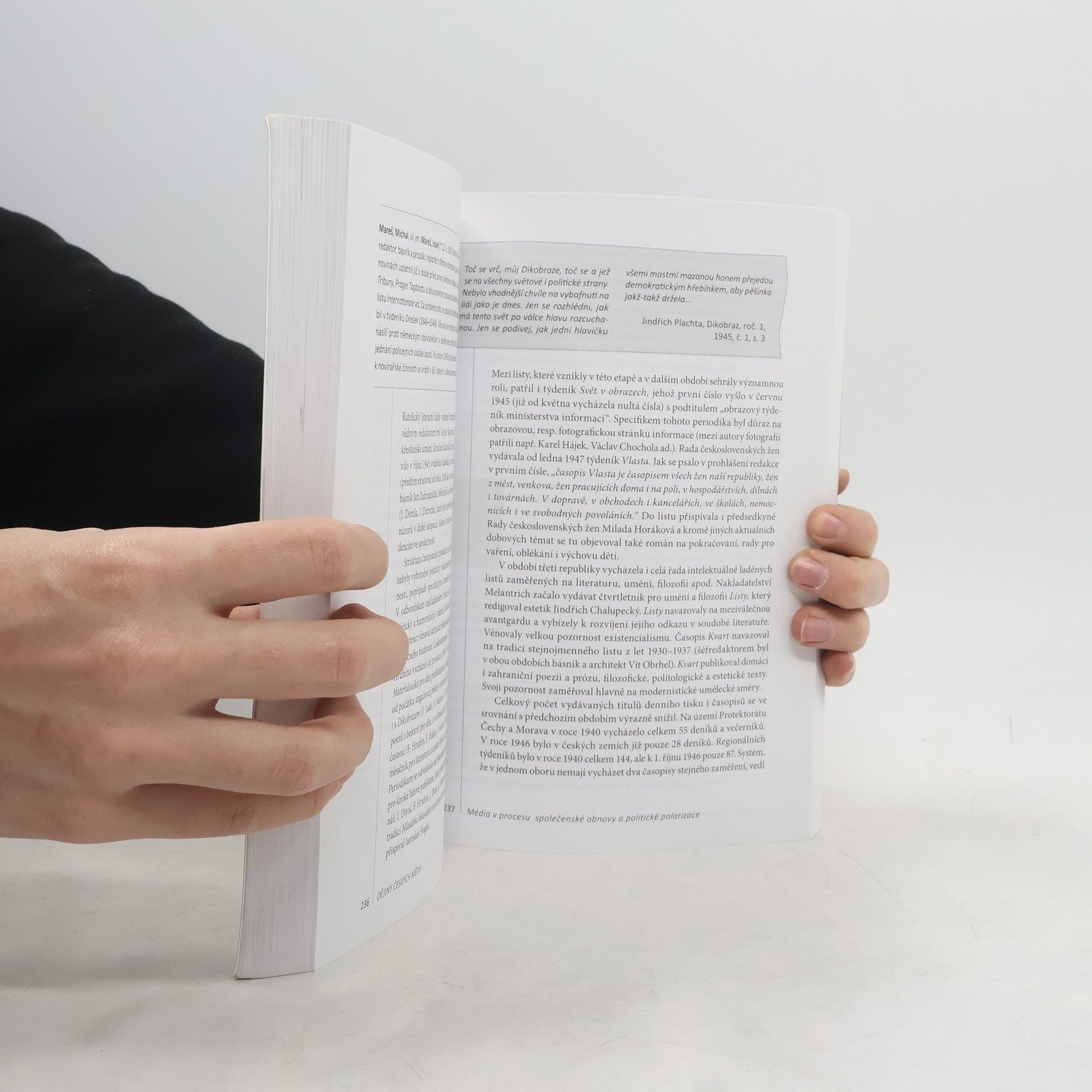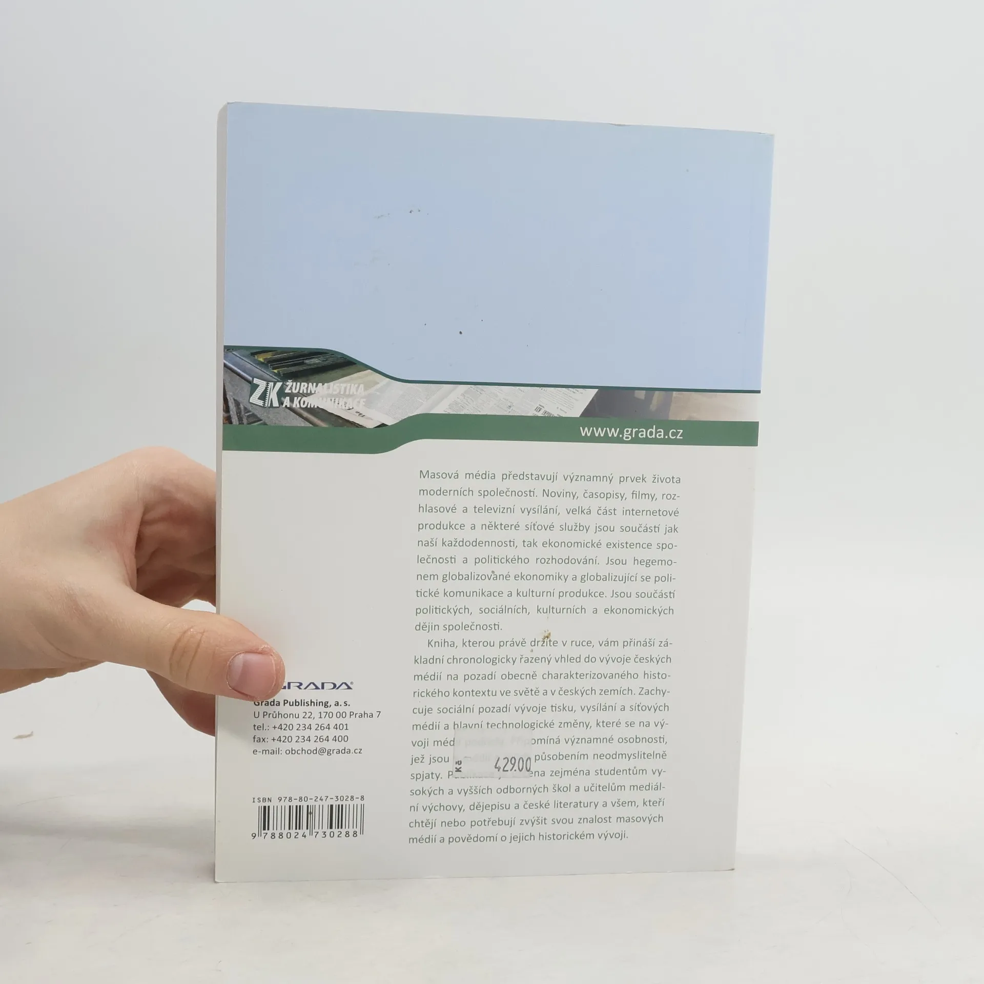 Kniha přináší základní chronologicky řazený vhled do vývoje českých médií na pozadí obecně charakterizovaného historického kontextu ve světě a v českých zemích. Zachycuje sociální pozadí vývoje tisku, vysílání a síťových médií a hlavní technologické změny, které se na vývoji médií podílely. Připomíná významné osobnosti, jež jsou s médii a jejich působením neodmyslitelně spjaty. Publikace je určena zejména studentům vysokých a vyšších odborných škol a učitelům mediální výchovy, dějepisu a české literatury a všem, kteří chtějí nebo potřebují zvýšit svou znalost masových médií a povědomí o jejich historickém vývoji.