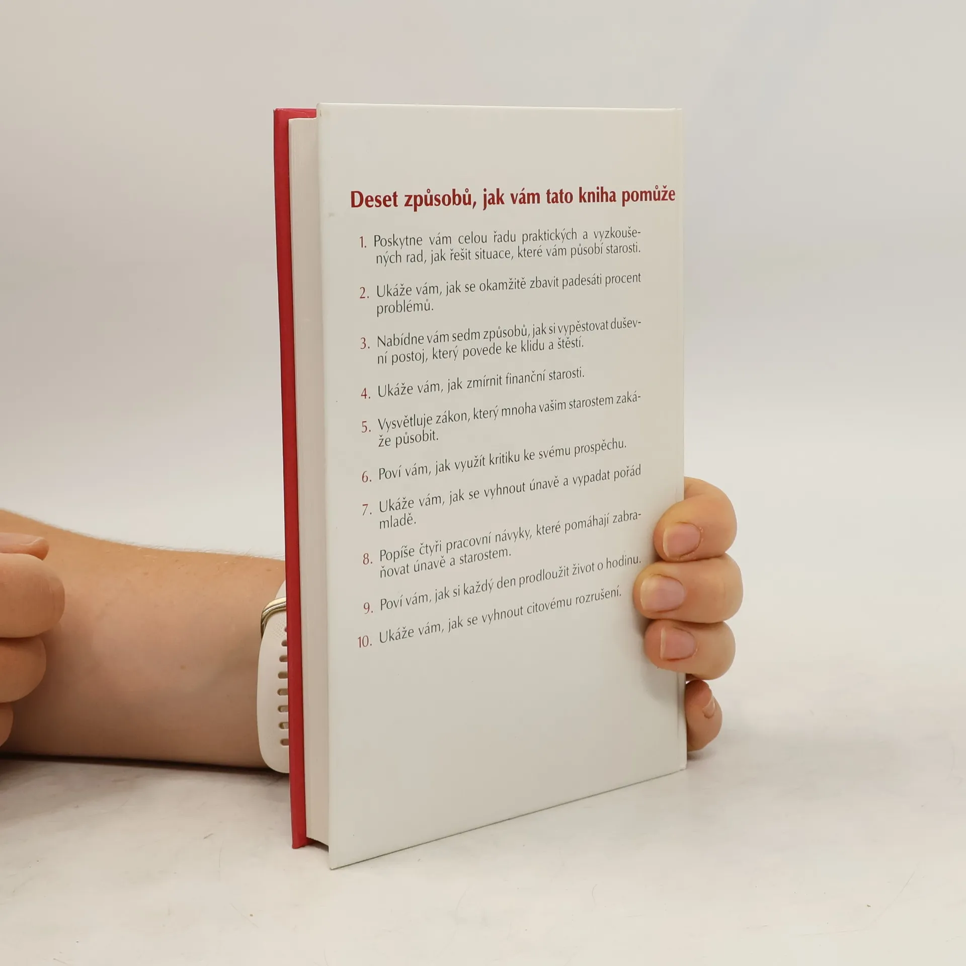Deset způsobů, jak vám tato kniha pomůže: 1. Poskytne vám celou řadu praktických a vyzkoušených rad, jak řešit situace, které vám působí starosti. 2. Ukáže vám, jak se okamžitě zbavit padesáti procent problémů. 3. Nabídne vám sedm způsobů, jak si vypěstovat duševní postoj, který povede ke klidu a štěstí. 4. Ukáže Vám, jak zmírnit finanční starosti. 5. Vysvětluje zákon, který mnoha vašim starostem zakáže působit. 6. Poví vám, jak využít kritiku ke svému prospěchu. 7. Ukáže vám, jak se vyhnout únavě a vypadat pořád mladě. 8. Popíše čtyři pracovní návyky, které pomáhají zabraňovat únavě a starostem. 9. Poví vám, jak si každý den prodloužit život o hodinu. 10. Ukáže vám, jak se vyhnout citovému rozrušení. (méně textu)