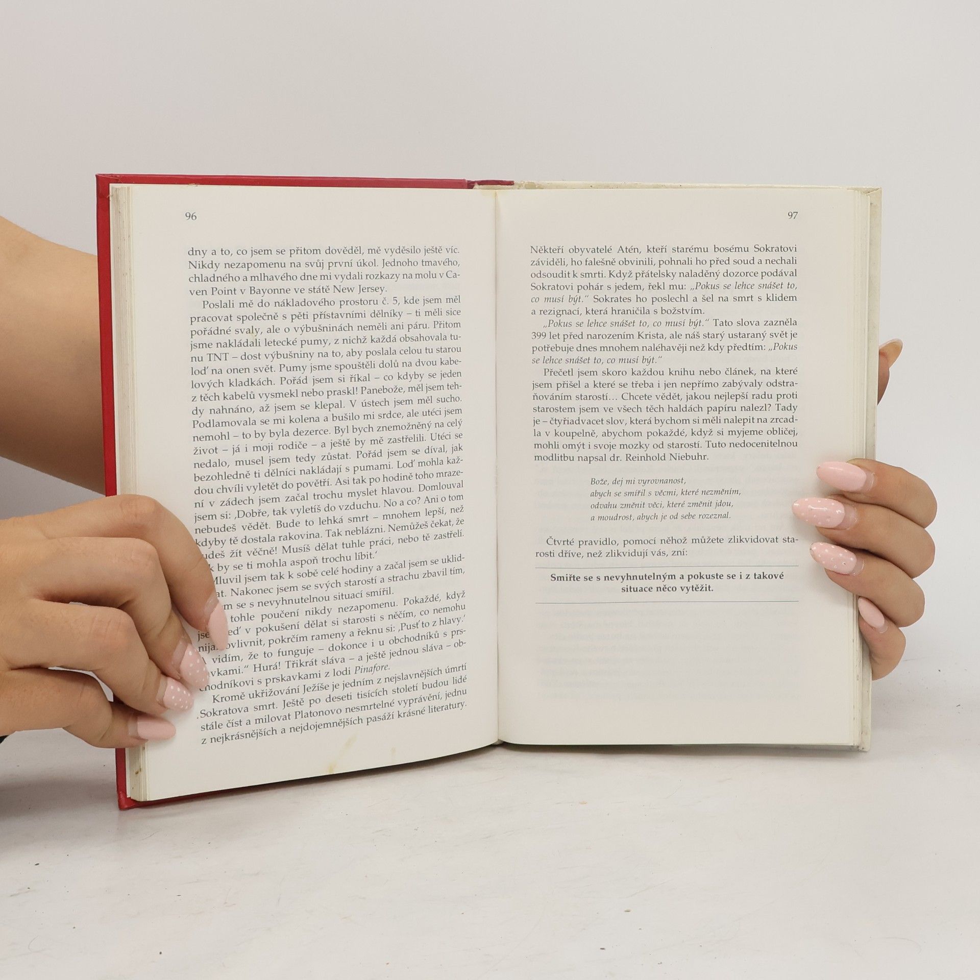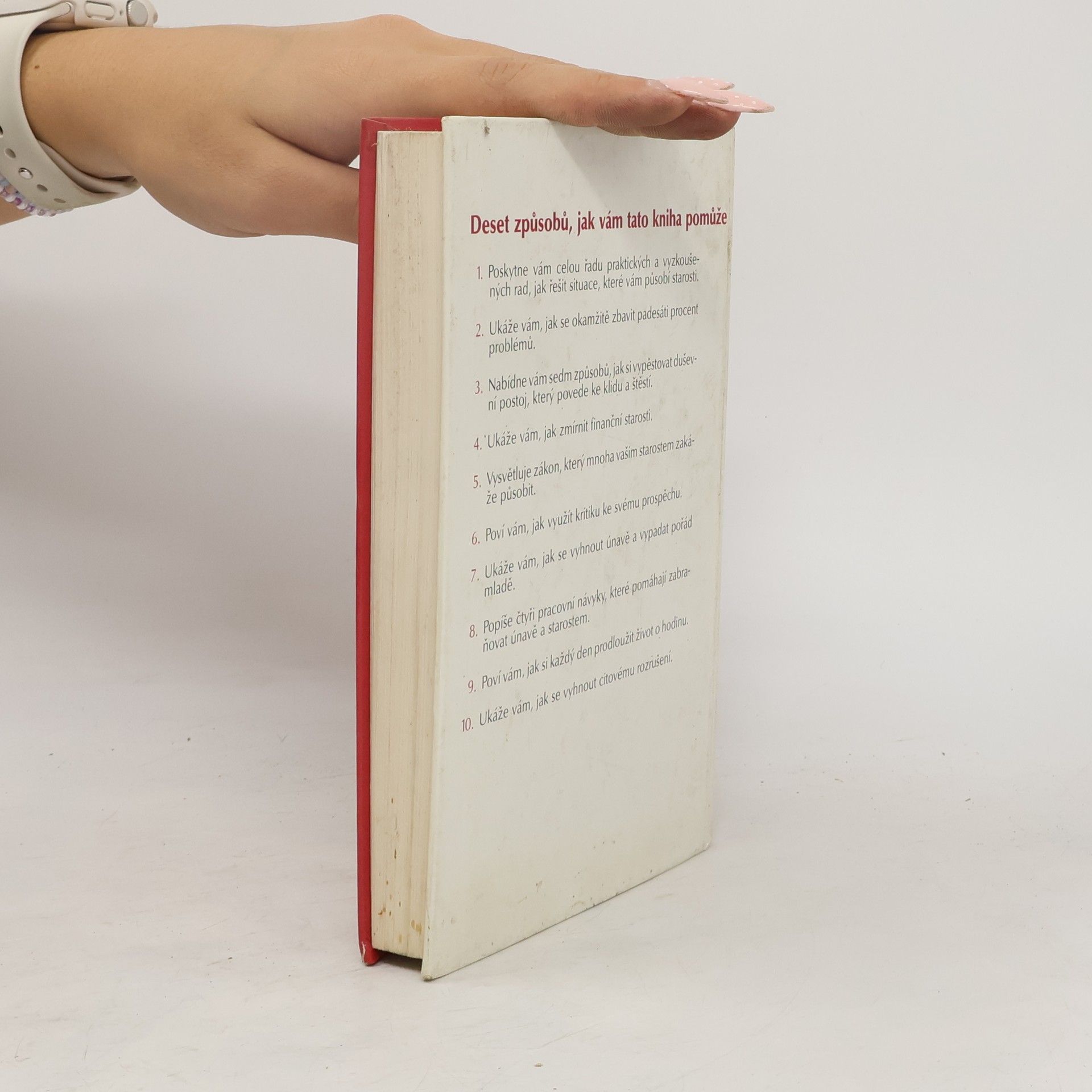 Deset způsobů, jak vám tato kniha pomůže: 1. Poskytne vám celou řadu praktických a vyzkoušených rad, jak řešit situace, které vám působí starosti. 2. Ukáže vám, jak se okamžitě zbavit padesáti procent problémů. 3. Nabídne vám sedm způsobů, jak si vypěstovat duševní postoj, který povede ke klidu a štěstí. 4. Ukáže Vám, jak zmírnit finanční starosti. 5. Vysvětluje zákon, který mnoha vašim starostem zakáže působit. 6. Poví vám, jak využít kritiku ke svému prospěchu. 7. Ukáže vám, jak se vyhnout únavě a vypadat pořád mladě. 8. Popíše čtyři pracovní návyky, které pomáhají zabraňovat únavě a starostem. 9. Poví vám, jak si každý den prodloužit život o hodinu. 10. Ukáže vám, jak se vyhnout citovému rozrušení. (méně textu)