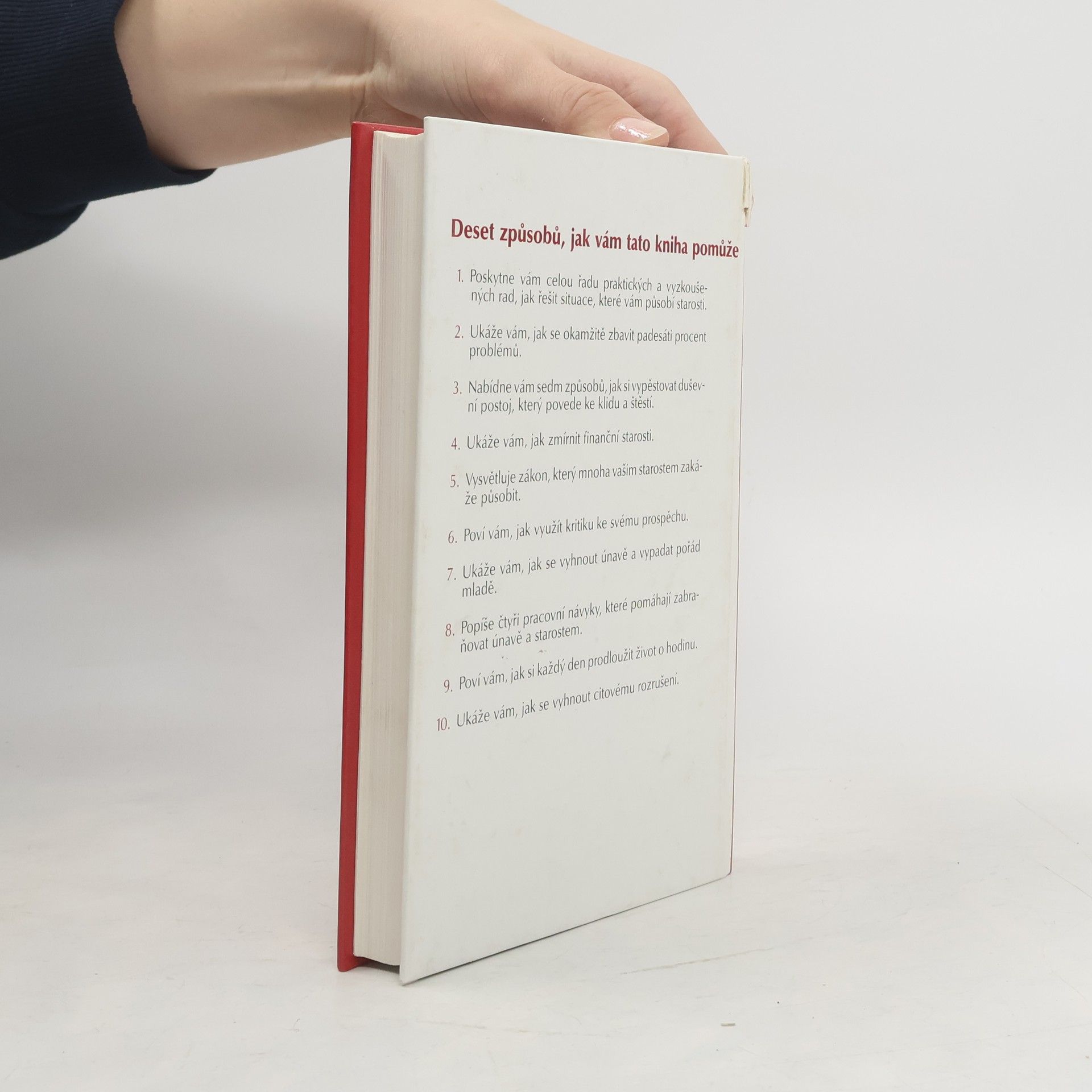 Deset způsobů, jak vám tato kniha pomůže: 1. Poskytne vám celou řadu praktických a vyzkoušených rad, jak řešit situace, které vám působí starosti. 2. Ukáže vám, jak se okamžitě zbavit padesáti procent problémů. 3. Nabídne vám sedm způsobů, jak si vypěstovat duševní postoj, který povede ke klidu a štěstí. 4. Ukáže Vám, jak zmírnit finanční starosti. 5. Vysvětluje zákon, který mnoha vašim starostem zakáže působit. 6. Poví vám, jak využít kritiku ke svému prospěchu. 7. Ukáže vám, jak se vyhnout únavě a vypadat pořád mladě. 8. Popíše čtyři pracovní návyky, které pomáhají zabraňovat únavě a starostem. 9. Poví vám, jak si každý den prodloužit život o hodinu. 10. Ukáže vám, jak se vyhnout citovému rozrušení. (méně textu)