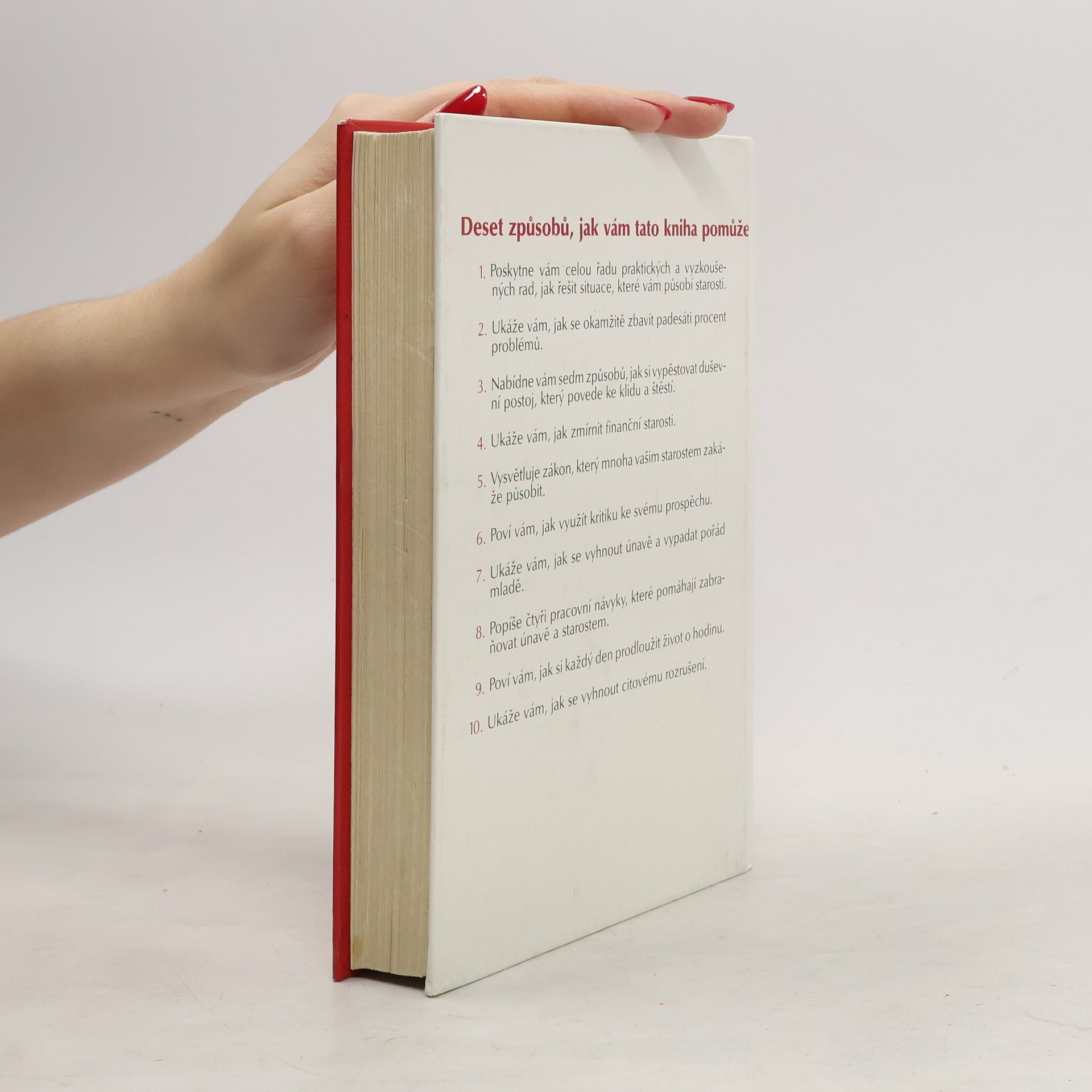 Deset způsobů, jak vám tato kniha pomůže: 1. Poskytne vám celou řadu praktických a vyzkoušených rad, jak řešit situace, které vám působí starosti. 2. Ukáže vám, jak se okamžitě zbavit padesáti procent problémů. 3. Nabídne vám sedm způsobů, jak si vypěstovat duševní postoj, který povede ke klidu a štěstí. 4. Ukáže Vám, jak zmírnit finanční starosti. 5. Vysvětluje zákon, který mnoha vašim starostem zakáže působit. 6. Poví vám, jak využít kritiku ke svému prospěchu. 7. Ukáže vám, jak se vyhnout únavě a vypadat pořád mladě. 8. Popíše čtyři pracovní návyky, které pomáhají zabraňovat únavě a starostem. 9. Poví vám, jak si každý den prodloužit život o hodinu. 10. Ukáže vám, jak se vyhnout citovému rozrušení. (méně textu)