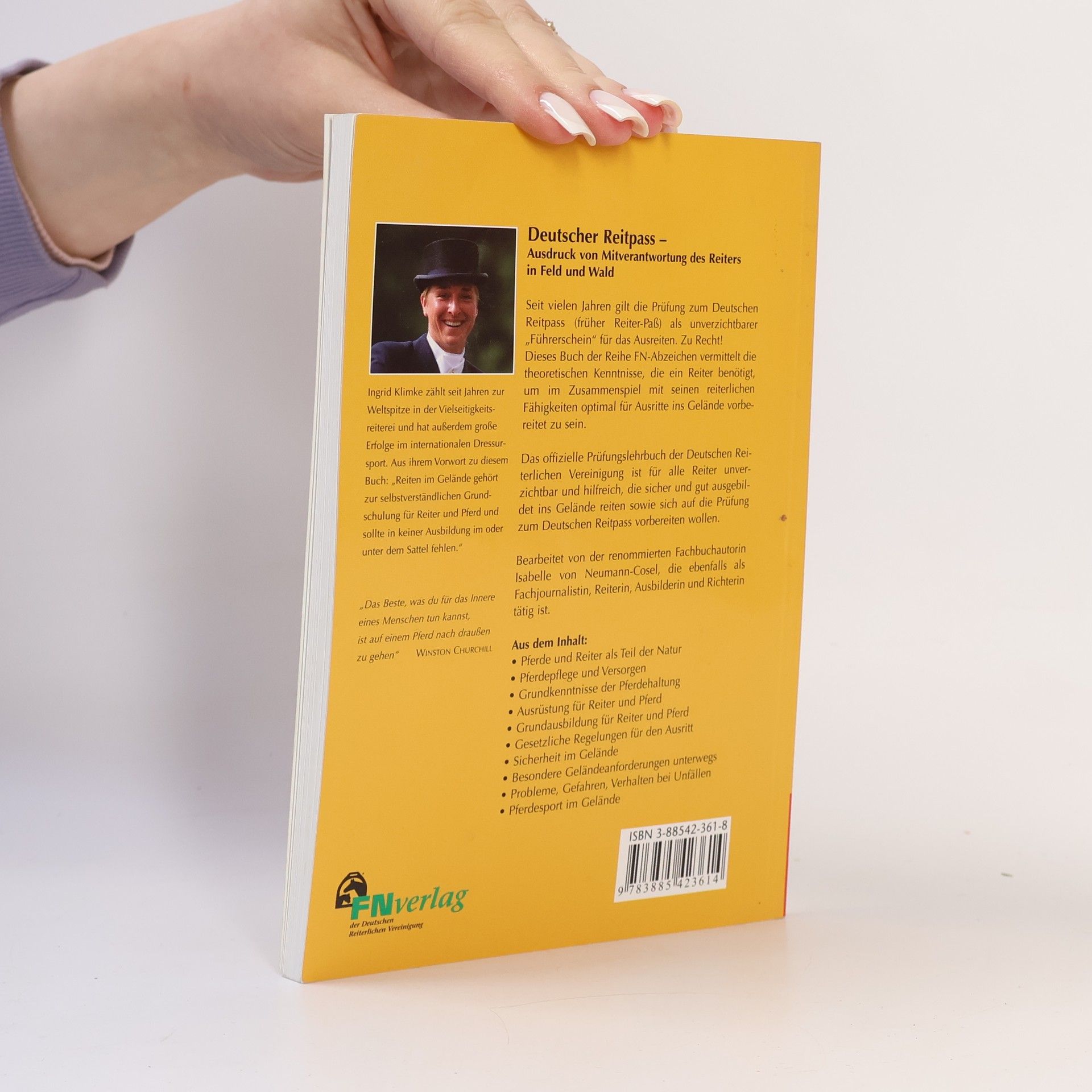 Seit vielen Jahren gilt die Prüfung zum Deutschen Reitpass (früher Reiter-Paß) als unverzichtbarer "Führerschein" für das Ausreiten. Dieses Buch der Reihe FN-Abzeichen vermittelt die theoretischen Kenntnisse, die ein Reiter benötigt, um im Zusammenspiel mit seinen reiterlichen Fähigkeiten optimal für Ausritte ins Gelände vorbereitet zu sein. In diesem Abzeichenbuch geht es um wichtiges Grundlagenwissen zum Thema Reiten im Gelände, Pferde und Reiter als Teil der Natur, Pferdepflege und Versorgen, Grundkenntnisse der Pferdehaltung, Ausrüstung für Reiter und Pferd, Grundausbildung für Reiter und Pferd, Gesetzliche Regelungen für den Ausritt, Sicherheit im Gelände, Besondere Geländeanforderungen unterwegs, Probleme, Gefahren , Verhalten bei Unfällen, Pferdesport im Gelände.
