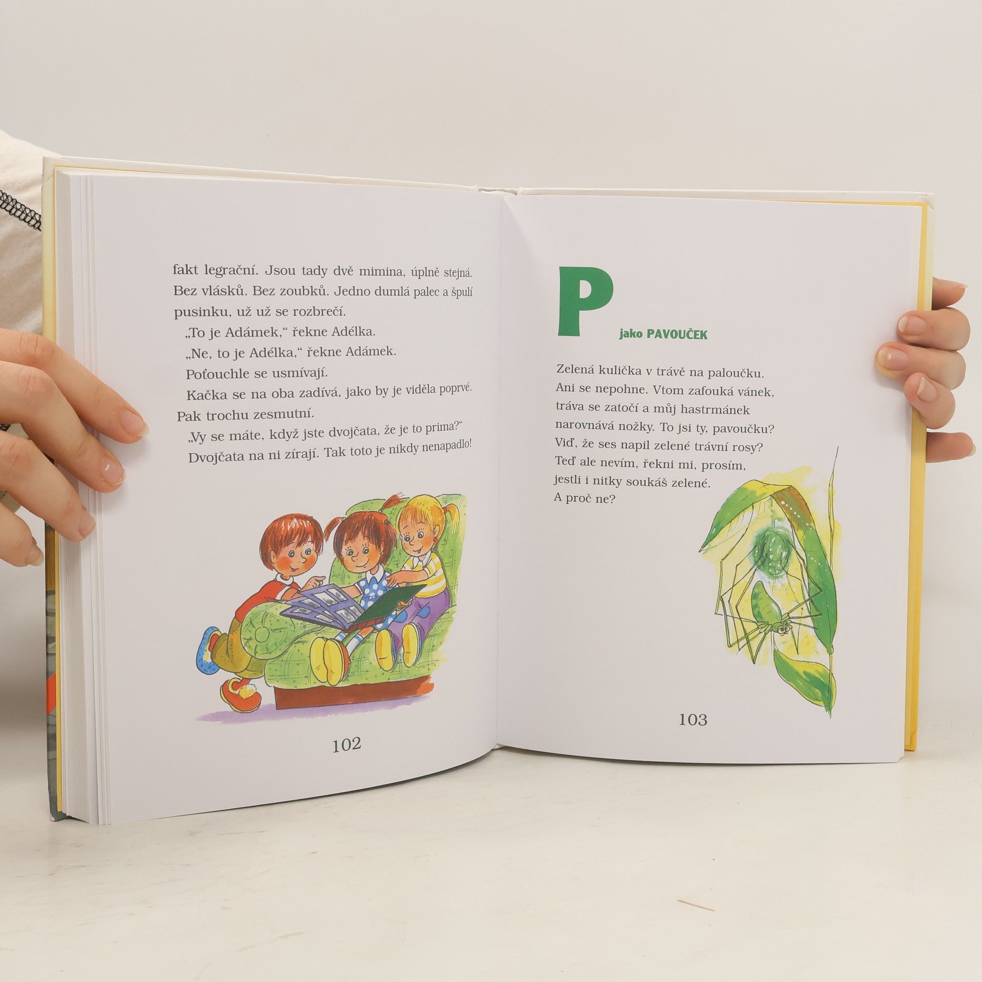 Adélka a Adámek jsou dvojčata. Adélka je o pět minut starší, z čehož je náležitě pyšná. Oba se učí první písmenka a rozvíjejí u toho svou fantazii. Knížka dětem nabízí hravé poznávání abecedy, ale hlavně 30 příběhů o těchto zvídavých dvojčatech. Každému písmenu v abecedě přináleží jedna básnička a jedna povídka.