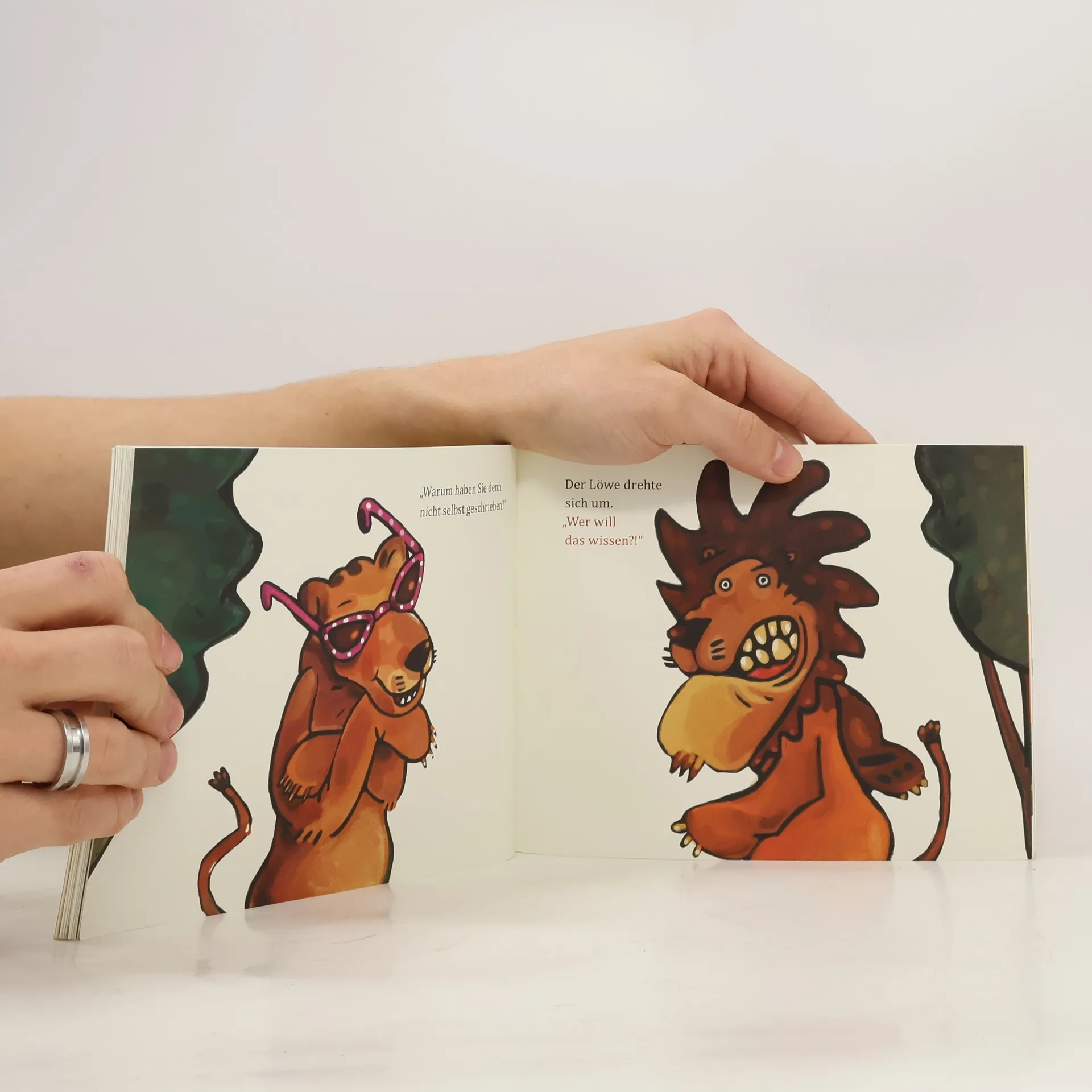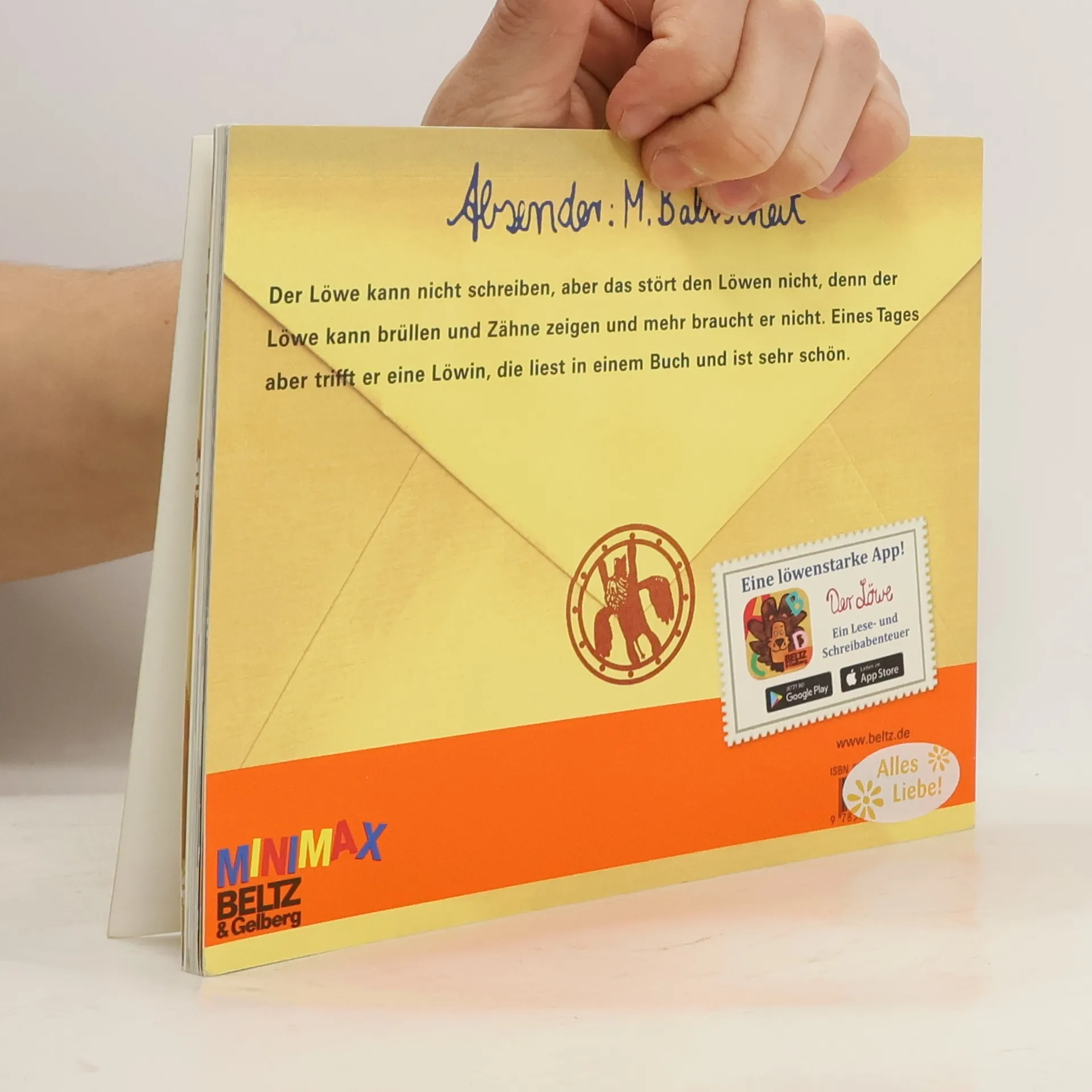 Bevor er sie küsst, soll der Löwe der schönen Löwin unbedingt einen Brief schreiben. Da er nicht weiß, wie das geht, bittet er Affe, Nilpferd und Giraffe, ihm zu helfen. Doch was die schreiben, gefällt dem Löwen keineswegs. Wie soll er bloß die Löwin kennen lernen?