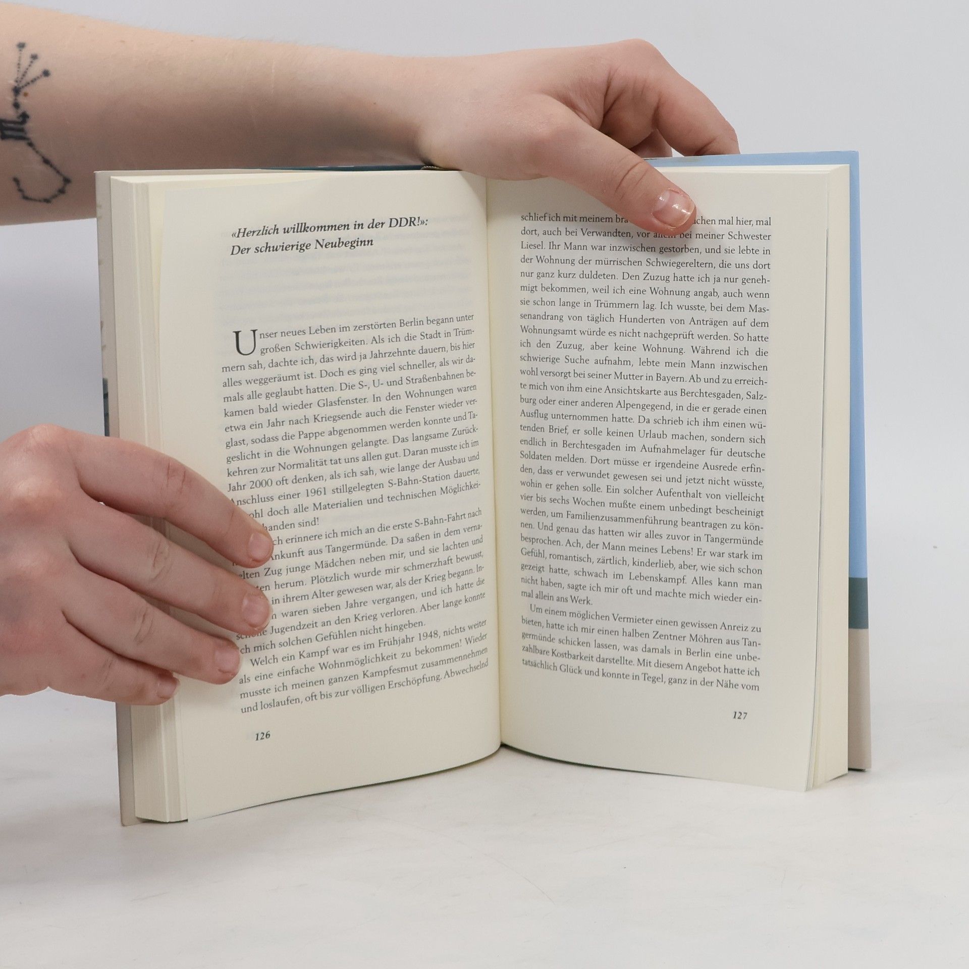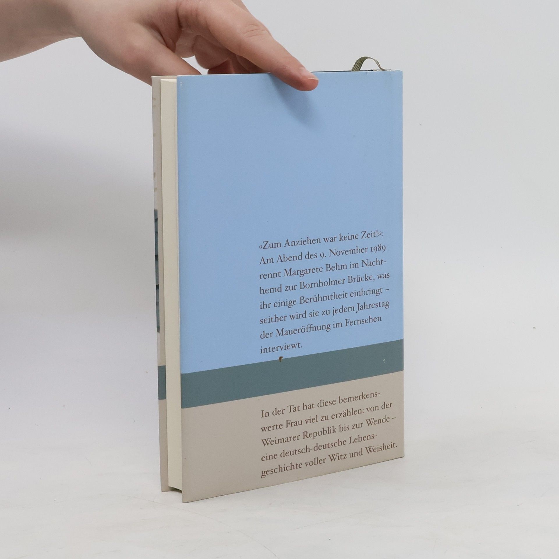 Margarete Behm, geboren 1919 in Berlin, verbrachte ihre Kindheit in ärmsten Verhältnissen. Konfirmandenunterricht hatte sie bei Dietrich Bonhoeffer, der ihre kritische Distanz zum Nationalsozialismus prägte. Während des Krieges arbeitete sie als Rotkreuz-Schwester. 1942 wurde ihre erste Tochter geboren. Ihr Mann, ein charmanter Hallodri, trug nach dem Krieg nicht viel zum Haushalt bei. Nach dem Mauerbau trickste sie Vopos aus und schaffte sich mit Charme und Chuzpe ein paar kleine Freiheiten, was ihr noch leichter fiel, als sie Witwe wurde. Am Tag nach der Maueröffnung rannte sie im Nachthemd zur Bornholmer Brücke – und wurde so zur Berühmtheit. Margarete Behm starb 2005.