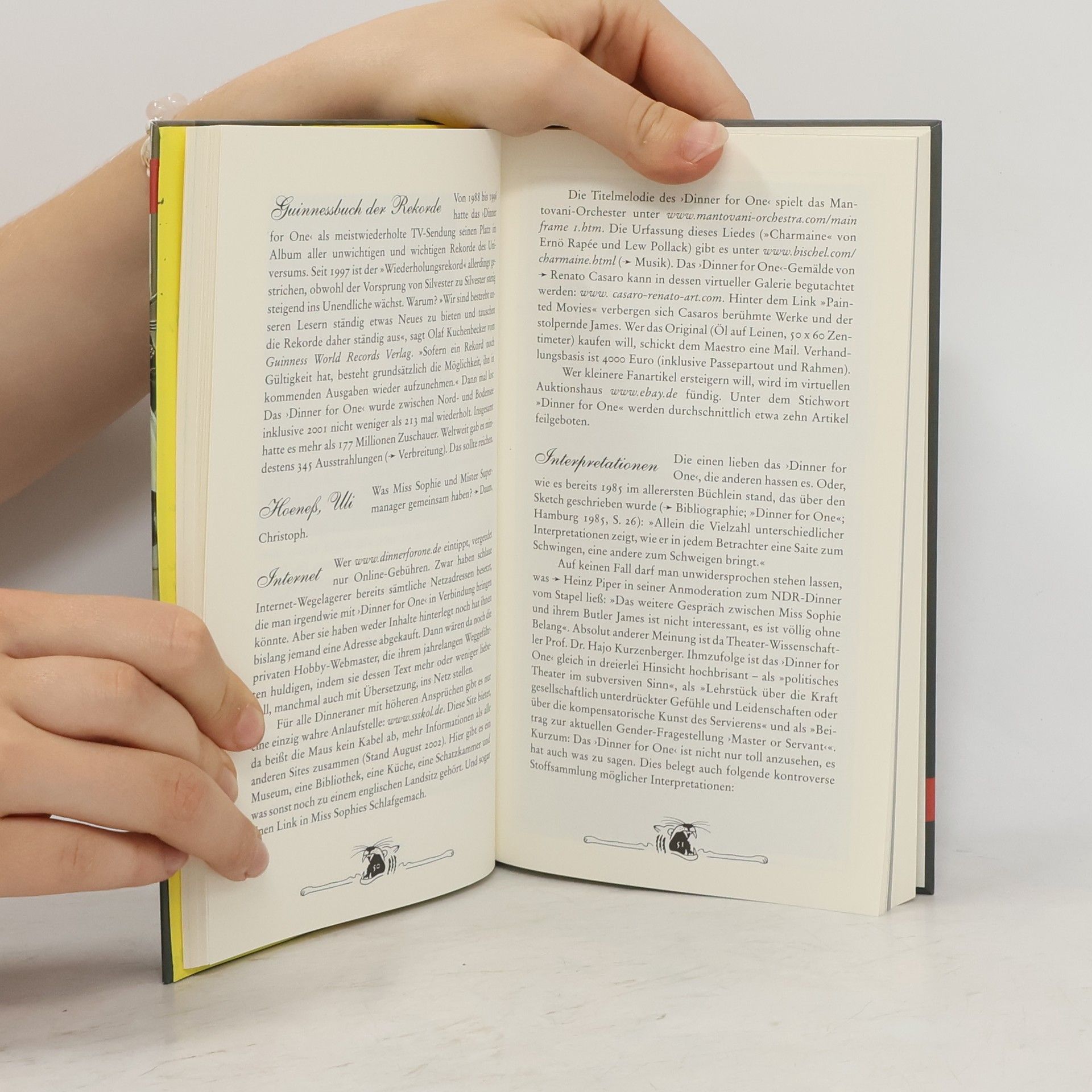 Alle kennen "Dinner for One". Aber wer kennt schon die entscheidenden Details: Woher die Namen der stummen Gäste stammen. Wer "Dinner for One" nach Deutschland brachte - und wie schwierig das war. Mit welchem Material der Tigerkopf ausgestopft ist. Was Freddie Frinton alias Butler James sonst noch für Rollen spielte. Und ob der "Sherry with the soup" trocken oder halbtrocken ist. Was auch immer man wissen will - es steht im Dinner for One-Lexikon. Ein unentbehrliches Nachschlagewerk, das hohe Einschaltquoten erzielen wird.