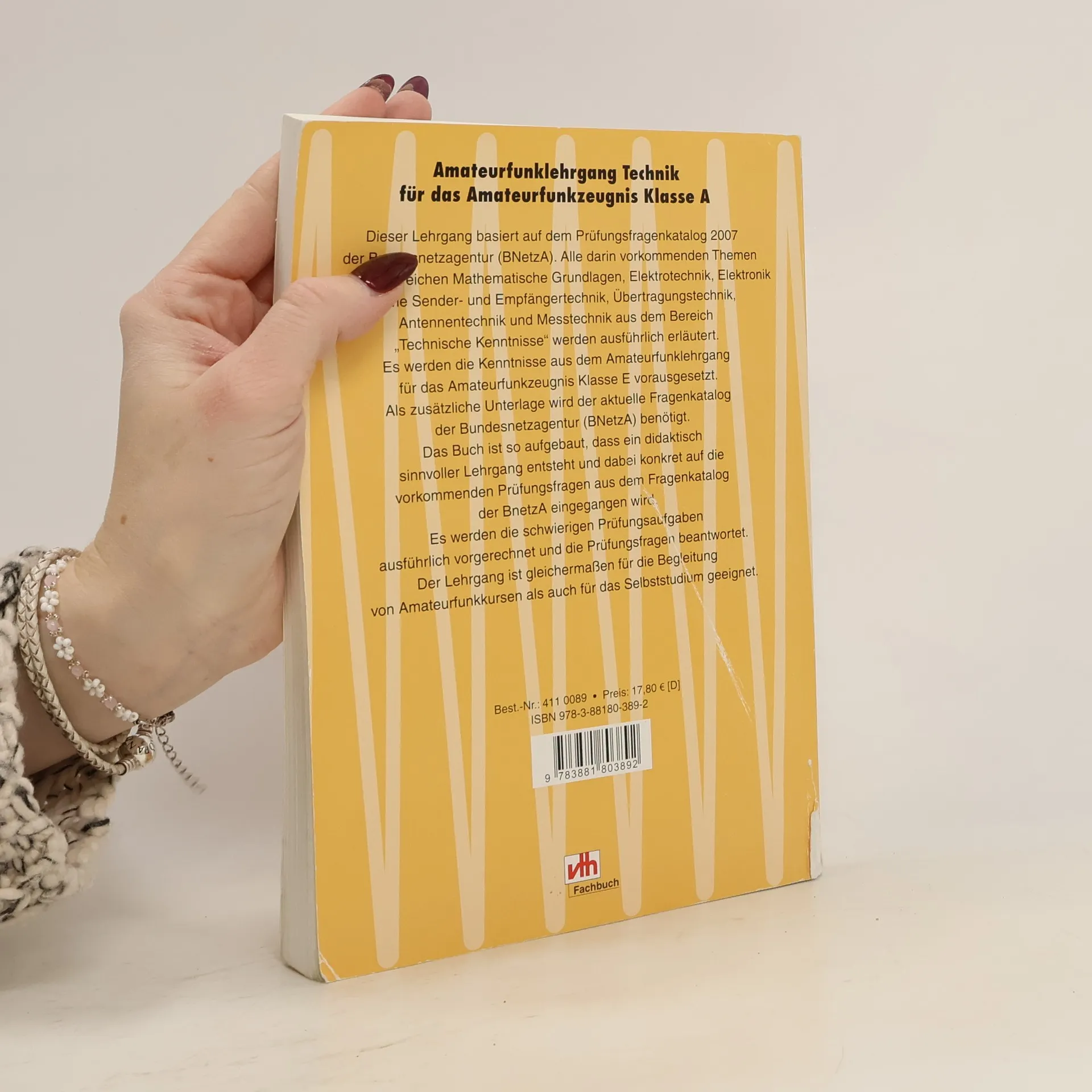 Dieser Lehrgang basiert auf dem Prüfungsfragenkatalog 2007 der Bundesnetzagentur (BNetzA). Alle darin vorkommenden Themen aus den Bereichen Mathematische Grundlagen, Elektrotechnik, Elektronik sowie Sender- und Empfängertechnik, Übertragungstechnik, Antennentechnik und Messtechnik aus dem Bereich "Technische Kenntnisse" werden ausführlich erläutert. Es werden die Kenntnisse aus dem Amateurfunklehrgang für das Amateurfunkzeugnis Klasse E vorausgesetzt. Als zusätzliche Unterlage wird der aktuelle Fragenkatalog der Bundesnetzagentur (BNetzA) benötigt. Das Buch ist so aufgebaut, dass ein didaktisch sinnvoller Lehrgang entsteht und dabei konkret auf die vorkommenden Prüfungsfragen aus dem Fragenkatalog der BNetzA eingengangen wird. Es werden die schwierigen Prüfungsaufgaben beantwortet. Der Lehrgang ist gleichermaßen für die Begleitung von Amateurfunkkursen als auch für das Selbststudium geeignet.