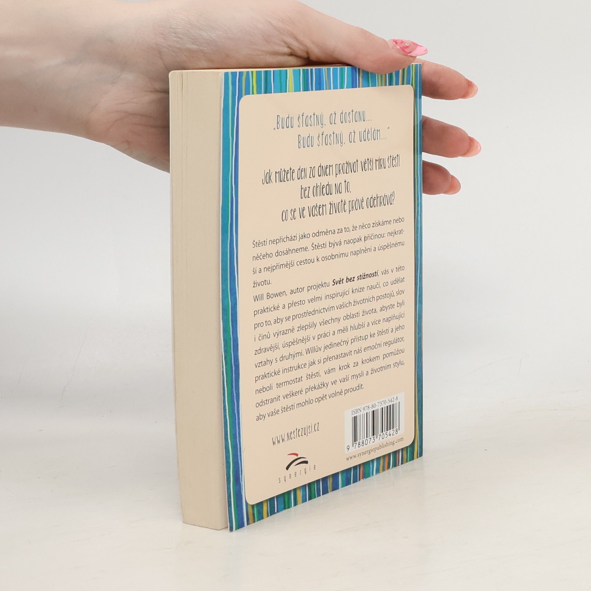 Jak můžete den za dnem prožívat větší míru štěstí bez ohledu na to, co se ve vašem životě právě odehrává? Štěstí nepřichází jako odměna za to, že něco získáme nebo něčeho dosáhneme. Štěstí bývá naopak příčinou: nejkratší a nejpřímější cestou k osobnímu naplnění a úspěšnému životu. Will Bowen, autor projektu Svět bez stížností, vás v této praktické a přesto velmi inspirující knize naučí, co udělat pro to, aby se prostřednictvím vašich životních postojů, slov i činů výrazně zlepšily všechny oblasti života, abyste byli zdravější, úspěšnější v práci a měli hlubší a více naplňující vztahy s druhými. Willův jedinečný přístup ke štěstí a jeho praktické instrukce jak si přenastavit náš emoční regulátor, neboli termostat štěstí, vám krok za krokem pomůžou odstranit veškeré překážky ve vaší mysli a životním stylu, aby vaše štěstí mohlo opět volně proudit.