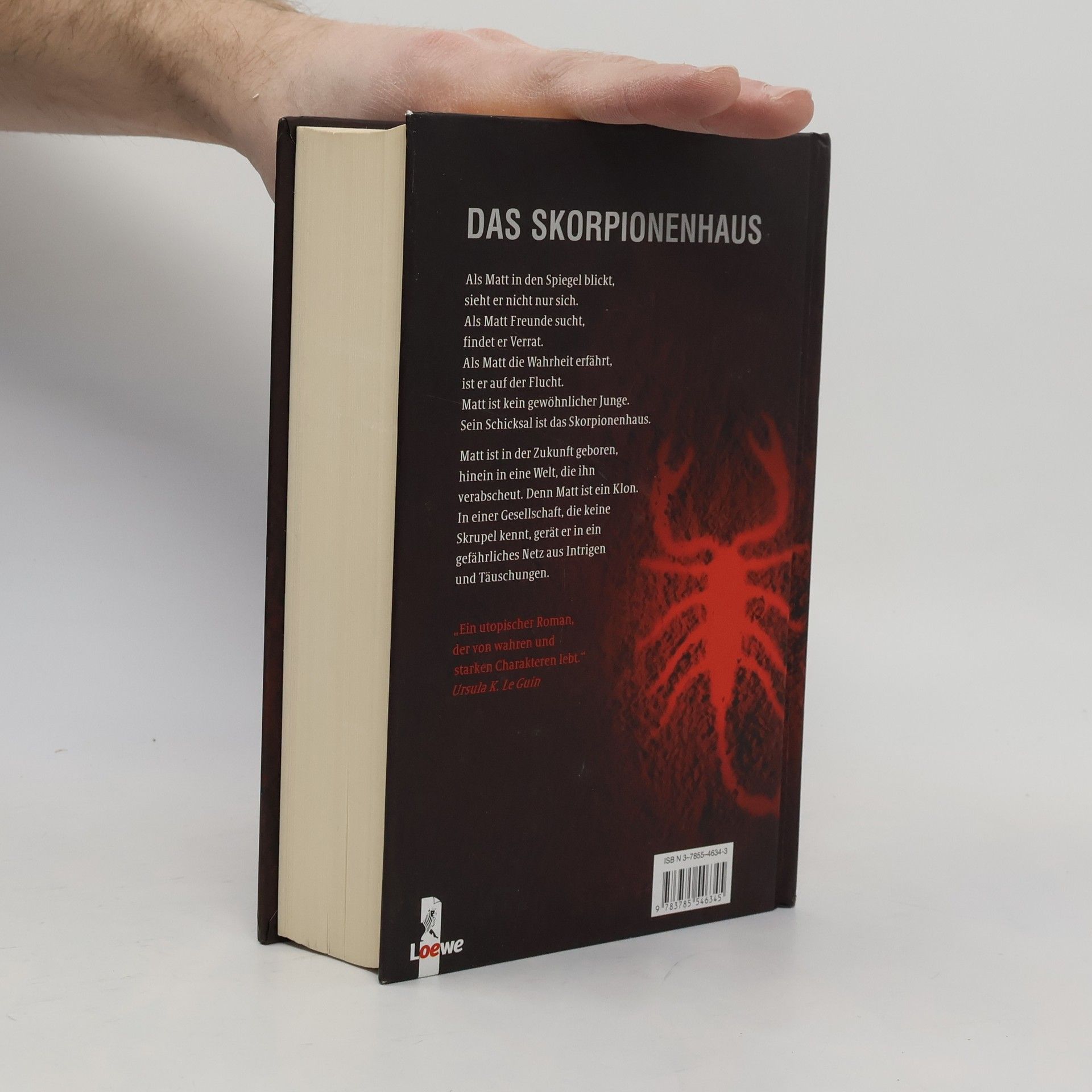 Als Matt in den Spiegel blickt, sieht er nicht nur sich. Als Matt Freunde sucht, findet er Verrat. Als Matt die Wahrheit erfährt, ist er auf der Flucht. Matt ist kein gewöhnlicher Junge Sein Schicksal ist das Skorpionenhaus. Matt ist in der Zukunft geboren, hinein in eine Welt, die ihn verabscheut. Denn Matt ist ein Klon. In einer Gesellschaft, die keine Skrupel kennt, gerät er in ein gefährliches Netz aus Intrigen und Täuschungen. „Ein utopischer Roman, der von wahren und starken Charakteren lebt - Menschen, die sich wirklich um andere sorgen, Kinder, die unsicher und verletzlich sind, mächtige Diktatoren, die man bedauern muss, charakterstarke und sympathische Menschen, die schreckliche Fehler machen.“ Ursula K. Le Guin Die Amerikanische Originalausgabe von „Das Skorpionenhaus“ wurde im Oktober 2002 mit dem „National Book Award“, dem wichtigsten amerikanischen Literaturpreis, ausgezeichnet. Im Oktober 2004 wurde „Das Skorpionenhaus“ mit dem „Buxtehuder Bullen“ als bestes Jugendbuch des Jahres 2003 ausgez