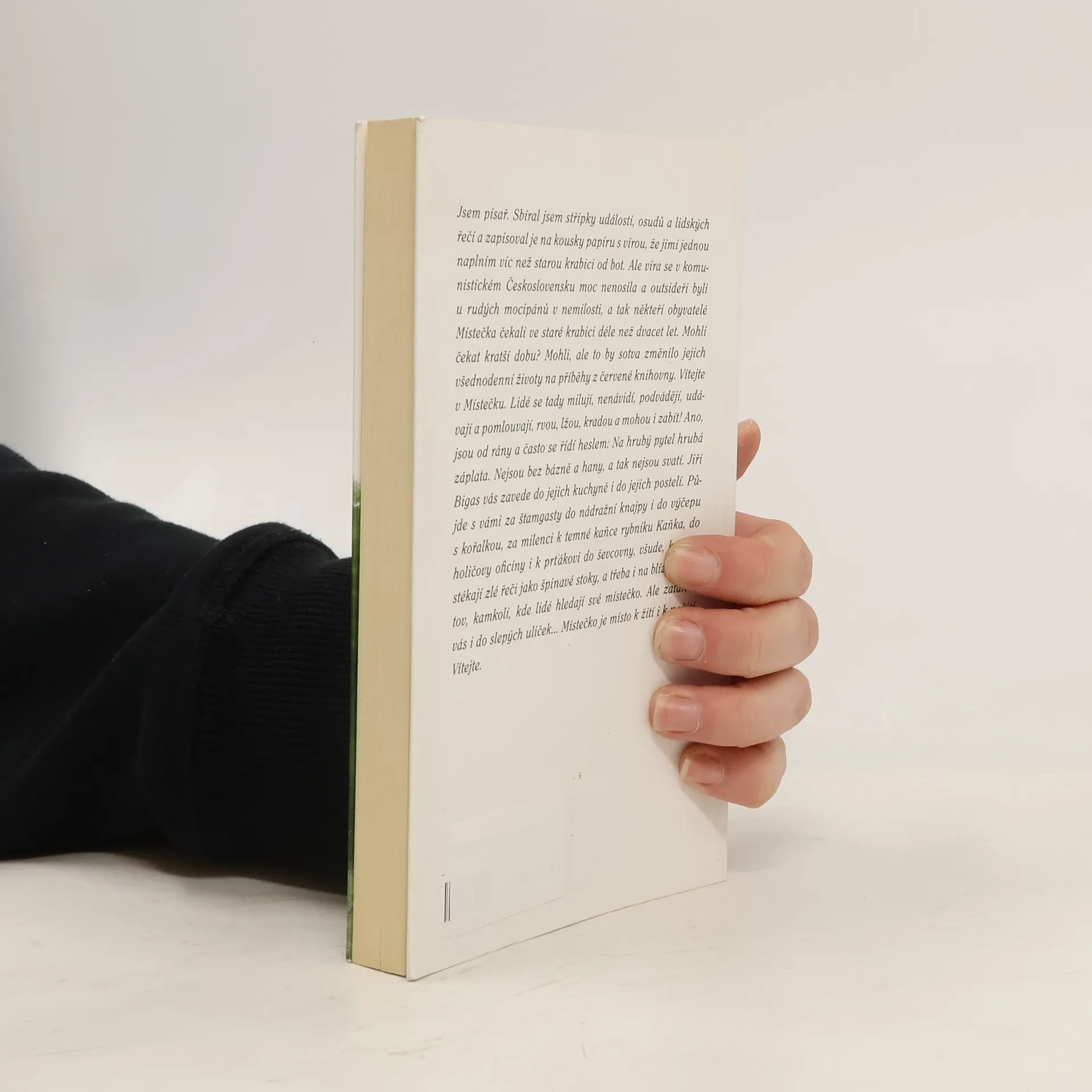 Vítejte v Místečku. Lidé se tady milují, nenávidí, podvádějí, udávají a pomlouvají, rvou, lžou, kradou a mohou i zabít! Ano, jsou od rány a často se řídí heslem: Na hrubý pytel hrubá záplata. Nejsou bez bázně a hany, a tak nejsou svatí. Jiří Bigas vás zavede do jejich kuchyně i do jejich postelí. Půjde s vámi za štamgasty do nádražní knajpy i do výčepu s kořalkou, za milenci k temné kaňce rybníku Kaňka, do holičovy oficíny i k prťákovi do ševcovny, všude, kam se stékají zlé řeči jako špinavé stoky, a třeba i na blízký hřbitov, kamkoli, kde lidé hledají své místečko. Ale zatáhne vás i do slepých uliček… Místečko je místo k žití i k nežití. Vítejte.