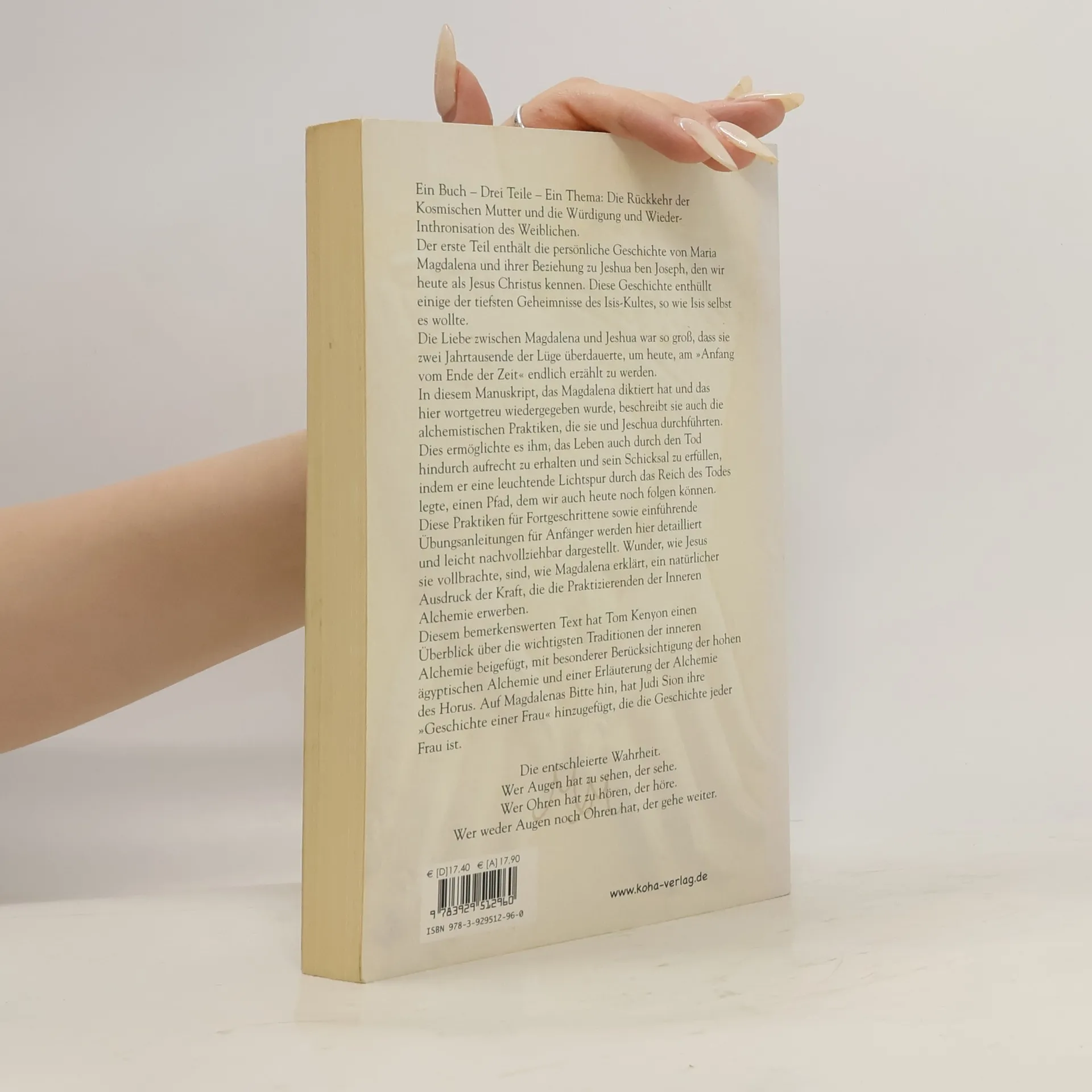 Ein Buch – Drei Teile – Ein Thema: Die Rückkehr der Kosmischen Mutter und die Würdigung und Wieder-Inthronisation des Weiblichen. Der erste Teil enthält die persönliche Geschichte von Maria Magdalena und ihrer Beziehung zu Jeshua ben Joseph, den wir heute als Jesus Christus kennen. Diese Geschichte enthüllt einige der tiefsten Geheimnisse des Isis-Kultes, so wie Isis selbst es wollte. Die Liebe zwischen Magdalena und Jeshua war so groß, dass sie zwei Jahrtausende der Lüge überdauerte, um heute, am „Anfang vom Ende der Zeit“ endlich erzählt zu werden. In diesem Manuskript, das Magdalena diktiert hat und das hier wortgetreu wiedergegeben wurde, beschreibt sie auch die alchemistischen Praktiken, die sie und Jeshua durchführten. Diese Praktiken für Fortgeschrittene sowie einführende Übungsanleitungen für Anfänger werden hier detailliert und leicht nachvollziehbar dargestellt. Wunder, wie Jesus sie vollbrachte, sind, wie Magdalena erklärt, ein natürlicher Ausdruck der Kraft, die die Praktizierenden der Inneren Alchemie erwerben. Diesem bemerkenswerten Text hat Tom Kenyon einen Überblick über die wichtigsten Traditionen der inneren Alchemie beigefügt, mit besonderer Berücksichtigung der hohen ägyptischen Alchemie und einer Erläuterung der Alchemie des Horus. Auf Magdalenas Bitte hin, hat Judi Sion ihre „Geschichte einer Frau“ hinzugefügt, die die Geschichte jeder Frau ist.