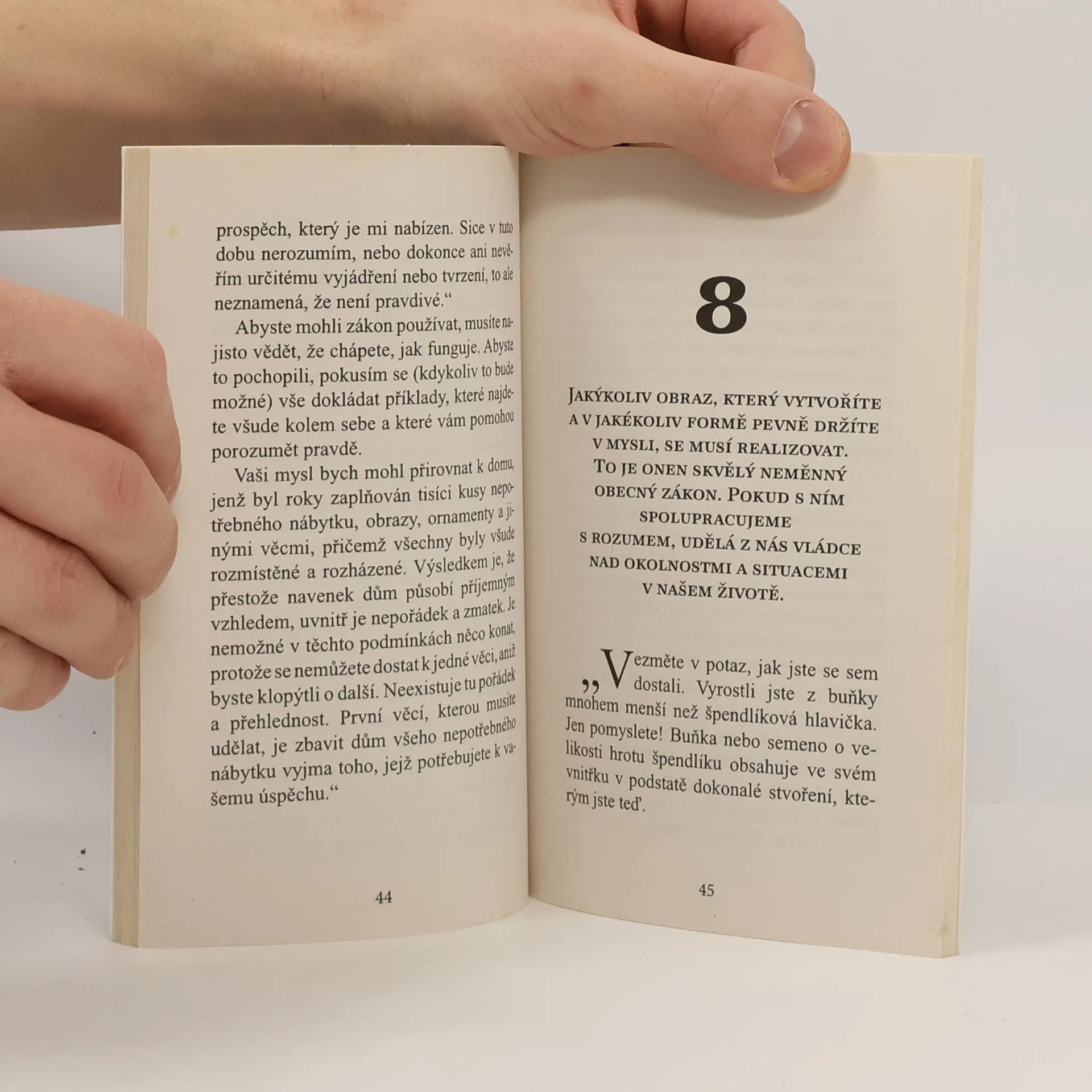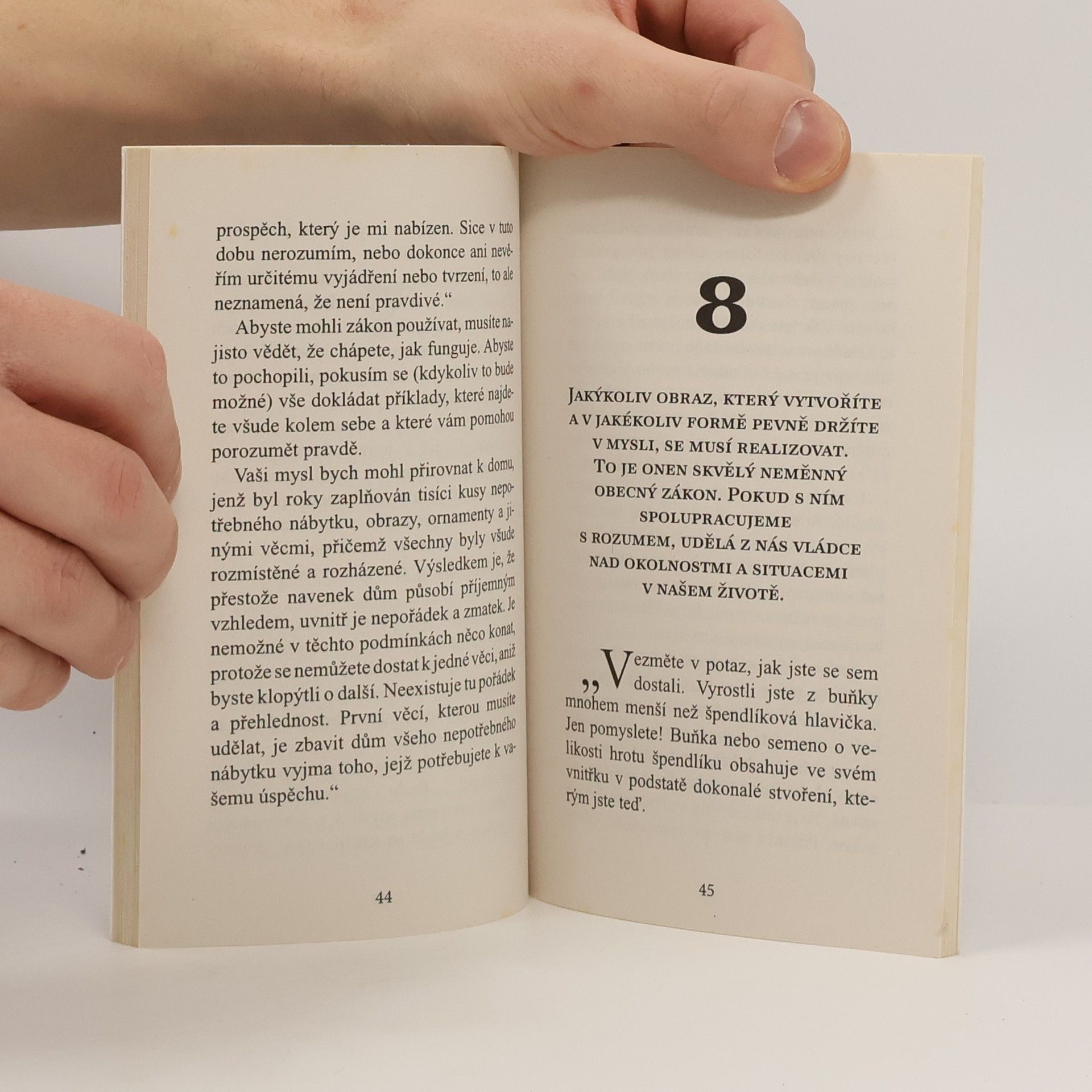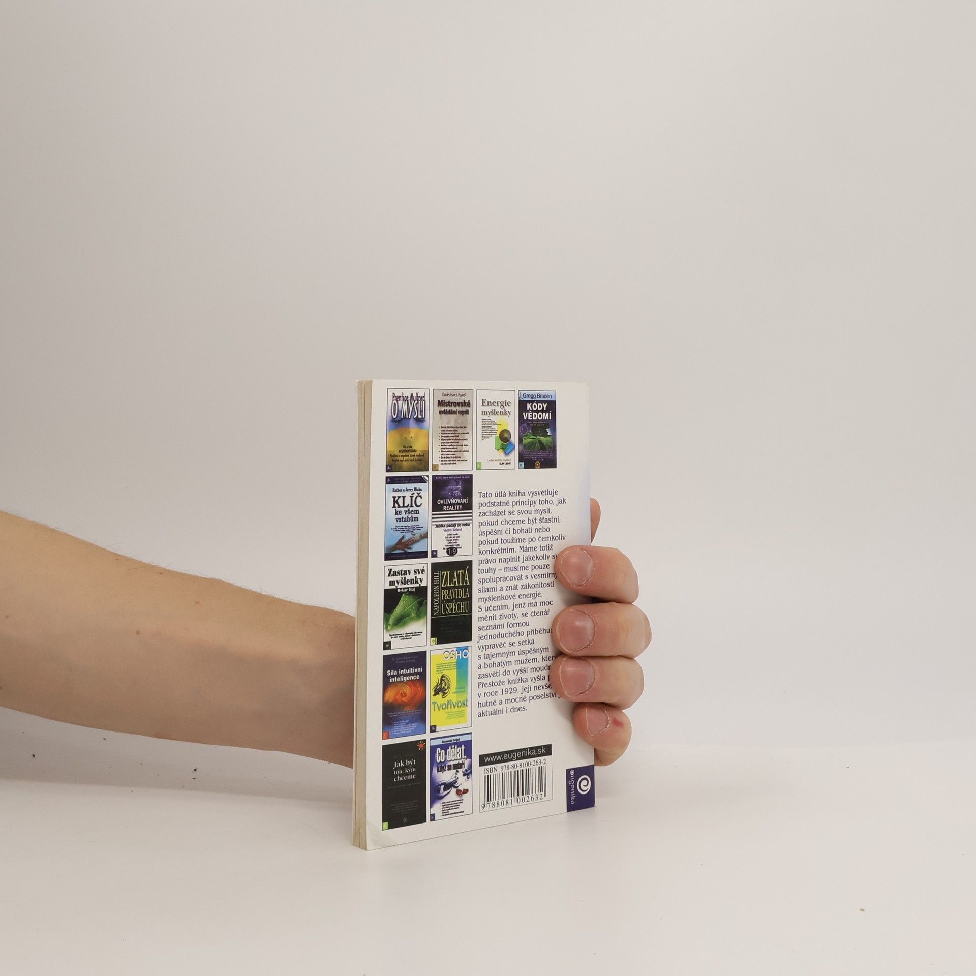 Tato útlá kniha vysvětluje podstatné principy toho, jak zacházet se svou myslí, pokud chceme být šťastní, úspěšní či bohatí nebo pokud toužíme po čemkoliv konkrétním. Máme totiž právo naplnit jakékoliv své touhy. Musíme pouze spolupracovat s vesmírnými silami a znát zákonitosti myšlenkové energie. S učením, jenž má moc měnit životy, se čtenář seznámí formou jednoduchého příběhu: vypravěč se setká s tajemným úspěšným a bohatým mužem, který ho zasvětí do vyšší moudrosti. Přestože knížka vyšla poprvé v r. 1929, její nevšedně hutné a mocné poselství je aktuální i dnes.