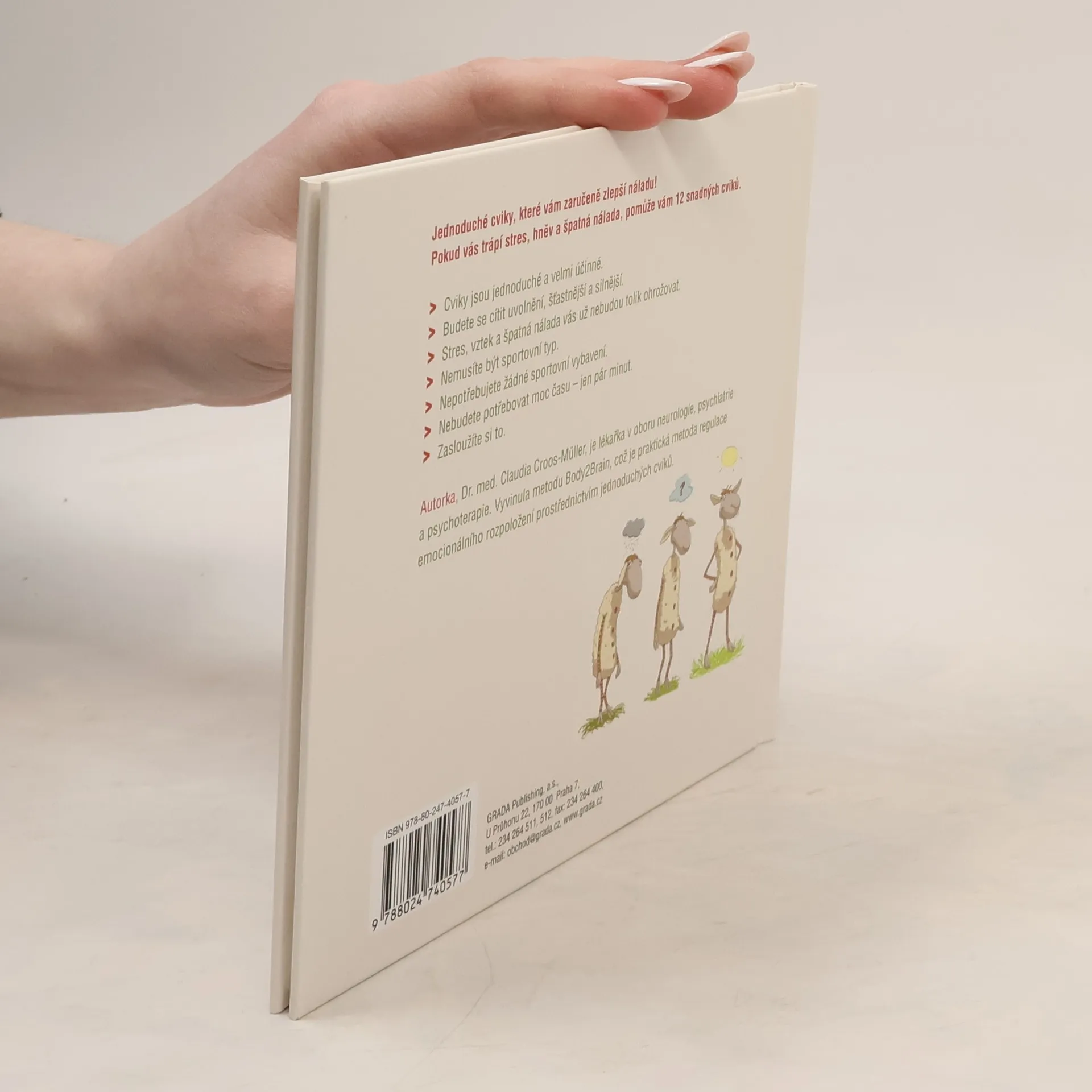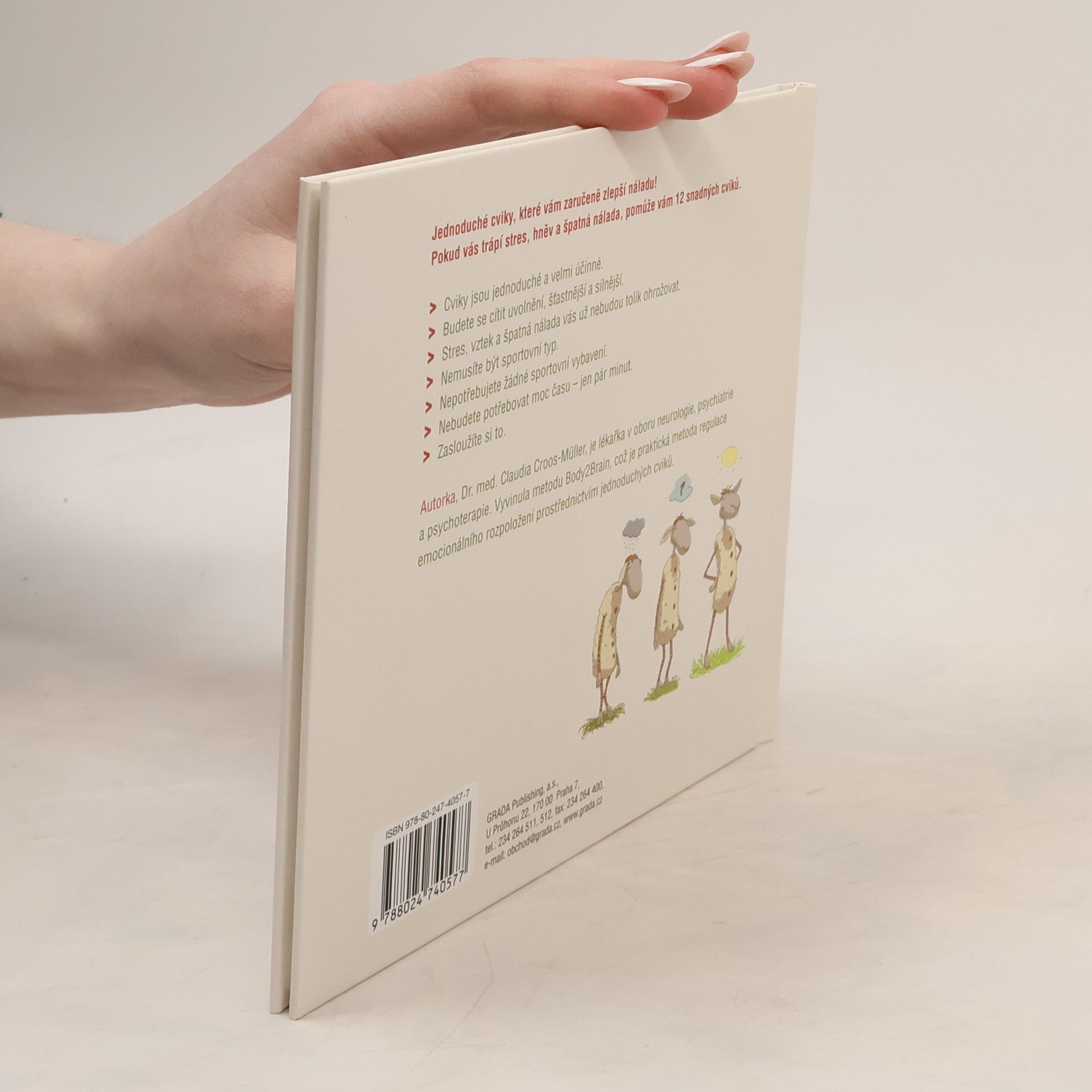 Tato kniha je určena všem, kdo bojují se špatnou náladou a stresem. Autorka vám ukáže, jak lze tyto nepříjemné pocity překonat velmi jednoduchými cviky - tak jednoduchými, že vůbec nemusíte být sportovní typ, abyste je zvládli. Nepotřebujete speciální oblečení, nepotřebujete permanentku do fitness centra, nepotřebujete si k tomu vyhradit čas - cvičíte jen tak mimochodem. Stačí vám ale jen malá chvilka a budete se cítit lépe. Na obrázcích vám Oscar - dobře naladěná ovečka - předvede 12 jednoduchých a účinných cviků které čtenářům jakéhokoliv věku pomohou překonat špatnou náladu a zároveň se i pobavit. Ovlivněte svůj nervový systém, provádějte stabilizační cvičení - budete mentálně i emocionálně zklinění, uvolnění a silní. Posilujte svou odolnost a svou dobrou náladu.