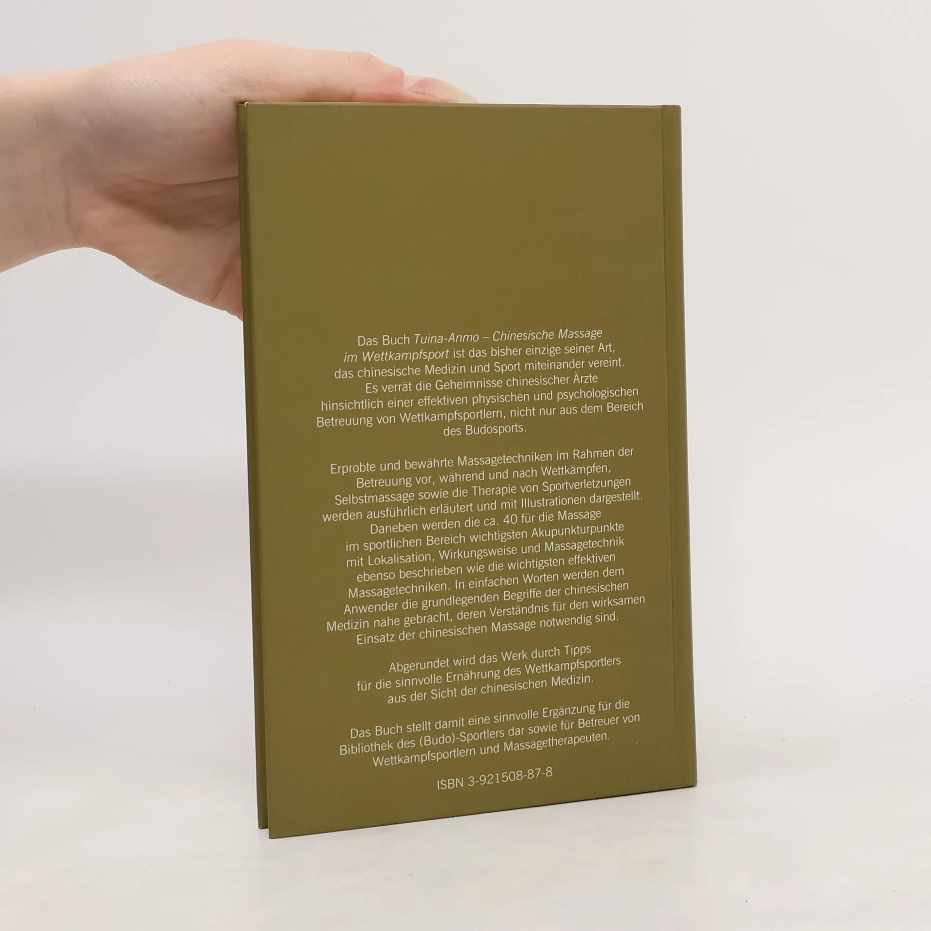 Die Geheimnisse chinesischer Ärzte hinsichtlich einer effektiven Betreuung von Wettkampfsportlern. Erprobte und bewährte Massagetechniken, Selbstmassage sowie die Therapie von Sportverletzungen werden ausführlich erläutert und illustriert. Daneben werden die für die Massage im sportlichen Bereich wichtigsten Akupunkturpunkte mit Lokalisation, Wirkungsweise und Massagetechnik beschrieben. Tipps für die Ernährung des Wettkampfsportlers aus Sicht der chinesischen Medizin ergänzen das Buch und machen es zu einem wertvollen Baustein für die Bibliothek des (Budo)-Sportlers sowie für Betreuer und Masseure.