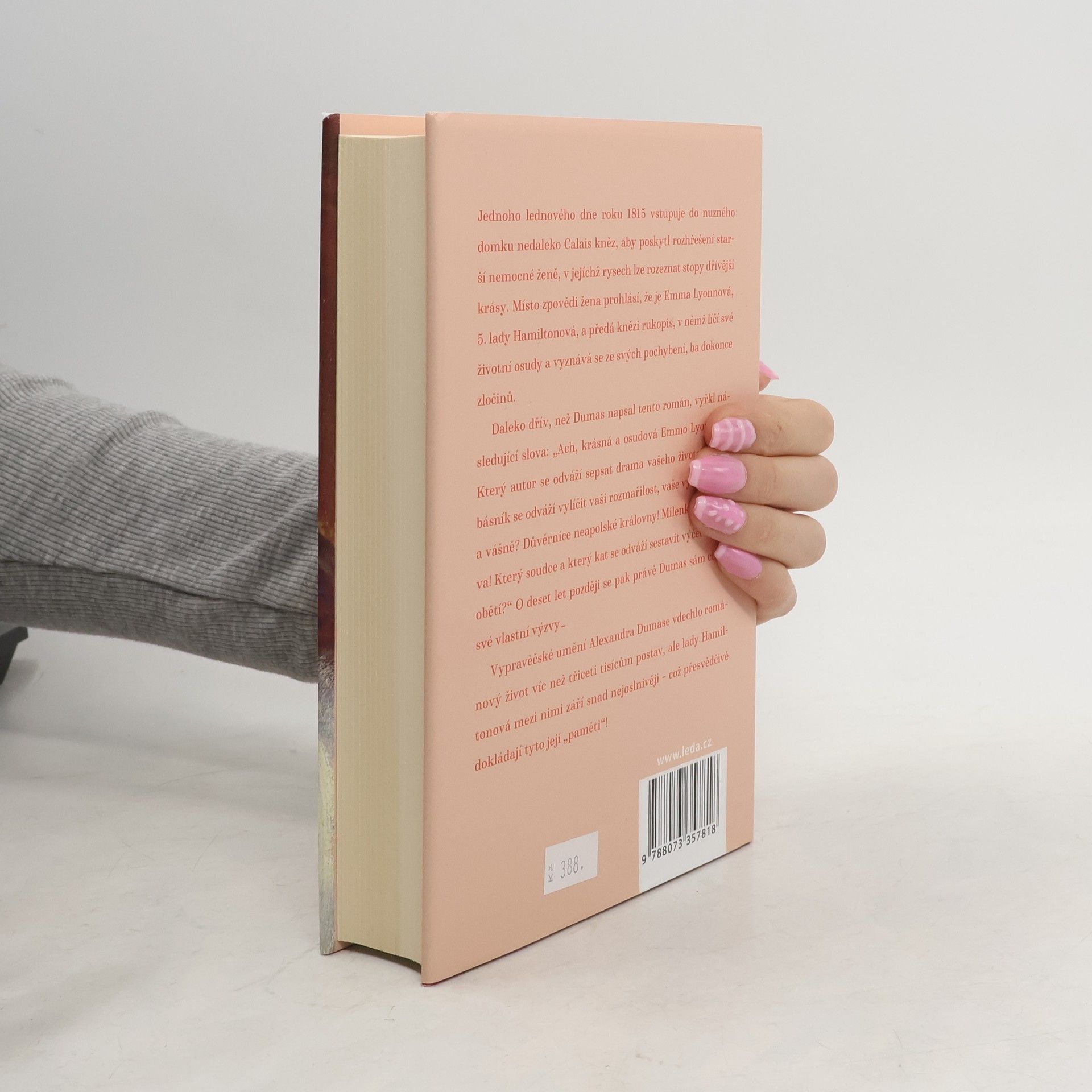 Jednoho lednového dne roku 1815 vstupuje do nuzného domku nedaleko Calais kněz, aby poskytl rozhřešení starší nemocné ženě, v jejíchž rysech lze rozeznat stopy dřívější krásy. Místo zpovědi žena prohlásí, že je Emma Lyonnová, 5. lady Hamiltonová, a předá knězi rukopis, v němž líčí své životní osudy a vyznává se ze svých pochybení, ba dokonce zločinů.Daleko dřív, než Dumas napsal tento román, vyřkl následující slova: „Ach, krásná a osudová Emmo Lyonnová! Který autor se odváží sepsat drama vašeho života? Který básník se odváží vylíčit vaši rozmařilost, vaše výstřednosti a vášně? Důvěrnice neapolské královny! Milenko Nelsonova! Který soudce a který kat se odváží sestavit výčet vašich obětí?“ O deset let později se pak právě Dumas sám chopí své vlastní výzvy…Vypravěčské umění Alexandra Dumase vdechlo románový život víc než třiceti tisícům postav, ale lady Hamiltonová mezi nimi září snad nejoslnivěji – což přesvědčivě dokládají tyto její „paměti“!