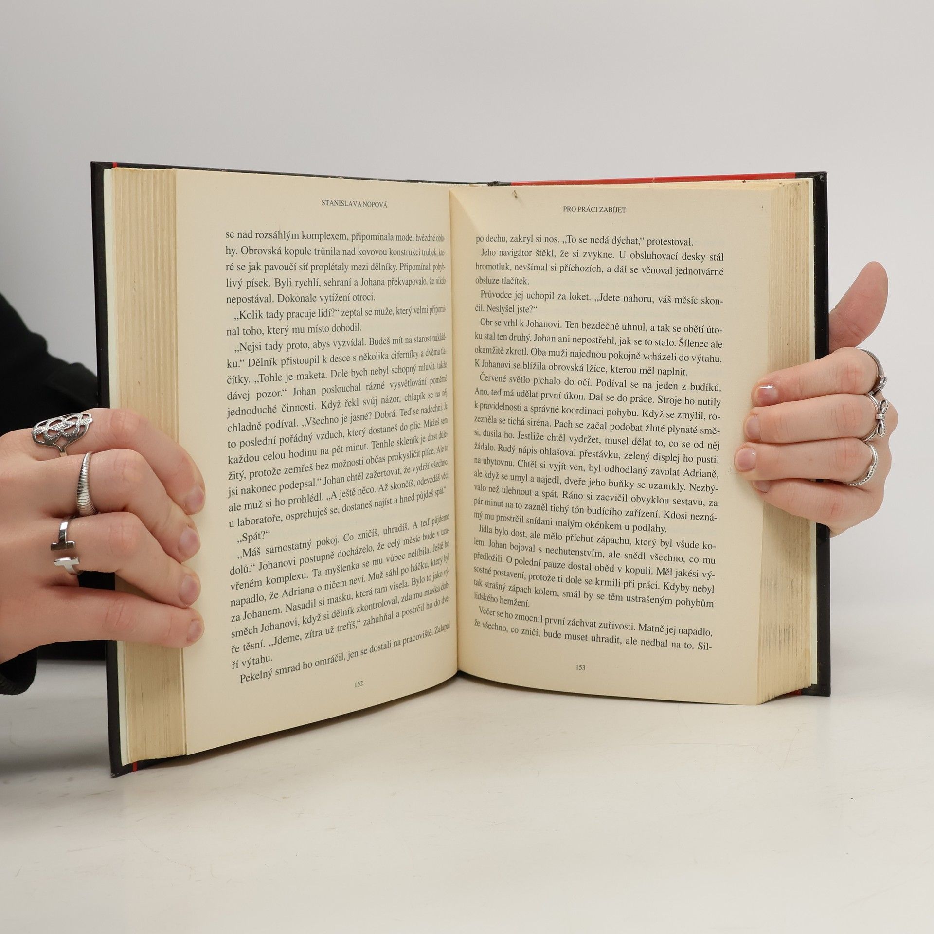 Děj knihy Stanislavy Nopové Pro práci zabíjet je situován do malé politicky nestabilní země. Před volbami slibují usměvaví kandidáti nulovou kriminalitu, prosperitu a sociální jistoty pro všechny. Zvítězí, ale po volbách je všechno jinak… Ruší se tisíce pracovních míst, mizí lidé, objevují se hromadné hroby. Nově vytvořený Ochranný program má být záchranou pro všechny, ale skutečnost je temná a nikdo se o skutečném poslání podivné organizace neodvažuje hovořit nahlas. Hlavní hrdina Johan se dlouho tváří, že se ho nová doba netýká. Dál cvičí, běhá, plave, pečuje o své dokonalé tělo jako dřív. Ale náhle je i on bez práce. Nejsou peníze, není na účty, není naděje, že se to změní a manželka Adriana je náročná a bezohledná. Johan obětuje dceru, zbaví se manželky, nedbá na přátele. Nebojuje s diktaturou, on chce přežít za každou cenu.
