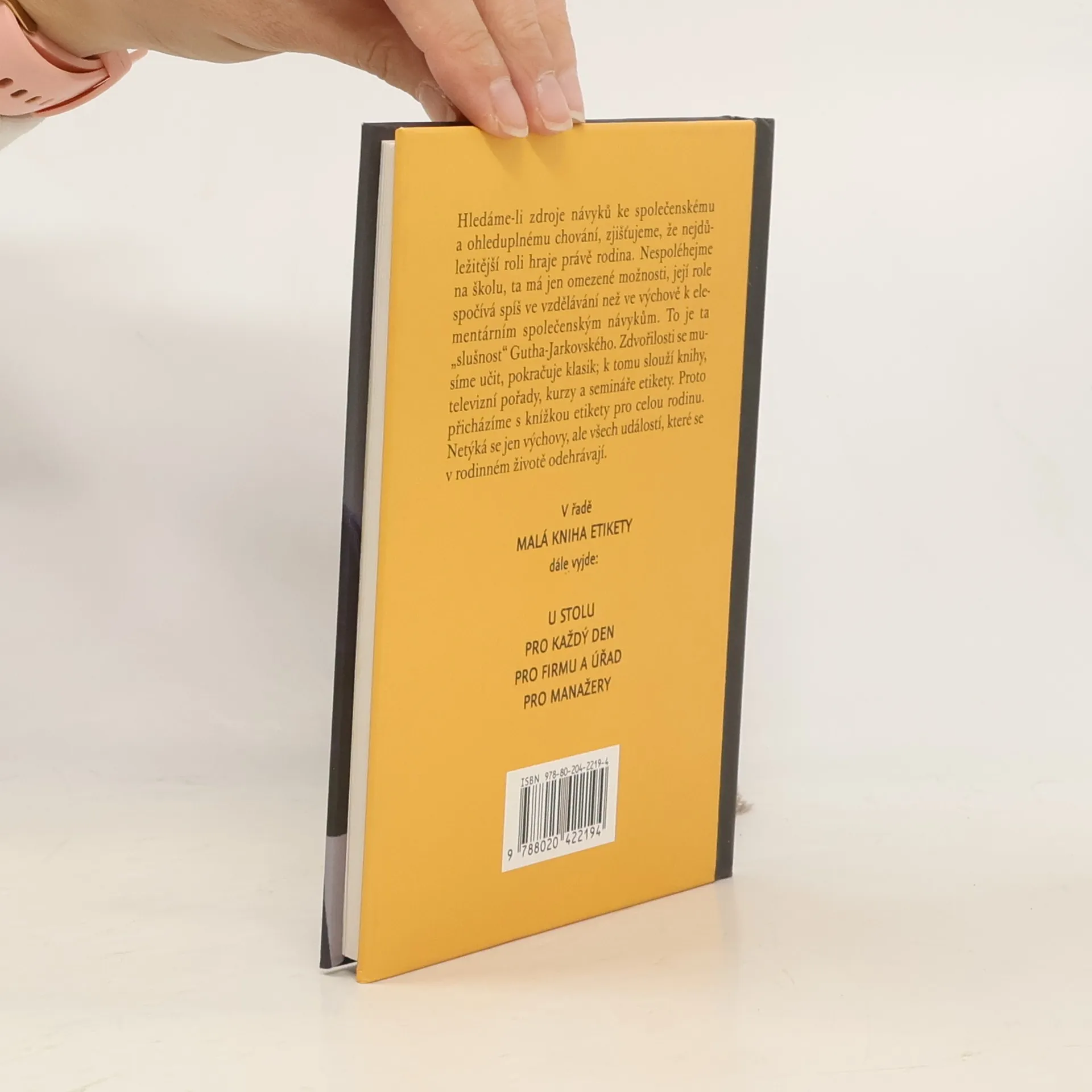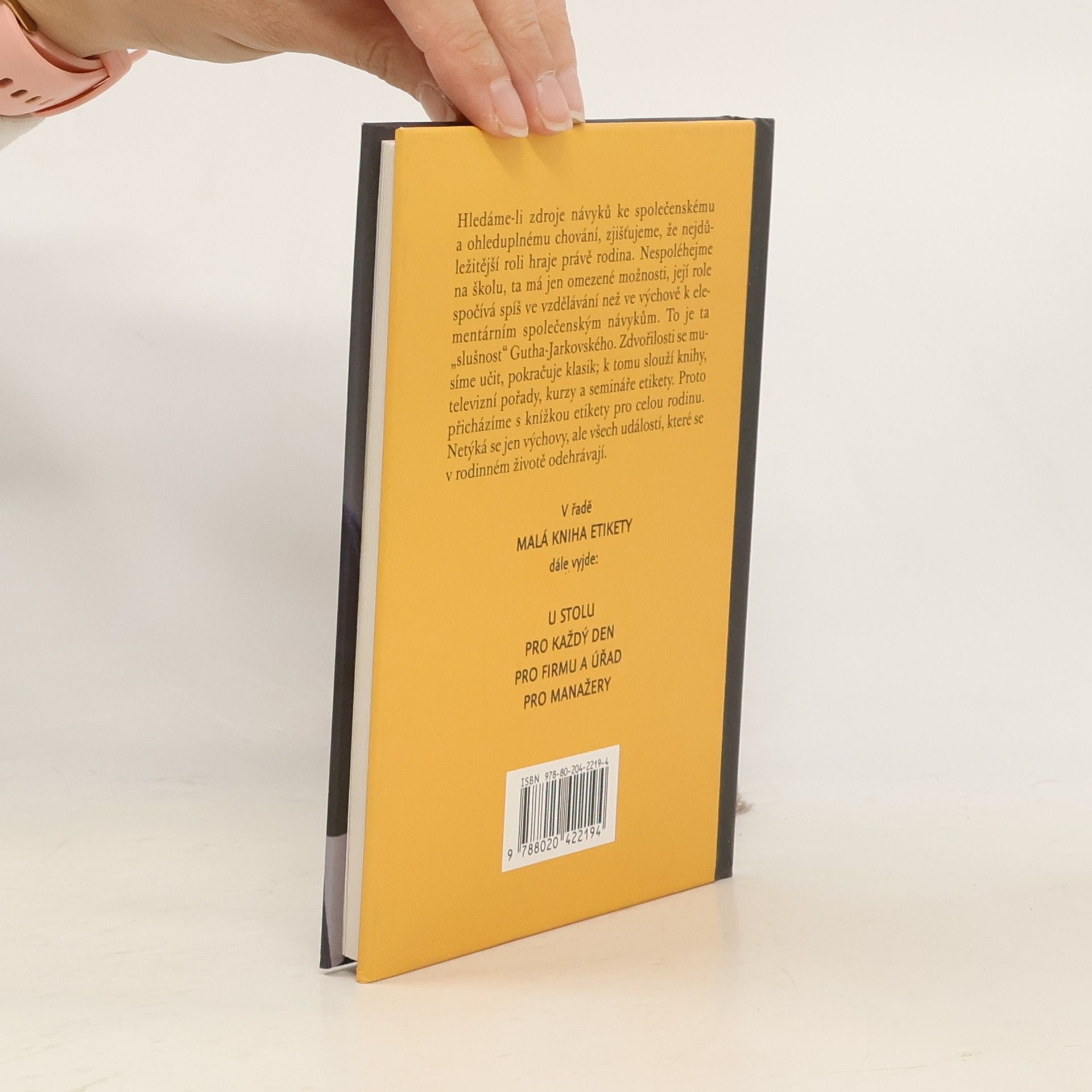 Ladislav Špaček je největší kapacitou v oboru. Po úspěšném přijetí Velké knihy etikety dopracoval nyní autor materiál, který specificky pokrývá potřeby jednotlivých cílových skupin. S většinou společenských situací se poprvé setkáváme v rodině - své děti učíme správnému stolování, většinou jdou s námi poprvé na návštěvu, do divadla nebo na koncert a účastí se rodinných oslav narozenin nebo svatby. Mezi lidmi, které známe a kteří nám jsou blízcí, se můžeme učit my i naše děti společenskému chování bez zbytečné nervozity. V knize Ladislava Špačka najdete všechny důležité události, s nimiž se v rodině můžete setkat.