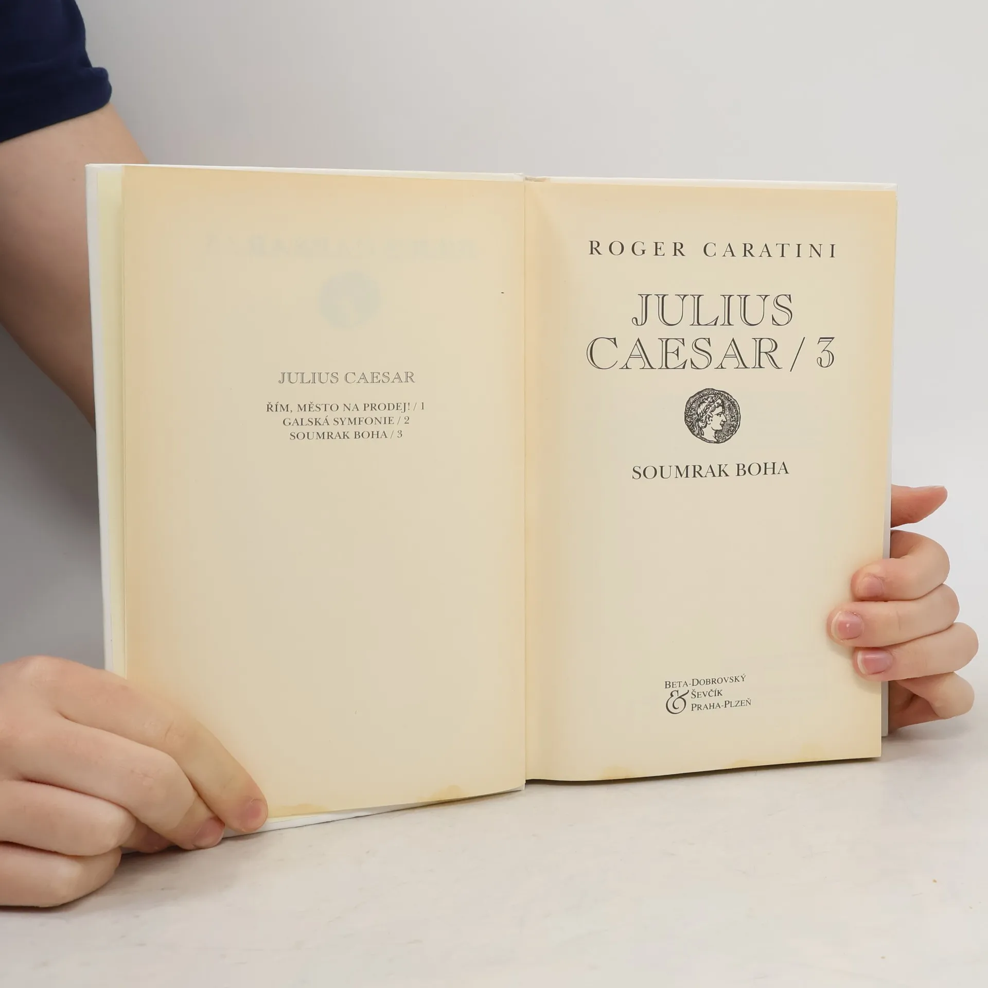 Podtitul: Soumrak boha Závěrečná část historické trilogie o životě římského vojevůdce, státníka a spisovatele se odehrává v letech 52-44 před Kristem. Prokonzul Gaius Julius Caesar obnoví po porážce vzbouřených Bellovaků pořádek v Galii. Všechny kmeny, připojené k mírovým smlouvám, sjednotí v jednu provincii pod nadvládou Říma. Po smrti Crassa se triumvirát rozpadl a Pompeius se snaží s pomocí senátorů soustředit veškerou moc do svých rukou. Mezi Caesarem, který odmítne rozpustit své legie a vydává se v jejich čele do Říma, a jeho bývalým spojencem a přítelem, se rozpoutá občanská válka. K jejich rozhodujícímu střetnutí dojde na území Řecka v bitvě u Farsalu. Pompeius uprchne do Egypta, kde je zavražděn. Caesar zde vojensky zasáhne do mocenských bojů a po skončení alexandrijské války dosadí na trůn Kleopatru. Podaří se mu potlačit povstání pontského krále Farnaka a zvítězí i v severní Africe nad posledními přívrženci Pompeia. Po triumfálním návratu do Říma má jako konzul, tribun a doživotní diktátor jedinečnou možnost uskutečnit své záměry. V březnu roku 44 před Kristem je však během zasedání senátu, kde má být prohlášen králem, zavražděn zastánci republiky.