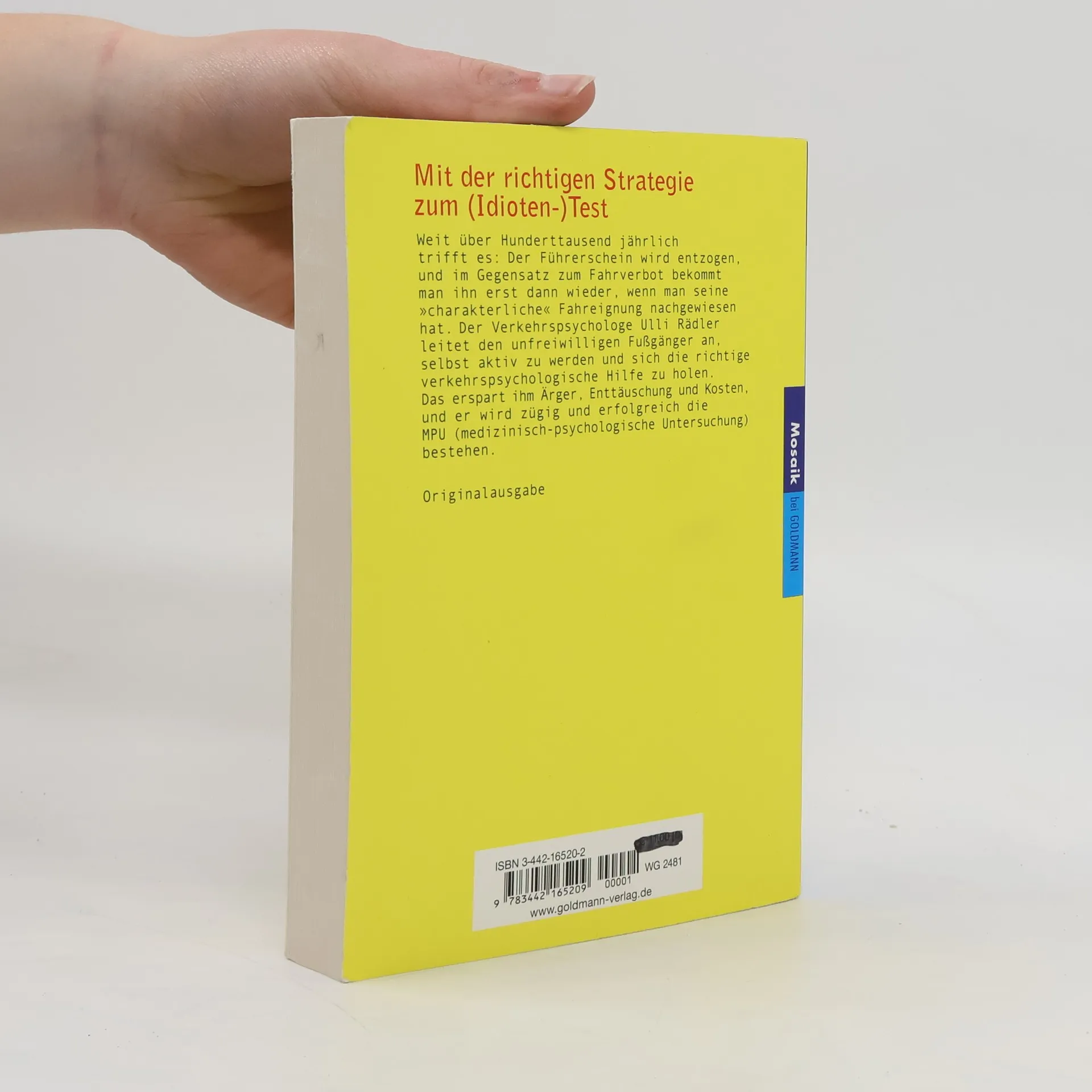 Wer seinen Führerschein verliert - es sind 120000 Betroffene jährlich -, muss sich nach einer Sperrfrist einer Fahreignungsbegutachtung, im Volksmund "Idiotentest" genannt, unterziehen. Ulli Rädler leitet den Leser an, aktiv zu werden und sich die richtige verkehrspsychologische Hilfe zu holen. Das erspart dem unfreiwilligen Fußgänger Ärger, Enttäuschung und Kosten, und er kann zügig und erfolgreich die MPU (medizinisch-psychologische Untersuchung) ablegen. Angehörige von unfreiwilligen Fußgängern werden aufatmen, wenn diese statt lästiger Transportwünsche, Nörgelei und "Jetzt-erst-recht-Saufgelagen" die effiziente Selbsthilfe für sich entdecken. Der Autor
